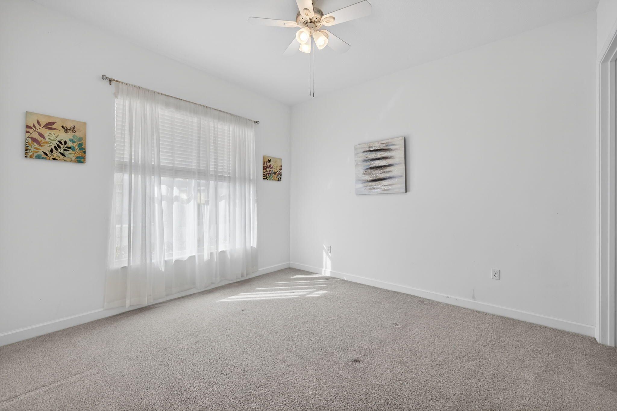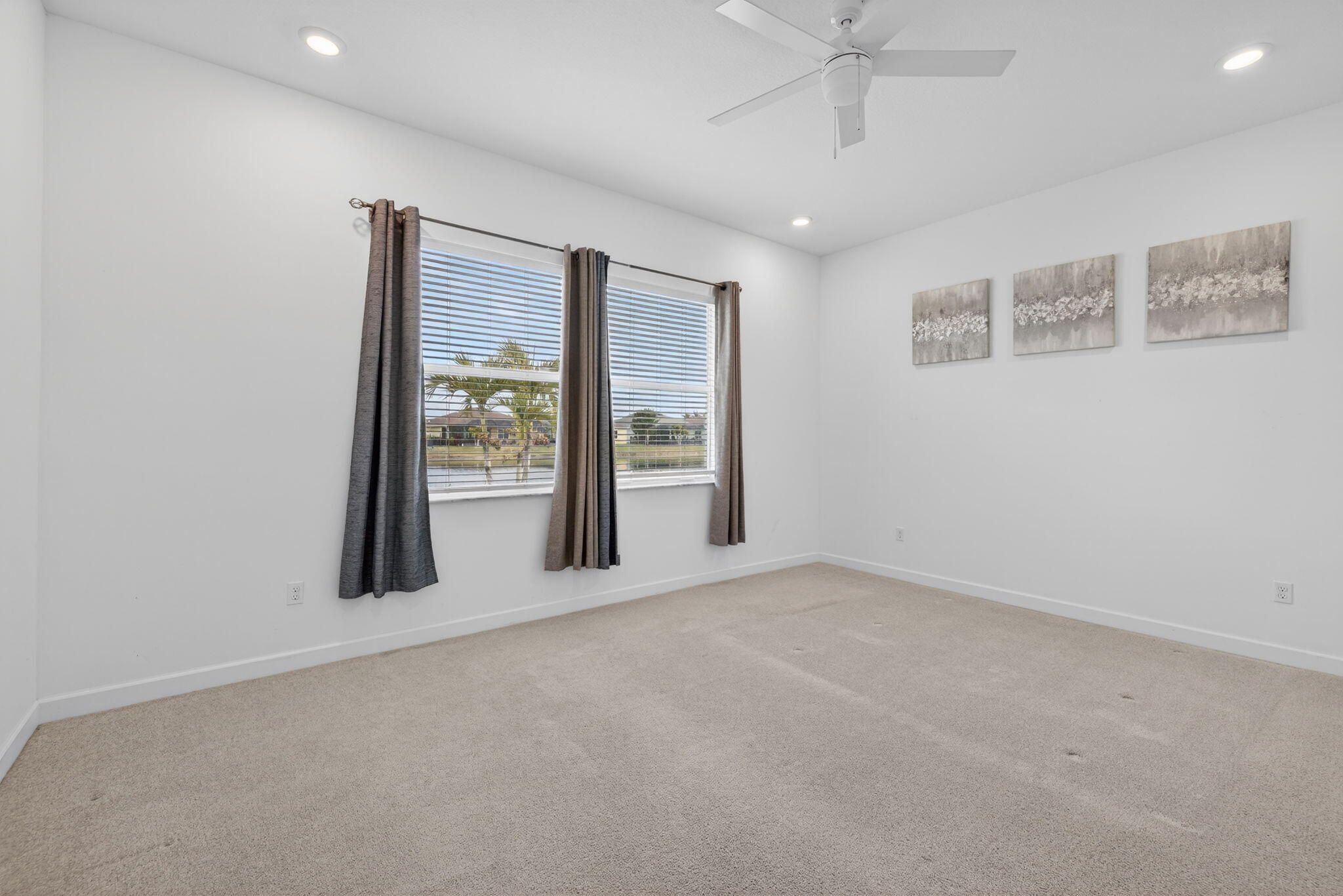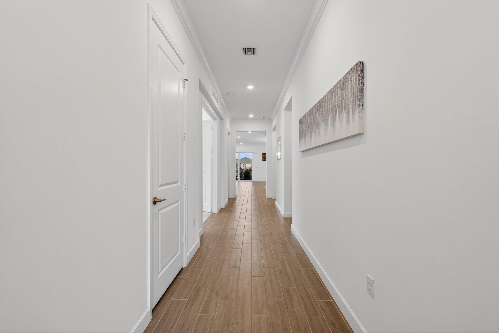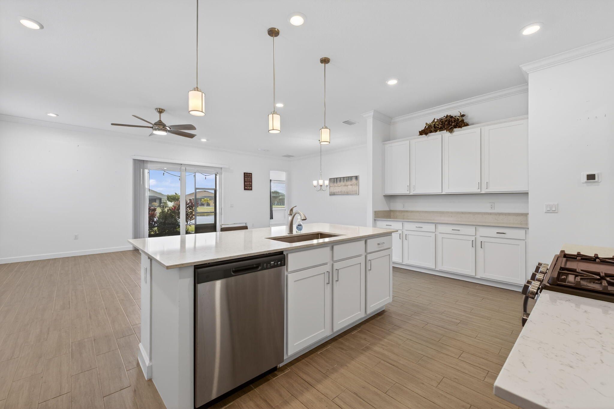 Refined lakefront living awaits in this beautifully upgraded single-story residence with expansive, tranquil water views in gated Veranda Preserve. This light-filled home offers 3 bedrooms, 3.5 baths, plus a private office or optional 4th bedroom, all arranged in a desirable split floor plan. The open-concept design features an elegant kitchen with oversized island, abundant cabinetry, walk-in pantry, and inviting dining space ideal for entertaining. The owner's suite is a true retreat with dual vanities, a spa-inspired bath, and an oversized walk-in closet. Enjoy peaceful mornings on the screened, covered lanai overlooking the lake. Situated in an active 55+ community with resort-style amenities and close to Tradition shopping, dining, and activities.