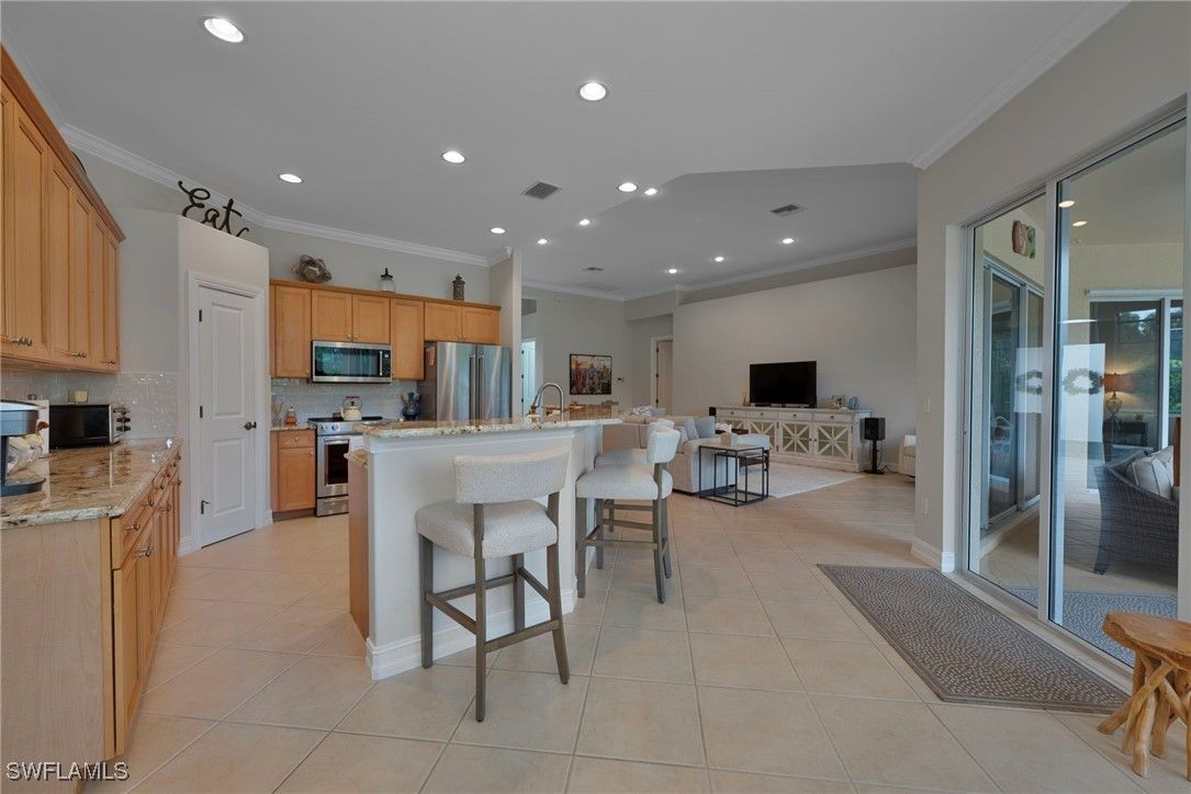 Welcome to this immaculate 3 bedroom, 2 bathroom single-family home located in the private, gated community of Prestwick Place at Lely Resort. This spacious, open-concept home offers beautiful golf course views and a bright, inviting atmosphere throughout. The upgraded kitchen features new appliances, countertops, and backsplash, along with a walk-in pantry and crown molding accents. Step outside to your private screened-in lanai with a sparkling pool and spa—perfect for relaxing or entertaining. The primary suite offers private access to the pool, large closets, and an elegant bath with glass shower doors. Additional features include a 2-car garage and no flood zone location. Enjoy exclusive access to The Player’s Club & Spa, featuring a 15-acre clubhouse, two resort-style pools with cabanas, lap pool, full fitness center with classes, tennis, pickleball, bocce, and exceptional dining options. Lely Resort also boasts three championship golf courses—one private and two public. All this just minutes from Naples and Marco Island beaches, 5th Avenue shopping and dining, and all the best Southwest Florida has to offer!