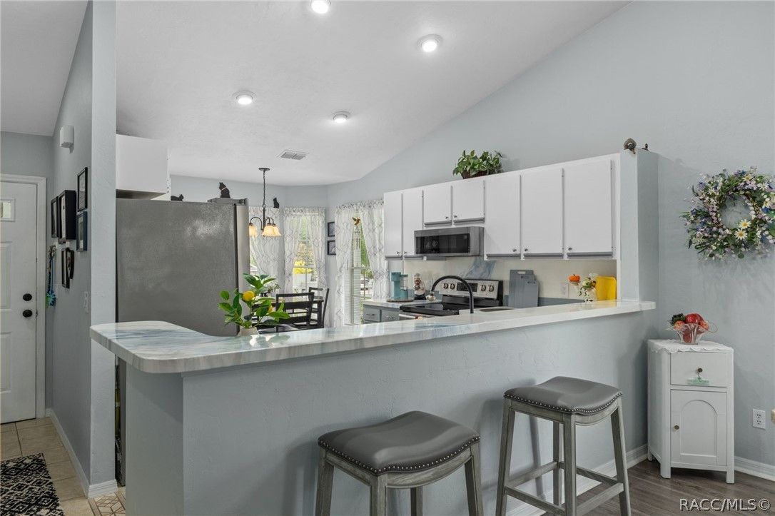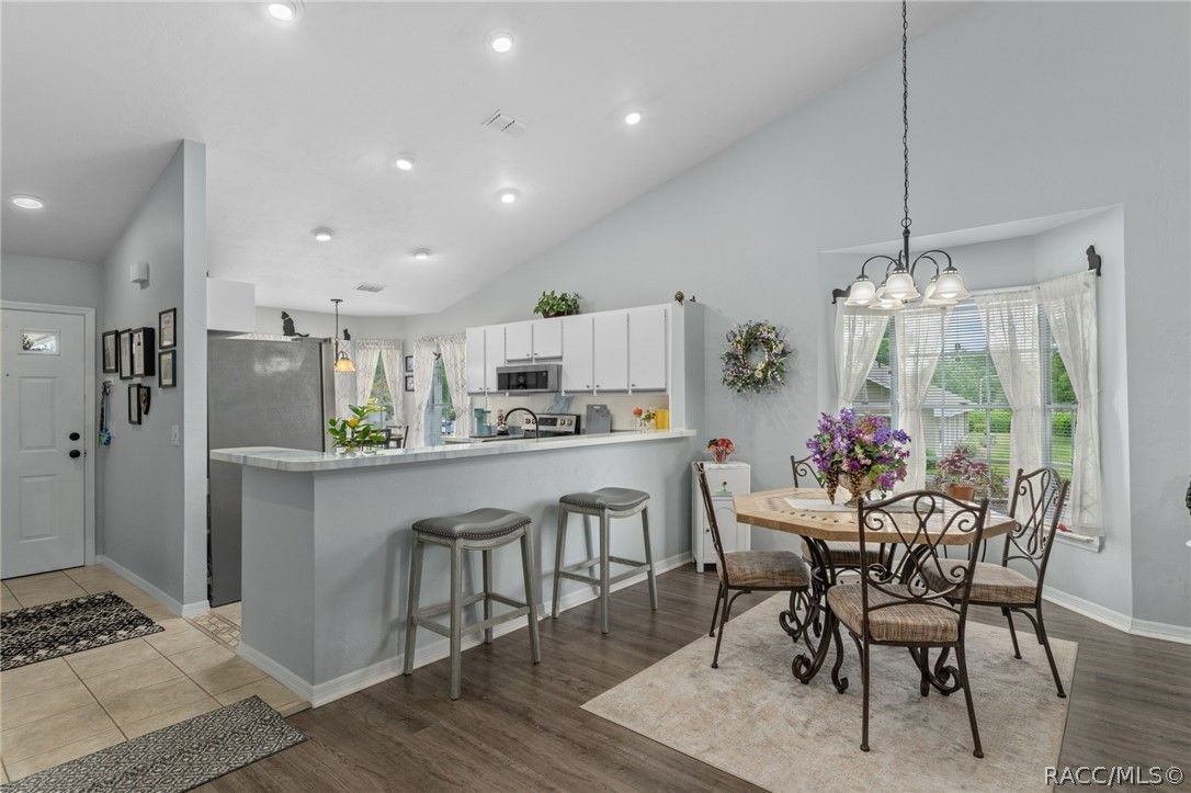 - Breakfast Bar, Dual Sinks, Eat-in Kitchen, High Ceilings, Laminate Counters, Primary Suite, Split Bedrooms, Separate Shower, Vaulted Ceiling(s), Walk-In Closet(s), Window Treatments, First Floor Entry
