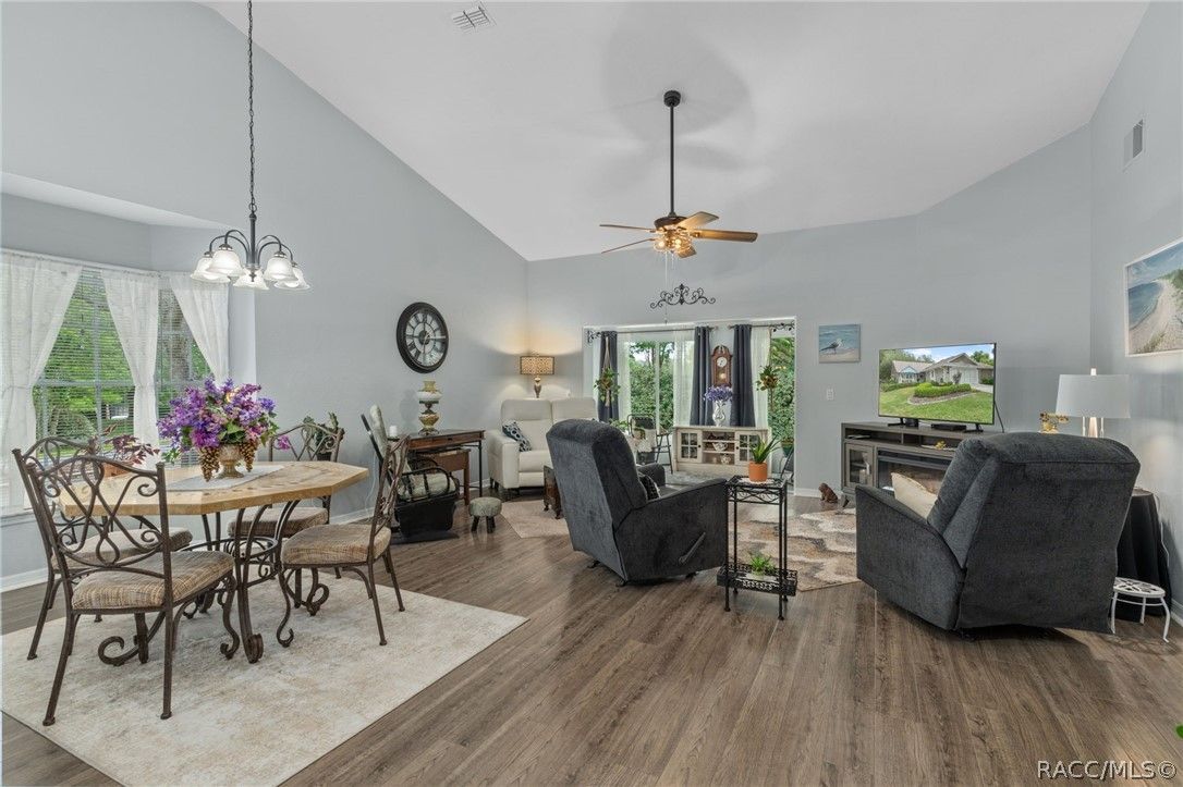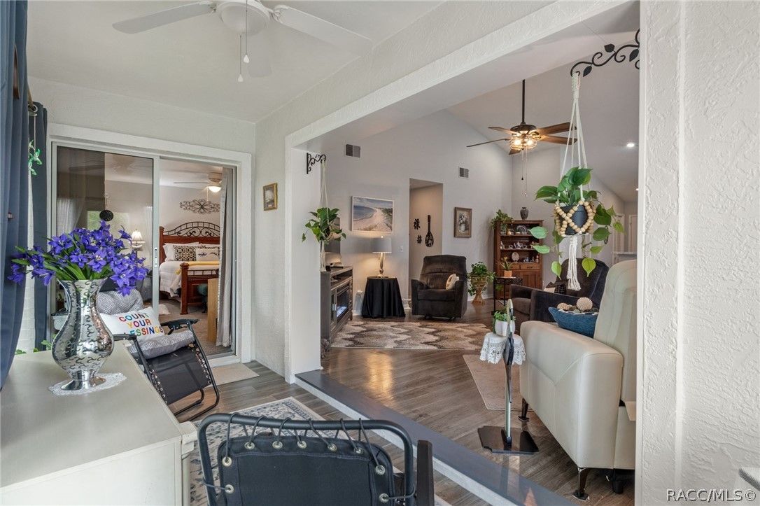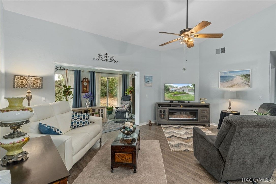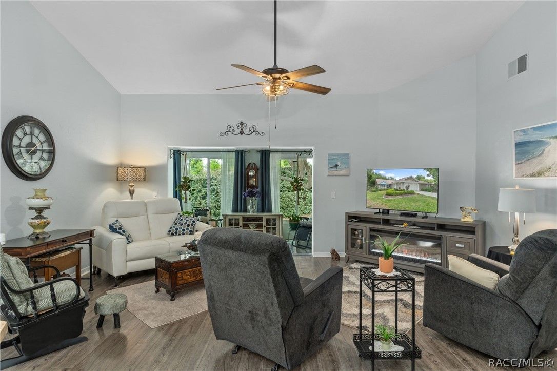 Every pretty lady deserves to be on a pedestal! This little GEM has that rare seat at the entrance of the village, on an elevated lot and seems to relish her duty of welcoming residents & guests to the neighborhood. Sweet little pops of color in the landscaping w/a charming front porch to read a book and sip your morning coffee! Step inside for a warm hug and enjoy the vaulted ceiling in the extremely popular Fairmont Vlg. open floor plan. Beautifully maintained home has been tastefully updated for you to call it HOME! Neutral paint, trendy laminate flooring and new carpet in the bedrooms are just a few of the updates. New Refrigerator, Dishwasher and updated light fixtures. Serene and spacious primary Bedroom with a gorgeous newly remodeled primary bath. Sweet Guest Bedroom at front of the villa w/it's own ensuite bath! Rare find glassed in rear porch (currently purposed as a small Den) with lovely back yard views & access. Garage Door Screens for venting of the garage without the bugs! Updated Electrical Panel. This one may well be THE ONE that you've been waiting for! Call today to preview!