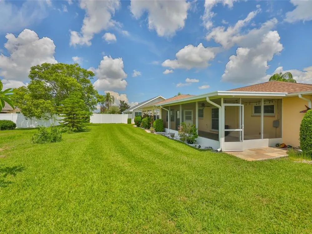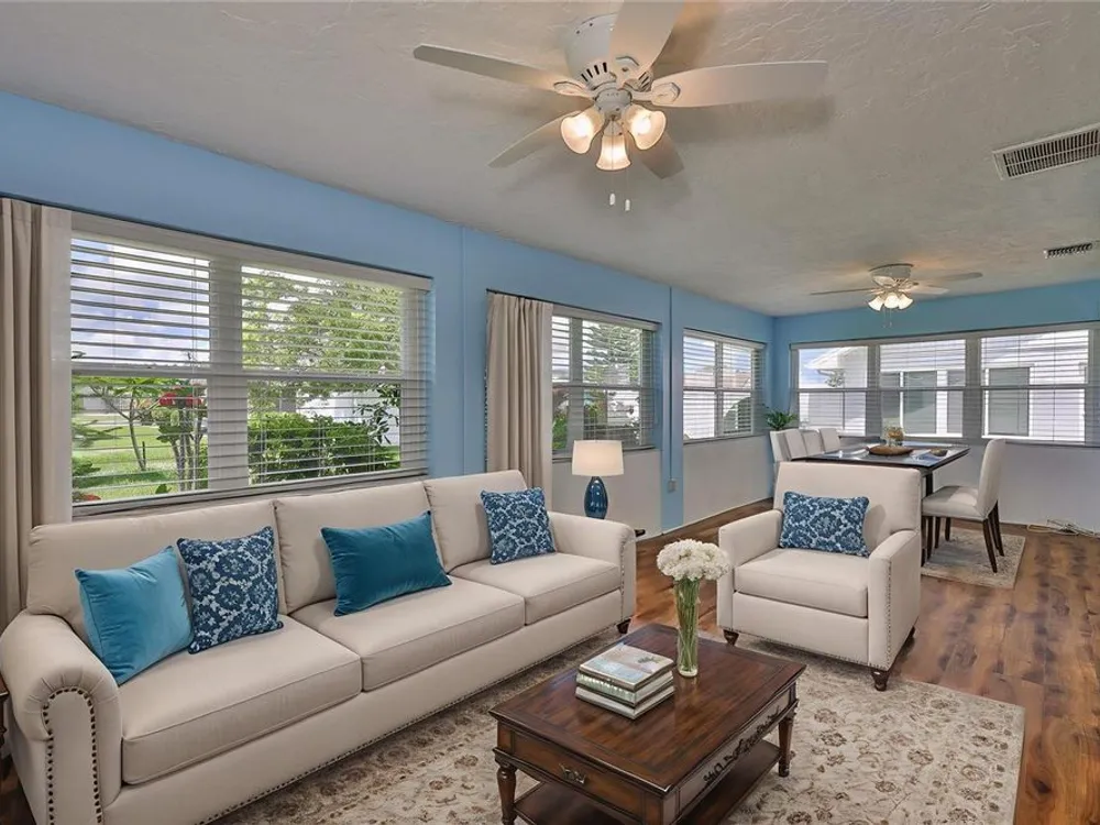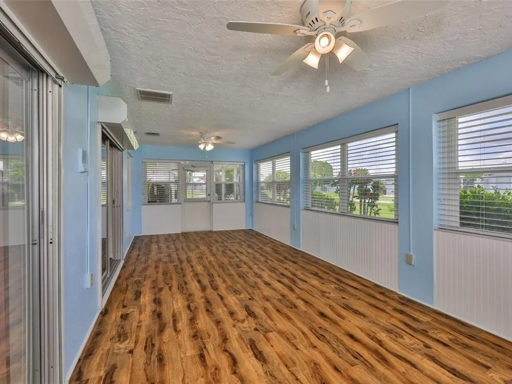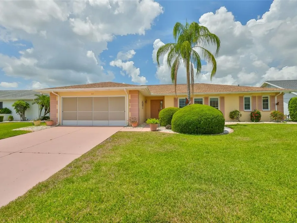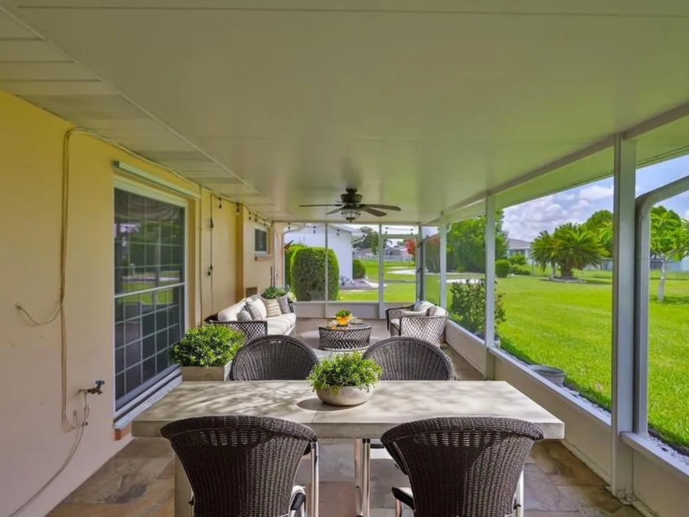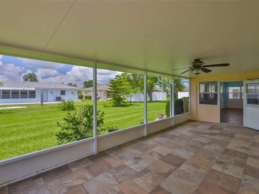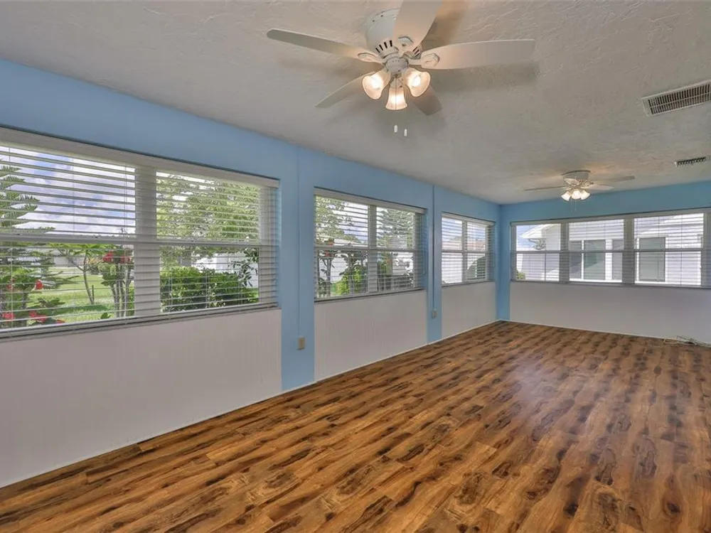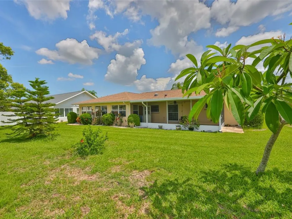 One or more photo(s) has been virtually staged. ROOF 2023, A/C 2023. This beautifully designed home features two bedrooms, two bathrooms, a versatile office or den, a spacious Florida room with A/C, and a screened-in lanai. The custom-built split-bedroom floor plan is light, bright, and thoughtfully laid out. There's no carpet; only easy-to-maintain luxury vinyl tile, wood, and ceramic flooring are used throughout. The large kitchen boasts newer appliances, CORIAN countertops, abundant cabinetry, a pantry, an eat-in area, a skylight, and an opening to the Florida room. A separate living area provides additional space for relaxing or entertaining, plus a separate dining area for those more formal occasions. The primary bedroom offers sliding doors to the Florida room, two walk-in closets, two standard closets, and an ensuite bathroom with dual sinks and a spacious glass walk-in shower. The second bedroom also features its own updated full bath with another large glass walk-in shower. A bonus room can be used as a third bedroom, home office, craft room, or den. Enjoy the expansive Florida room filled with natural light, and then step outside to the screened-in lanai, perfect for indoor-outdoor living. There's always something to do here! With over 200 clubs and activities, you'll find everything from painting and pottery to woodworking, dancing, knitting, pickleball, lawn bowling, and more. You'll also have access to indoor and outdoor pools, fitness classes, a top-notch gym, and tons of volunteer opportunities. Great location close to beaches, shopping, dining, theme parks, sports events, and Tampa Airport, everything you need is just a short drive away.