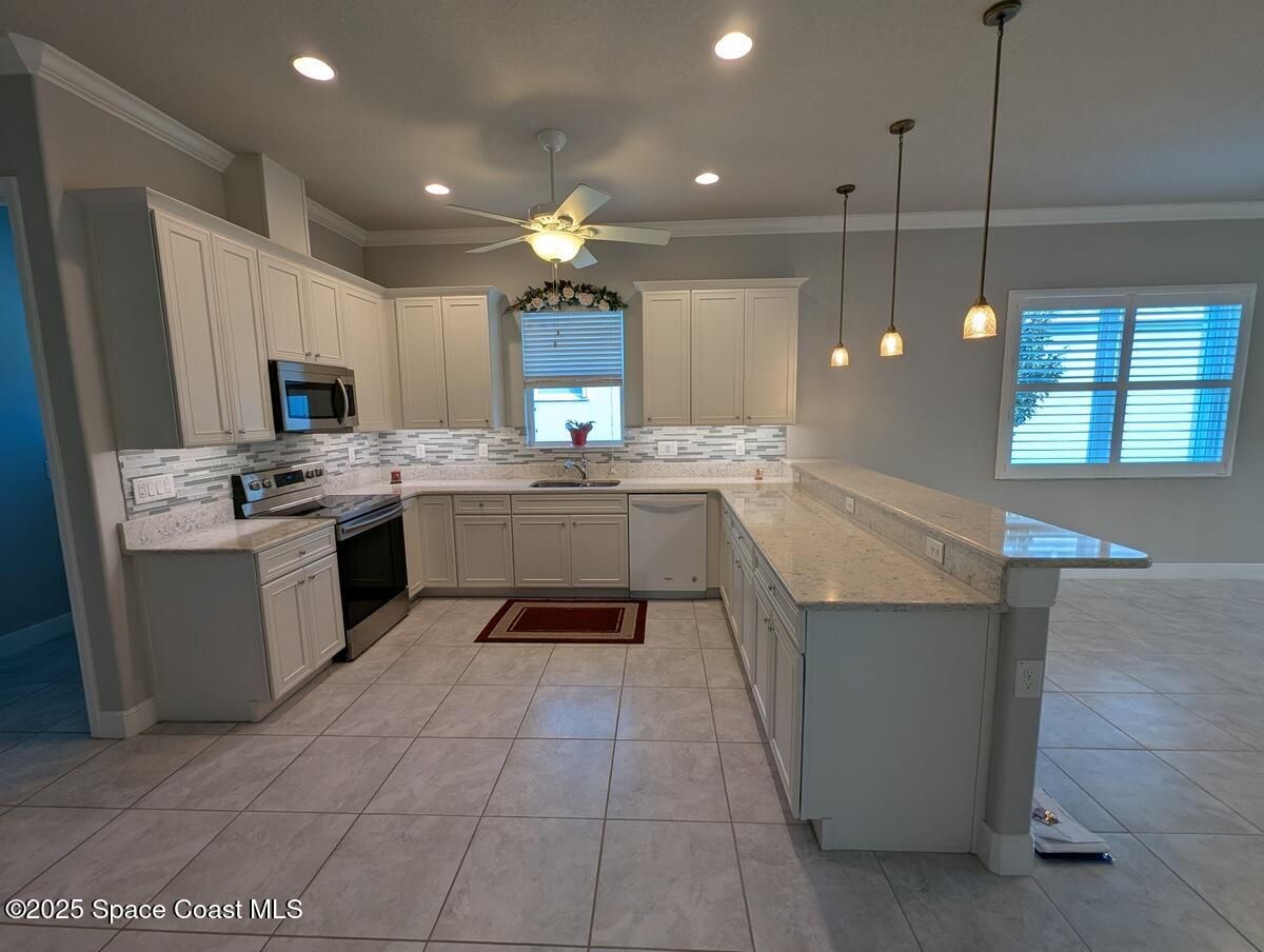 Don't miss this fantastic home in a gated senior community which is located just minutes from hundreds of restaurants and stores in Melbourne. From the time this home was built, it had that little something extra. It's elegant features are sure to please the most discriminating buyers. High end finishes throughout including beautiful tile floors in the living and wet areas, LVP flooring in the bedrooms. Kitchen features include maple cabinetry with 42 inch uppers, with crown moldings, half bull nosed quartz counter tops, tiled backsplash, under cabinet lighting, slow close drawers and doors, and an oversized walk-in pantry as well. All interior doors are 8 feet, and 10 foot ceilings for grand feeling. Bathroom cabinets and counters match the kitchen for design continuity. Primary suite has 2 large walk-in closets, beautiful dual sink vanity, and extra large walk-in tiled shower. Hurricane shutters, metal roof, and a whole house generator make this a safe haven in any storm!!