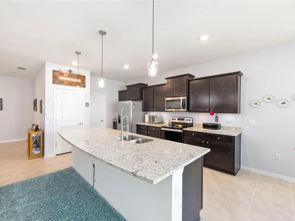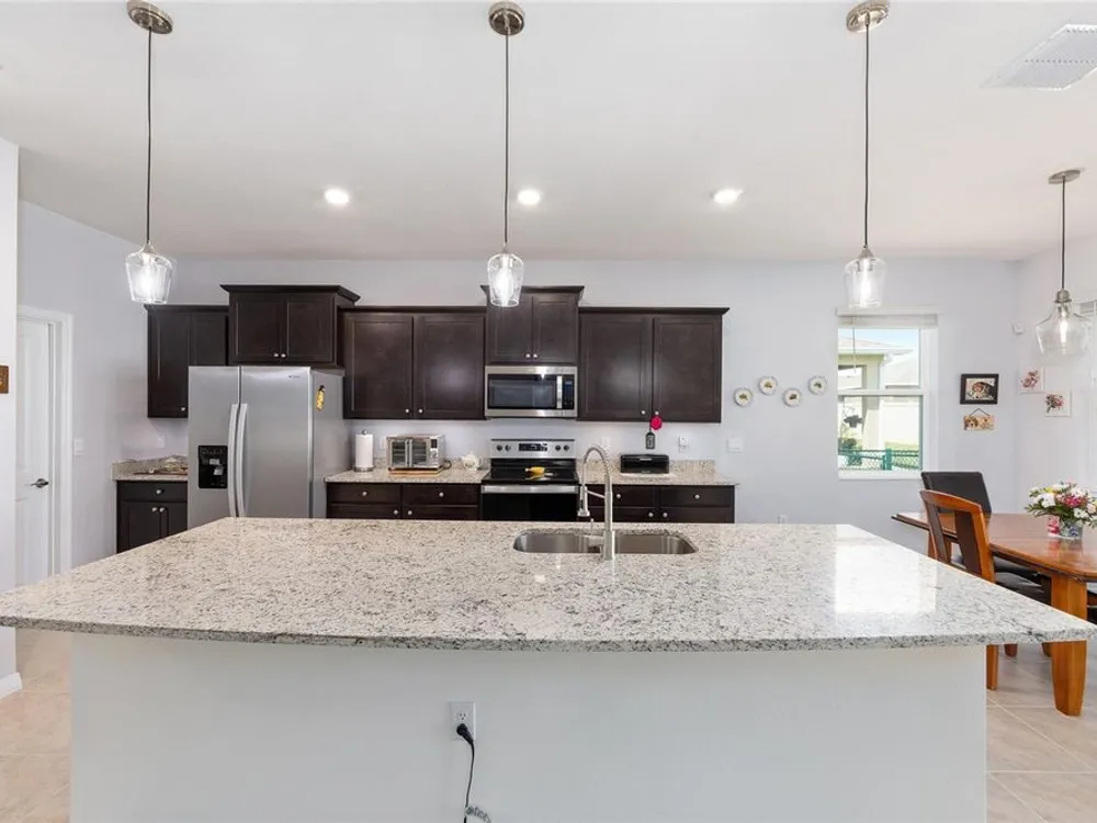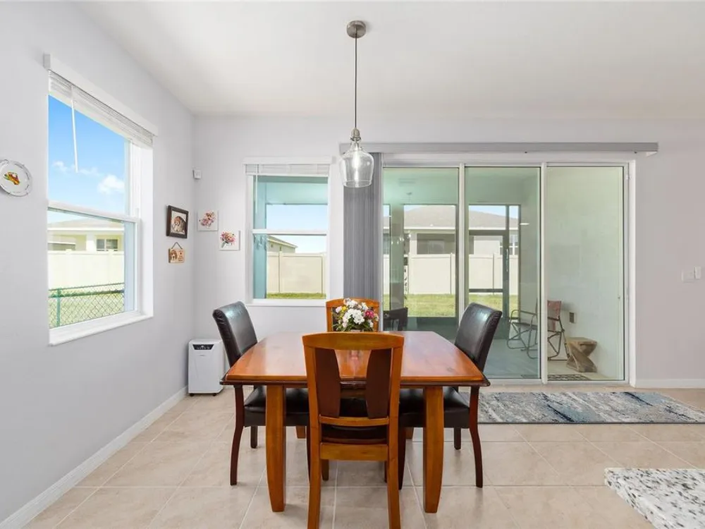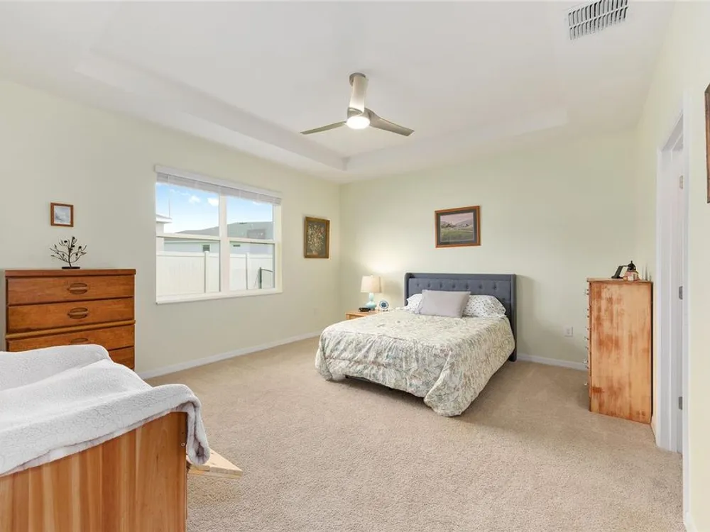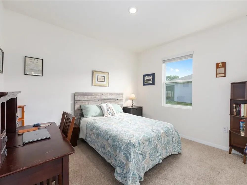 This 2024 home is better than new! Why wait when this has MORE than what you have been looking for. Important features already in place: fully fenced, screen enclosed lanai, window treatments, finished window sills, refrigerator, washer and dryer. And the upgrades include pendant lighting, remote controlled ceiling fans, and the interior paint finish. Open concept split plan with 3 true bedrooms. Your kitchen boasts stone countertops with a double undermounted sink, an island for additional counter space and cabinets, and a closet pantry. The pendant kitchen lighting adds that special touch. There is plenty of space to entertain with a dining area, breakfast nook, large island, and triple sliding glass doors that lead to your screen enclosed lanai. Open the sliders for that refreshing breeze to fill your home and bring the outside in. Tile throughout the living areas. Your primary bedroom features a tray ceiling, walk in closet, and remote controlled ceiling fan with light. The luxurious primary bathroom has stone countertops, 2 undermounted sinks, a tiled step in shower, a bathtub, and a separate water closet. On the other side of your home are 2 guest bedrooms, and a guest bathroom with pendant lighting, tub/shower combo, stone countertop, and undermounted sink. The laundry room has a closet for extra storage space, and the washer and dryer are included. Lawn maintenance is included in the $215/month HOA fee. JB Ranch is a gated community with a resort style pool, pickleball court, bocce ball, a fitness center, while less than 1 mile to grocery shopping. This home comes complete with a smart home package. Transferrable termite bond in place, and survey available to buyer. The property information provided is deemed to be true and correct, however, the accuracy of the information is not guaranteed.
