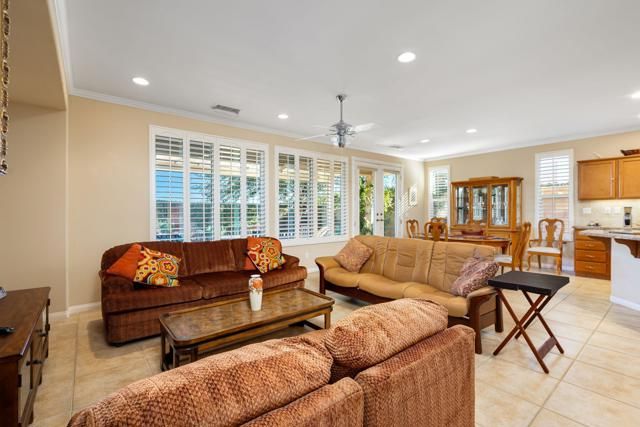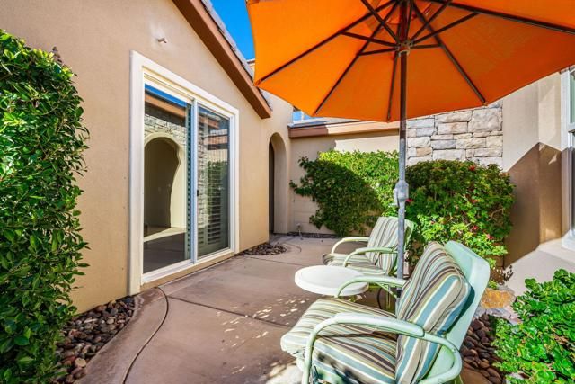 The Trilogy Monterey model with 1,965 SQ FT, 3-BD, 3-BA, plus den/office and private courtyard with detached Casita, is among the most favored of Trilogy homes, and, this one with a private backyard, firepit, soothing water feature, and Chocolate Mountain views is a winner. For added value, the home is within walking distance to the Trilogy Clubhouse, pools, and sports complex. Enter through a tall arched wooden door into a private courtyard and lovely sitting area. Guests will love the privacy of the roomy detached Casita with kitchenette area and full bath. Once in the home, you'll welcome the airiness of the open concept floor plan, the nine-foot ceilings with crown molding, large tile floors, and windows with custom plantation shutters that overlook the outdoor covered patio, lush green mature landscape, and mountains. The great room features a wide inset large enough to accommodate a theater sized television or any variation of entertainment that fits your personal lifestyle. The kitchen is spacious and a delight to cook in and entertain. An abundance of quality wood cabinets with hardware and bottom cabinets with pull-outs for pots and pans offers plenty of storage space. The pantry keeps your food fare and cooking ingredients close at hand. Wraparound counters and a grand center island are topped with smooth slab granite. Stainless appliances include, a double-oven, gas cooktop, microwave, refrigerator, and dishwasher making cooking and entertaining a breeze. The kitchen center island with counter seating is open to the great room and dining areas keeping you engaged with family and friends while cooking up your favorite dishes. The dining area is roomy with French doors that open to the patio for ease of indoor and outdoor dining and entertaining. The primary bedroom suite is spacious with windows and plantation shutters open to the private backyard. The bath features dual vanities with slab granite, a large walk-in shower with tile surround, linen-closet, and a walk-in closet large enough for even the most avid fashionistas. The den/office to the right of the foyer is the perfect flex space, changing as your lifestyle needs change. The room is bright with windows that open to the private courtyard. The third guest bedroom in the main home is roomy with a mirrored closet and is located next to a full guest bath. The laundry room features cabinets, washer, dryer and deep sink with a granite countertop. The garage fits 2 cars and golf cart