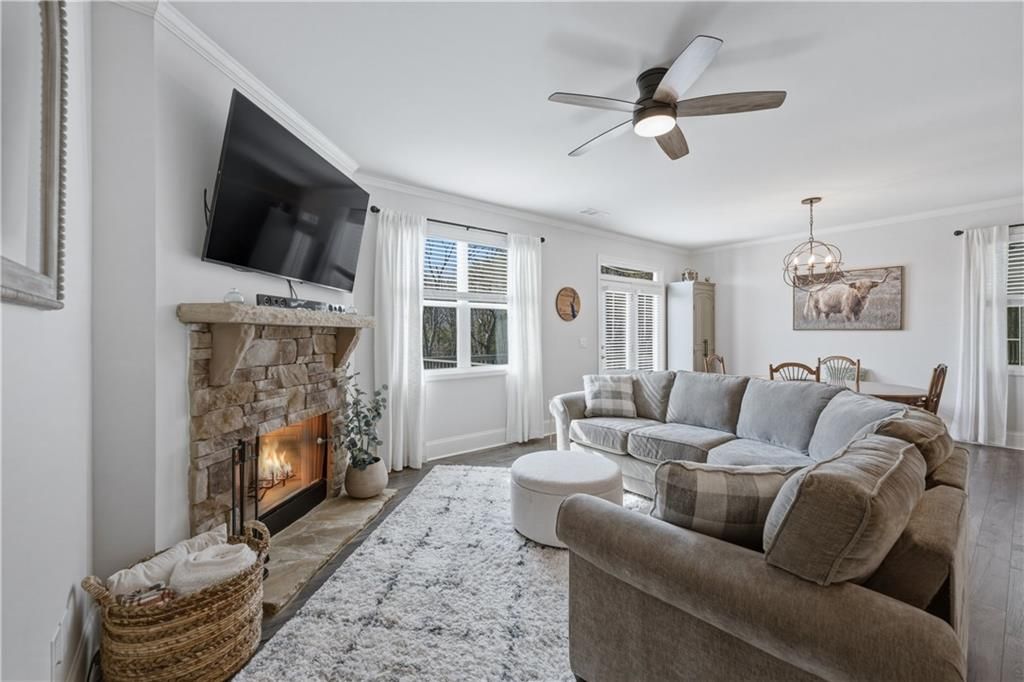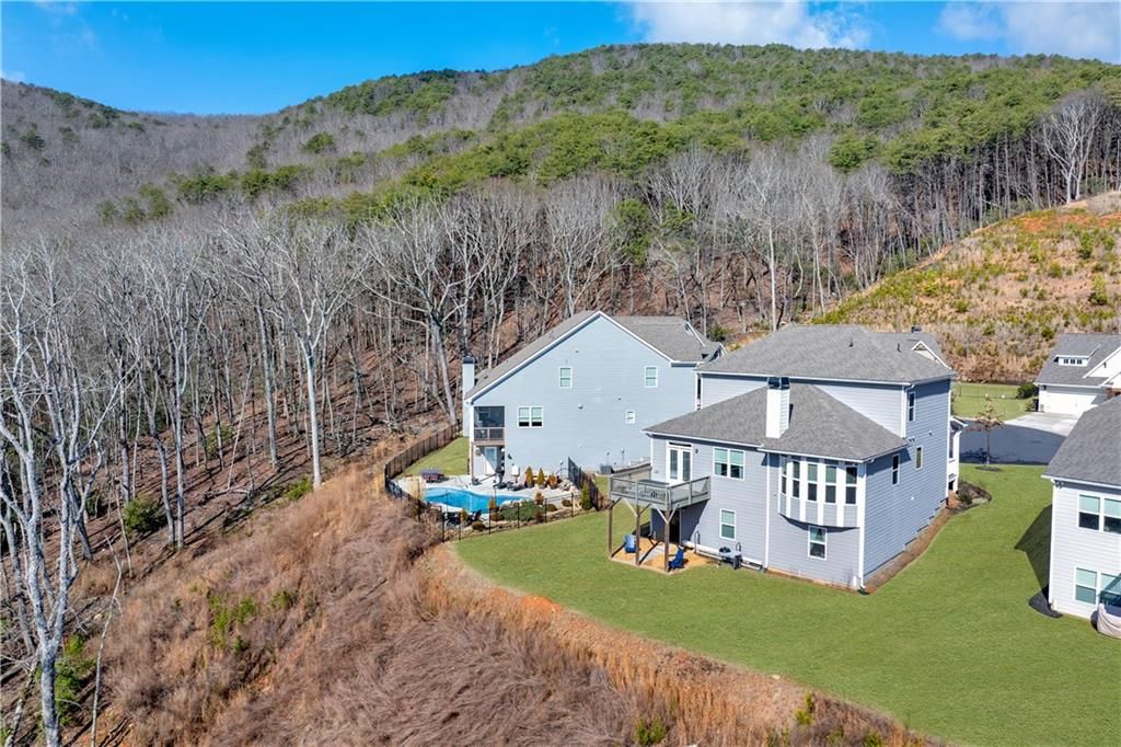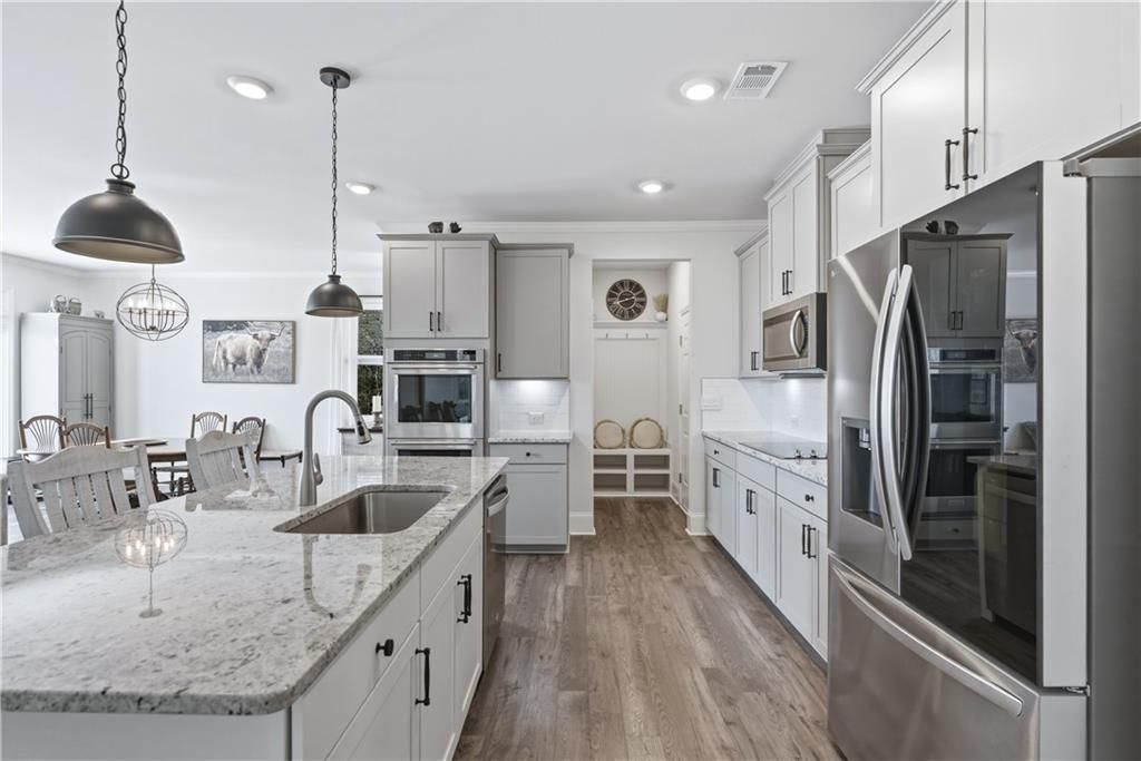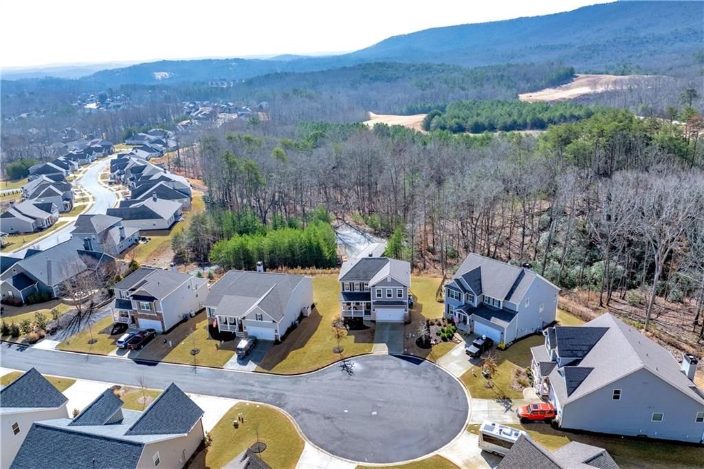 Welcome to the charming community of Lake Arrowhead nestled in the foothills of the North Georgia mountains, where you will find this beautifully appointed 5 bedroom, 3.5 bath home with bonus loft space and a fully finished basement. Perfectly situated on a quiet cul de sac lot with exceptional curb appeal from the classic architectural style to the inviting covered front porch and spacious lot, this home makes a lasting first impression. Step inside the welcoming foyer and you will immediately notice the updated flooring, abundant natural light, neutral paint tones, and modern finishes and fixtures throughout. The open concept main living area is designed for both everyday comfort and effortless entertaining. The family room features a cozy stone fireplace and large windows overlooking the peaceful backyard. The kitchen is a true centerpiece, boasting sleek gray cabinetry, granite countertops, under cabinet lighting, tile backsplash, stainless steel appliances including built in double ovens, a pantry, and an impressive center island with breakfast bar seating. The adjacent dining area flows seamlessly between the kitchen and family room and opens directly to the spacious back deck, perfect for hosting gatherings or enjoying casual meals outdoors. The primary suite is conveniently located on the main level and offers a serene retreat with beautiful windows overlooking the wooded scenery. The en suite bath features a soaking tub, double vanities, an oversized tile shower, and a walk in closet. Also on the main level, you will find a laundry room, mudroom space, and a convenient half bath. Upstairs, a finished loft provides flexible space ideal for a secondary sitting area, game room, or study. Three additional spacious bedrooms share a full bath with double sinks and a shower/tub combo. The finished basement expands your living space even further, offering endless possibilities whether you envision a home theater, gym, or entertainment area. A kitchenette makes hosting easy, while the additional bedroom and full bath create the perfect setup for an in law suite, teen suite, or private guest retreat. The walkout basement is steps away to the charming patio where you can enjoy the peaceful, tree-lined backyard. With versatile living spaces, thoughtful upgrades, and a desirable cul de sac location, this home offers comfort, style, and room to grow. Located in the highly sought after Lake Arrowhead community, residents enjoy resort style amenities including a 540 acre lake with marina, championship golf course, clubhouse with dining, two pools, tennis and pickleball courts, hiking trails, parks, and year round activities, all within a gated community.