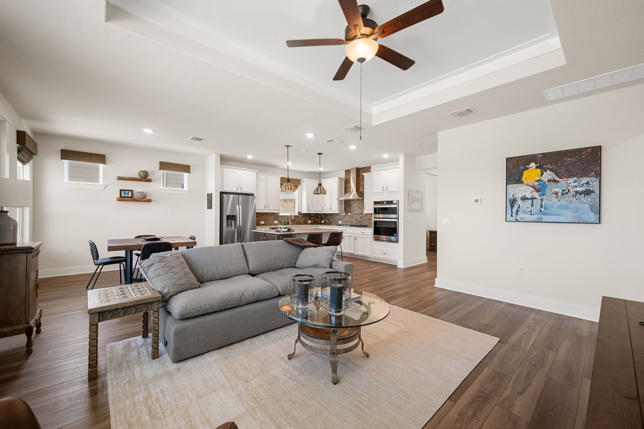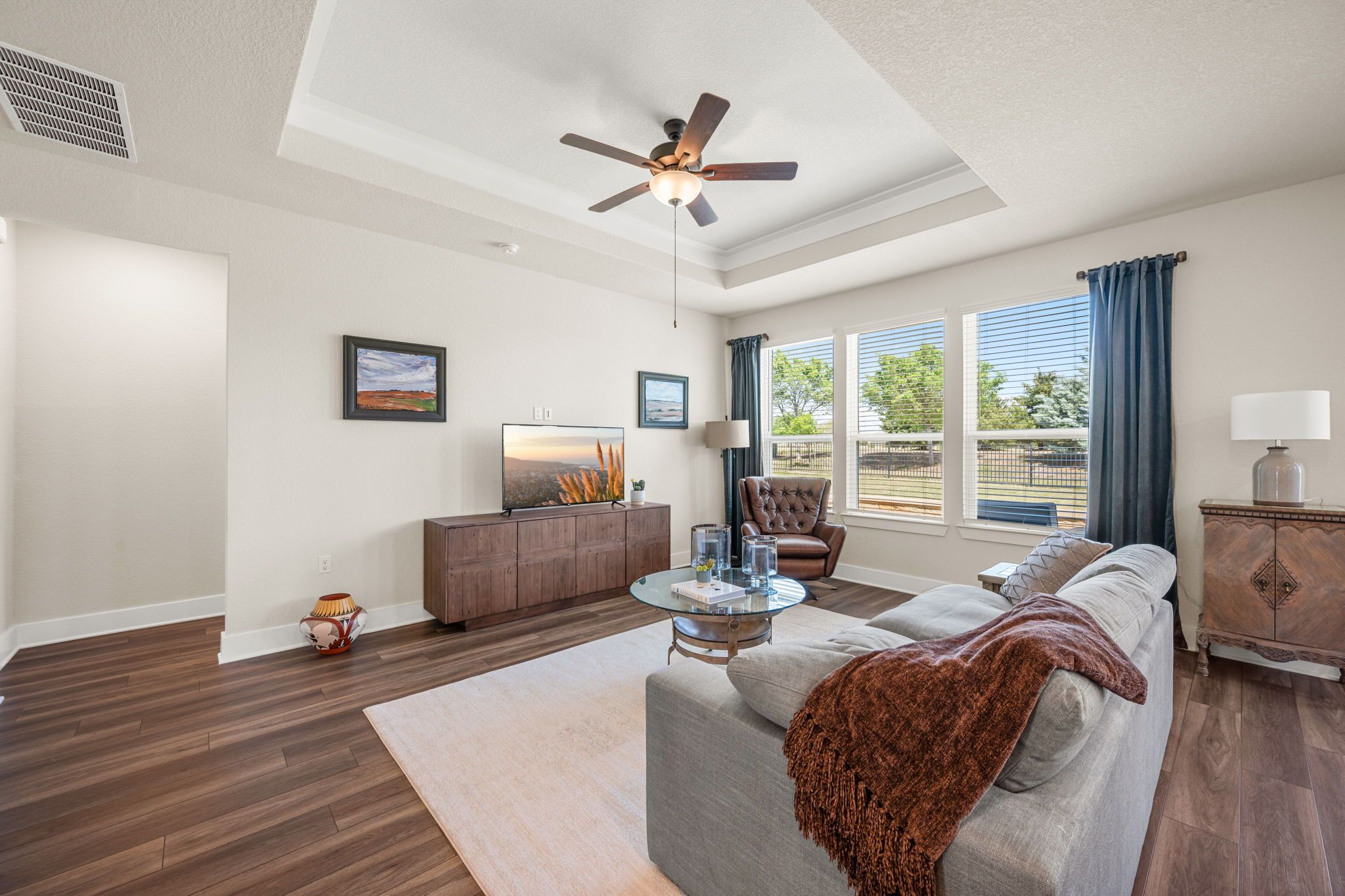 - Tray Ceiling(s), Ceiling Fan(s), Crown Molding, Kitchen Island, NoInteriorSteps, Open Floorplan, Stone Counters, Study
