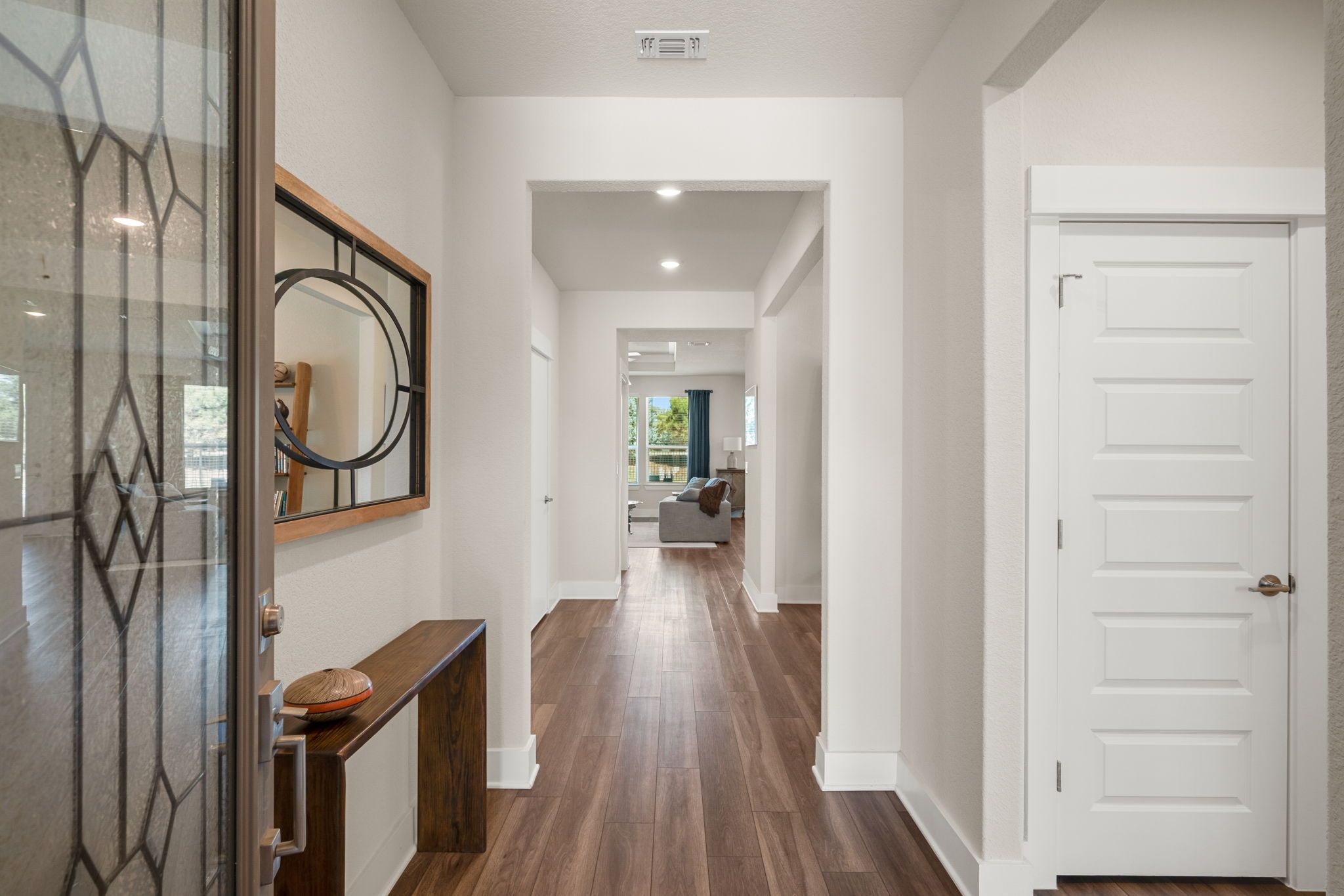 Welcome to 609 Wooden Rail Ln, a beautifully designed newer construction home in the highly sought-after 55+ community of Sun City Texas. Positioned on a premium lot backing to a serene greenbelt and framed by a line of evergreen trees, this property offers exceptional privacy and peaceful views. This thoughtfully designed home features 2 bedrooms, 2 full bathrooms, a spacious main living area, and an open flex space—perfect for a home office or hobby room. Designer-selected finishes elevate the interior, including wood-look tile flooring, upgraded kitchen countertops and backsplash, and stainless steel appliances for a clean, modern feel. The primary suite blends comfort and functionality with a zero-threshold walk-in shower with safety handles and a convenient pass-through window to the laundry room—an innovative feature that enhances everyday living. The attractively landscaped yard is designed for easy maintenance, ideal for lock-and-leave convenience so you can fully enjoy the lifestyle this vibrant community offers. Residents of Sun City enjoy resort-style amenities including three championship golf courses, multiple fitness centers, indoor and outdoor pools, pickleball and tennis courts, miles of scenic trails, and beautifully appointed activity centers with art studios, woodworking shops, and social spaces. A robust calendar of clubs and events offers endless opportunities to connect and stay active. Offered at $399,000, or $415,000 fully furnished as a turn-key opportunity, this home delivers comfort, style, and an exceptional active adult lifestye!