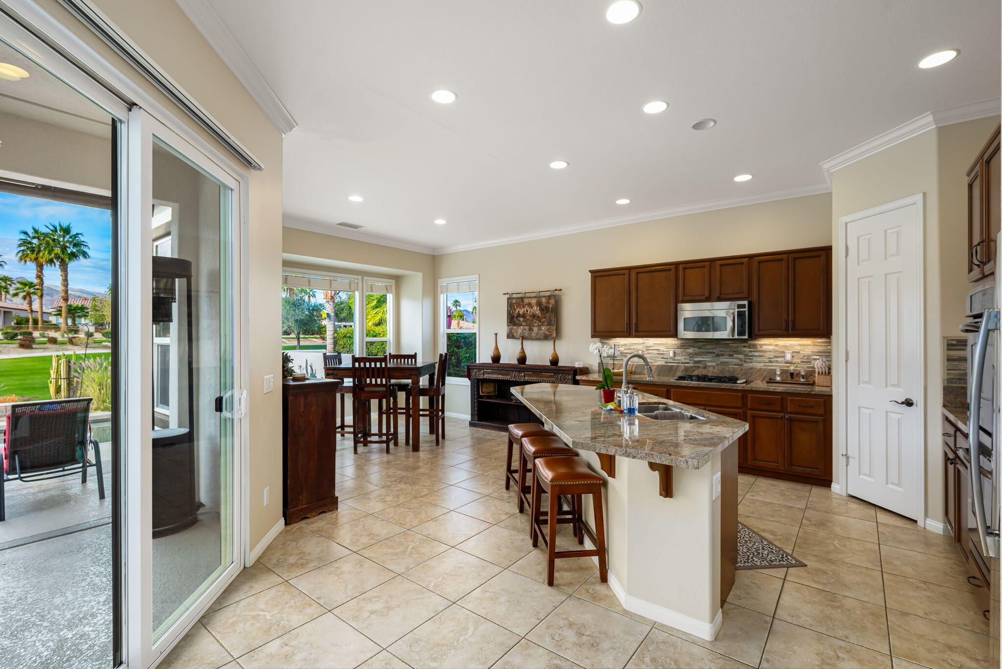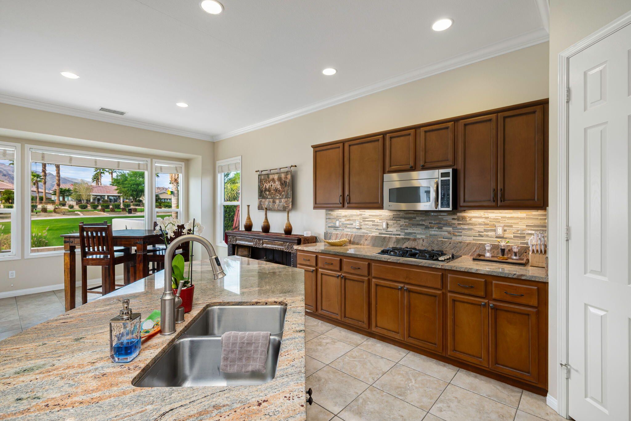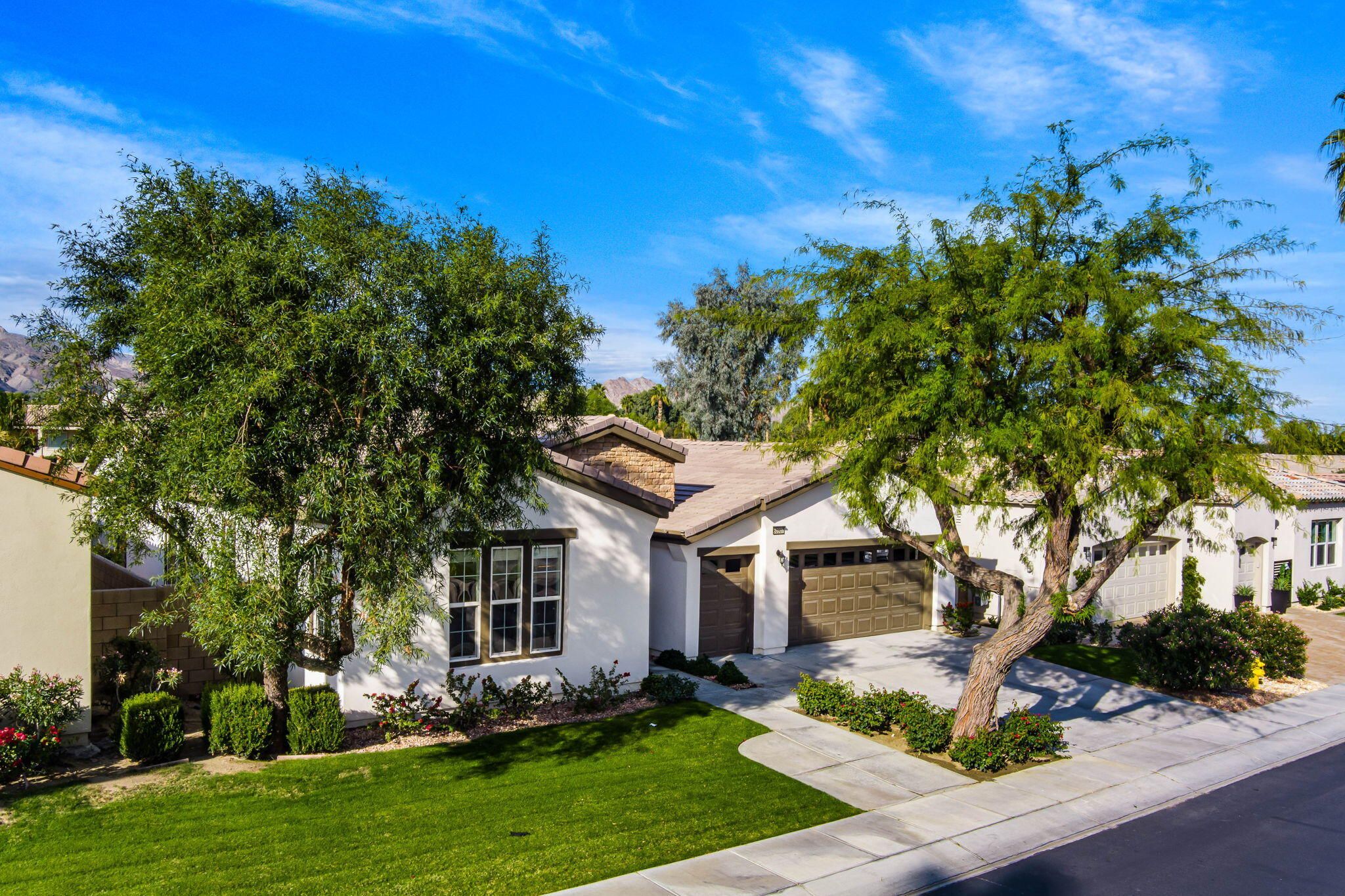 Located on the 13th tee in the highly sought-after 55+ resort community of Trilogy at La Quinta, this beautifully designed Cassius floor-plan offers stunning golf course, mountain, and lake views along with exceptional indoor-outdoor living. Spanning approximately 2,482 square feet, the home features 3 bedrooms and 3.5 bathrooms, including an attached guest casita that is perfect for hosting guests or creating a private retreat. The open-concept floor plan is thoughtfully designed for both everyday living and entertaining, featuring a spacious great room with fireplace that flows seamlessly into the kitchen and dining areas. The kitchen offers ample cabinetry, generous counter space, and an ideal layout for gatherings, while the primary suite provides a peaceful escape with views and a well-appointed en-suite bath. Step outside to a private backyard overlooking the lush fairways, where you can enjoy breathtaking sunsets and the serene desert surroundings. Residents of Trilogy at La Quinta enjoy an unparalleled lifestyle with access to championship golf, a state-of-the-art fitness center, resort-style pools and spa, tennis and pickleball courts, clubhouse dining, and a full calendar of social events and activities, all set against the backdrop of the Santa Rosa Mountains. This is desert living at its finest, combining premier location, exceptional views, and the vibrant lifestyle that makes Trilogy one of La Quinta's most desirable communities.