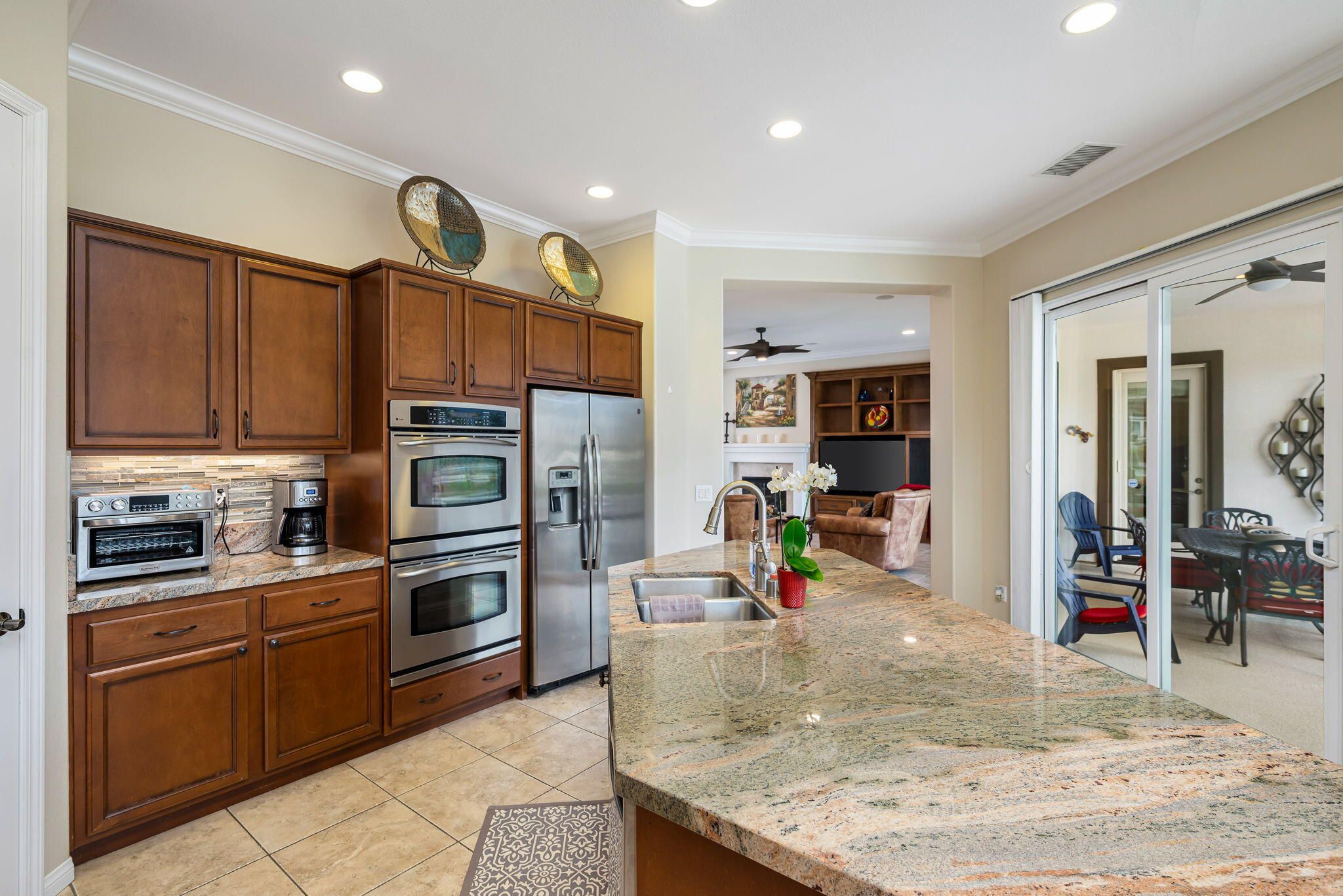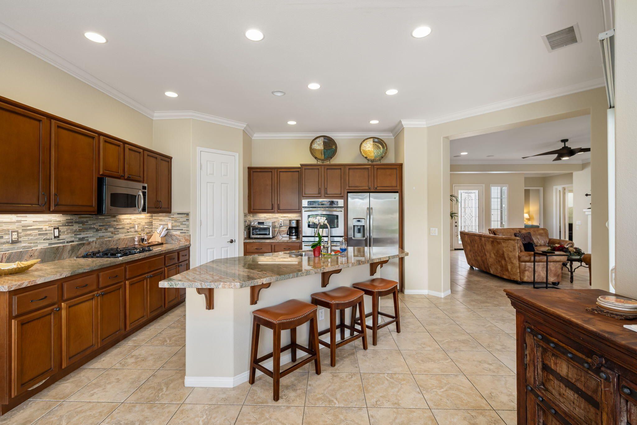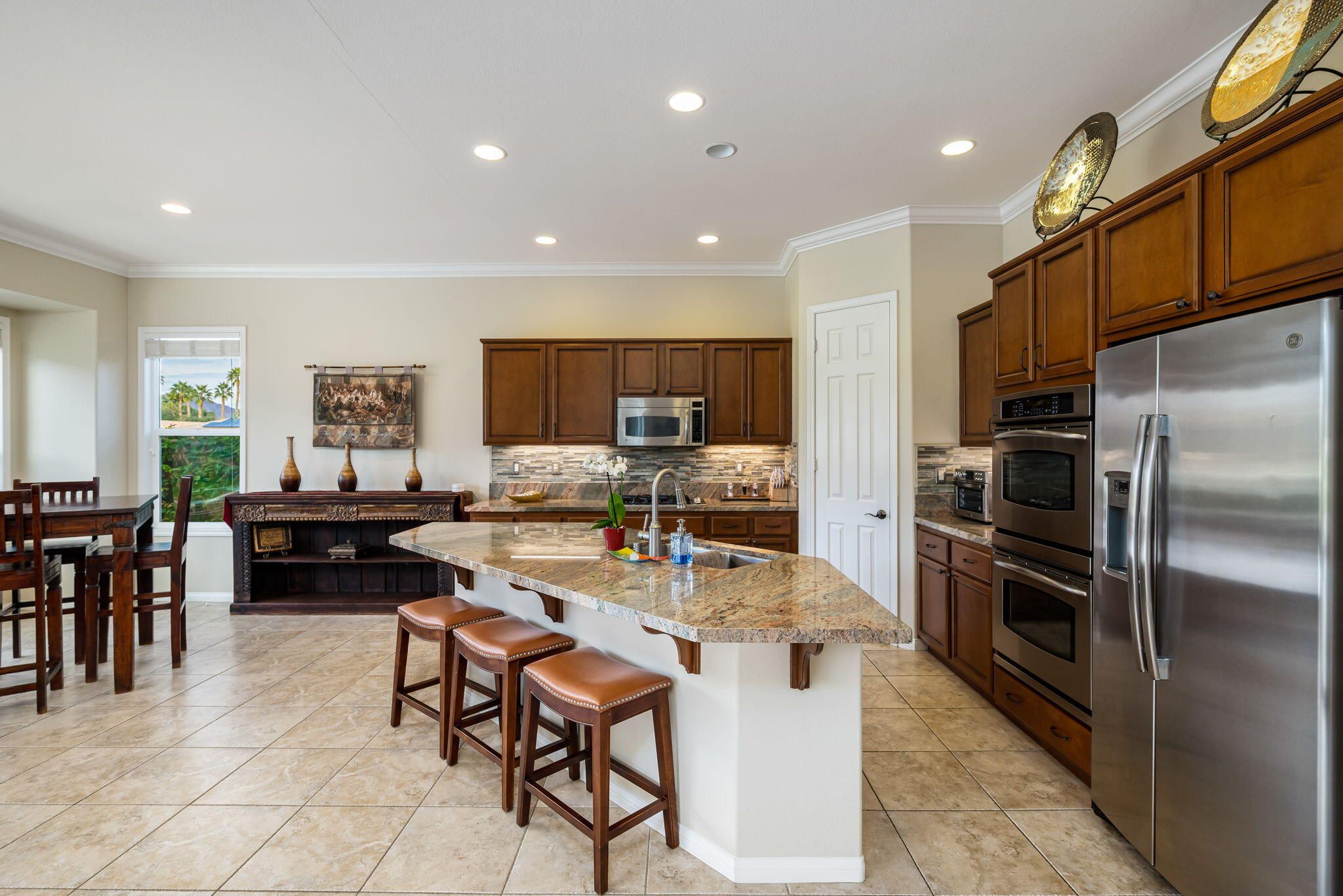 Located on the 13th tee in the highly sought-after 55+ resort community of Trilogy at La Quinta, this beautifully designed Cassius floor-plan offers stunning golf course, mountain, and lake views along with exceptional indoor-outdoor living. Spanning approximately 2,482 square feet, the home features 3 bedrooms and 3.5 bathrooms, including an attached guest casita that is perfect for hosting guests or creating a private retreat. The open-concept floor plan is thoughtfully designed for both everyday living and entertaining, featuring a spacious great room with fireplace that flows seamlessly into the kitchen and dining areas. The kitchen offers ample cabinetry, generous counter space, and an ideal layout for gatherings, while the primary suite provides a peaceful escape with views and a well-appointed en-suite bath. Step outside to a private backyard overlooking the lush fairways, where you can enjoy breathtaking sunsets and the serene desert surroundings. Residents of Trilogy at La Quinta enjoy an unparalleled lifestyle with access to championship golf, a state-of-the-art fitness center, resort-style pools and spa, tennis and pickleball courts, clubhouse dining, and a full calendar of social events and activities, all set against the backdrop of the Santa Rosa Mountains. This is desert living at its finest, combining premier location, exceptional views, and the vibrant lifestyle that makes Trilogy one of La Quinta's most desirable communities.