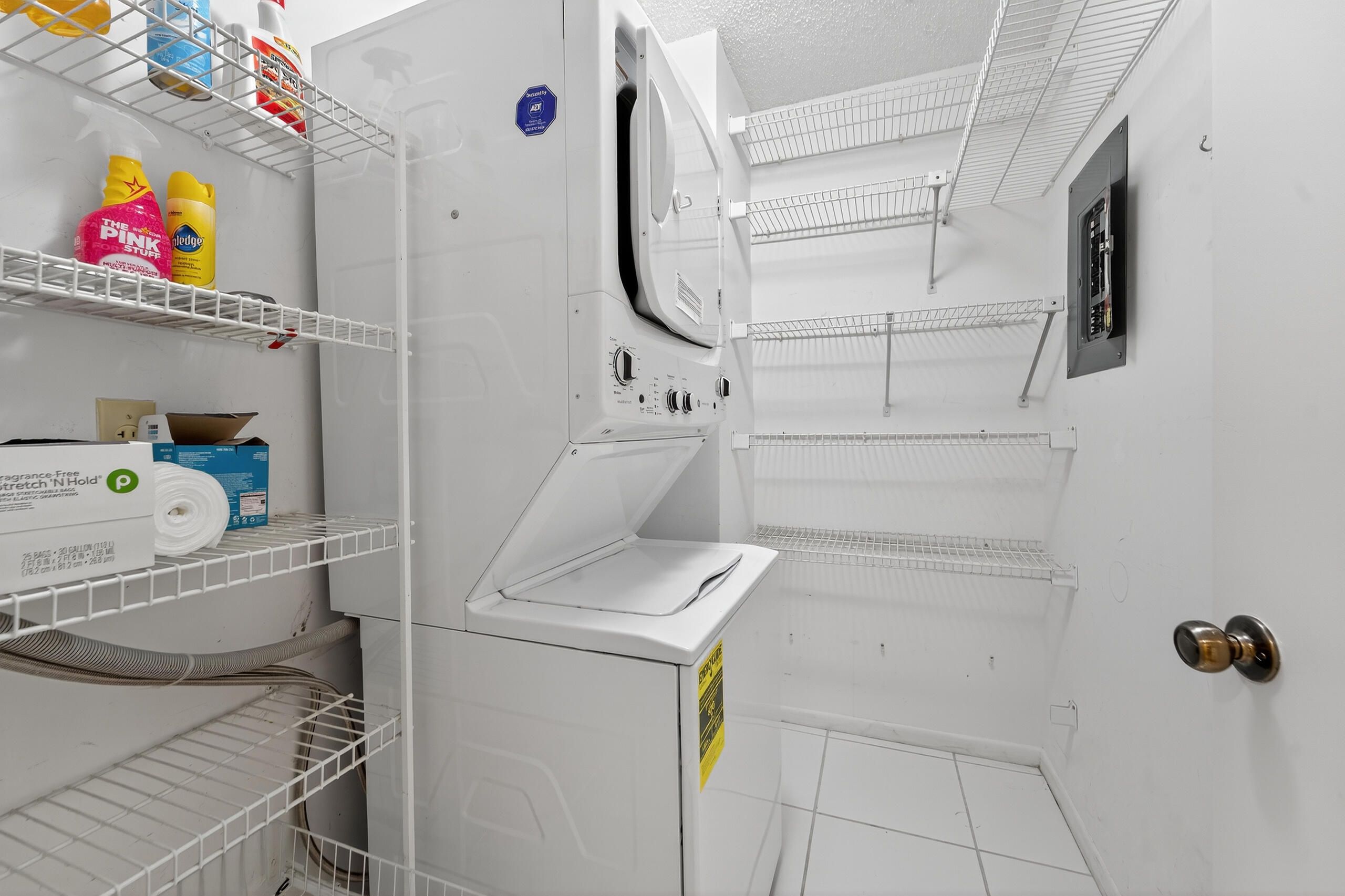 Spectacular, light filled 3rd floor corner 2/2 condo with convertible den with large storage closet. Den large enough to double as guest room or office. Impact glass enclosed, screened lanai with lake view. Impact windows all around. Tile floors in all rooms except primary, which is wood laminate. Granite counters and wood cabinets in kitchen. There's also a full-sized pantry. Full laundry room with large capacity stackable washer and dryer, but room for full sized version of both. Oversized walk-in closet in primary br. Updated primary and guest baths. Separate shower in en-suite primary bath. Covered parking spot #62. Owner has paid all assessments in full. Huntington Pointe is a an active adult community that features a 53,000 square foot clubhouse. The 600 seat theater offers live