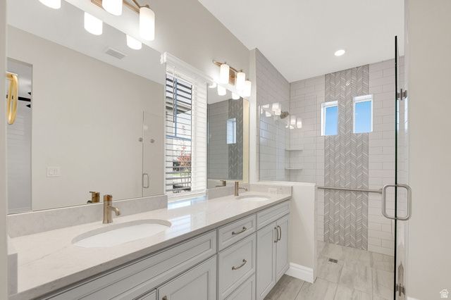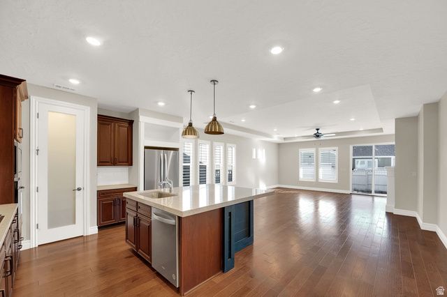 Nearly new home at $80,000 under builder's price in coveted 55+ community. Across the street pickleball ball courts & 10,000 sqft community center/club house. Brimming with upgrades including; single level living, steel appliances, gas range,granite countertops, plantation shutters, 9'+ ceilings, 8' doors, LVP water resistant flooring, high end carpet, beatiful gas fireplace & mantle, maintenance free front & backyard maintained by HOA, bonus room/den, sleek tile, fans & pendant and recessed lighting, tankless water heater, washer & dryer included, upgraded cabinets and hood, fenced privacy. Enjoy the Daybreak lifestyle with golf simulator, pickleball, large community kitchen & gathering areas, exercise rooms, pools & hot tubs, lake recreation & fishing, walking trails & parks. Close to shopping & etertainment