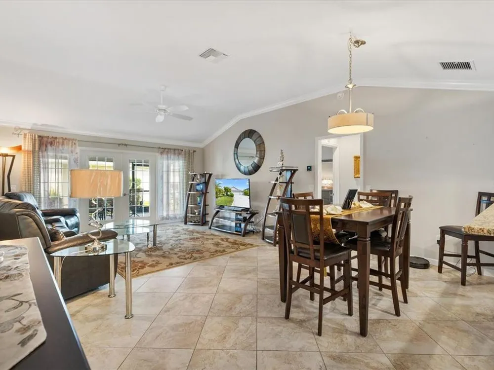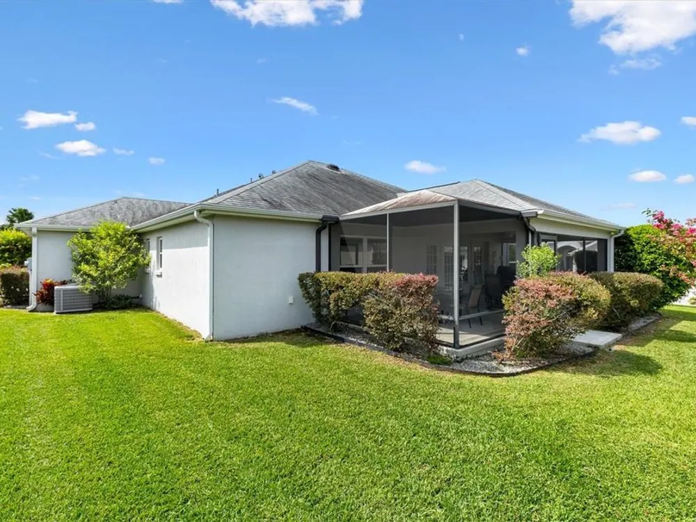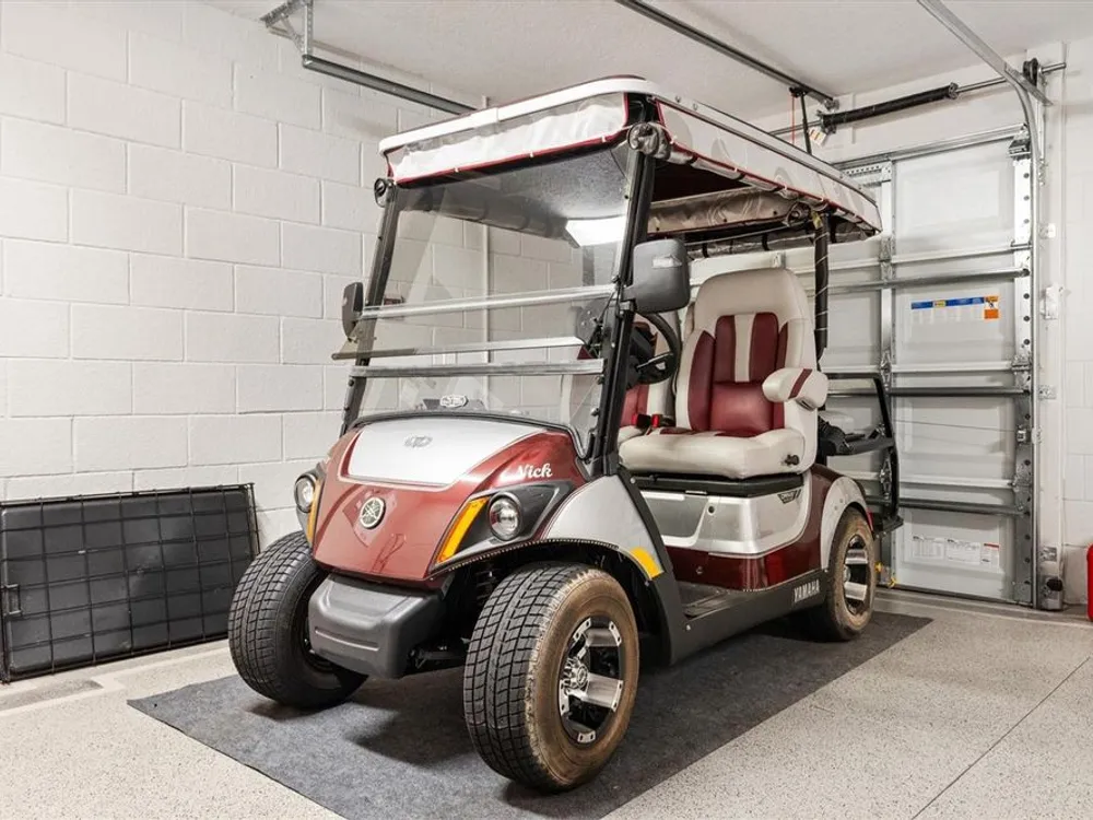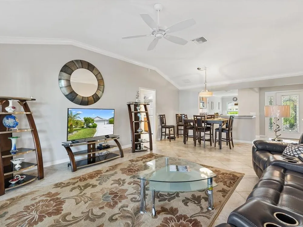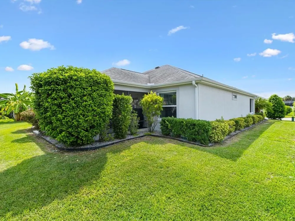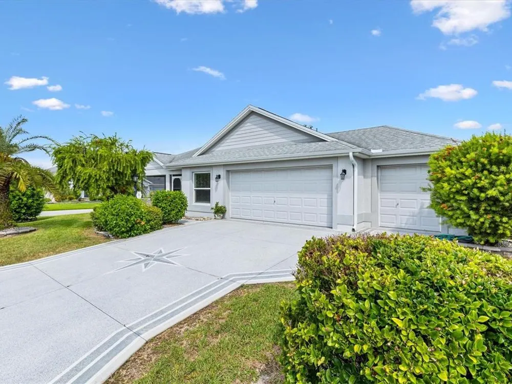 This beautifully maintained 3/2 Jasmine Designer home in the Village of De Soto is perfectly situated on a spacious corner lot and offers style and comfort. A painted driveway and walkway lead to the inviting enclosed screened front porch, accented by a stained glass front door with a Stained glass side panel. Inside, you’ll find diagonal tile flooring in the main living areas, vaulted ceilings, crown molding, and ceiling fans throughout. The split floor plan provides privacy, with a pocket door leading to the guest bedrooms. The guest bath features a tub/shower combo and a glass block window. The master suite includes a large walk-in closet and an en-suite bath with dual vanities, a step-in shower with bench, and windows for natural light. The eat-in kitchen is a cook’s delight, offering granite countertops, stainless steel appliances, pull-out shelving, and a pantry closet. A laundry room adds convenience with a closet with built-in shelves, storage cabinets, and a mud sink. Enjoy Florida outdoor living in the expansive 12x30 screened lanai with covered birdcage, ideal for relaxing or entertaining. Additional highlights include: a spacious 2-car plus golf cart garage with painted floor, Tankless hot water heater for efficiency and full gutters around the home. This home combines functionality, elegance, and outdoor enjoyment—ready for you to move in and make it your own! This location just can’t be beat. Just ½ mile to the Sugar Cane Recreation Center and Magnolia Plaza for shopping and dining. Fenney Regional Recreation Center is less than 2 miles and the Dudley Canine Park is close by. Don’t miss the opportunity to make this your new home and start living the Villages dream. 4 Seater 2019 Yamaha Quiet Tech Golf cart being sold separately.