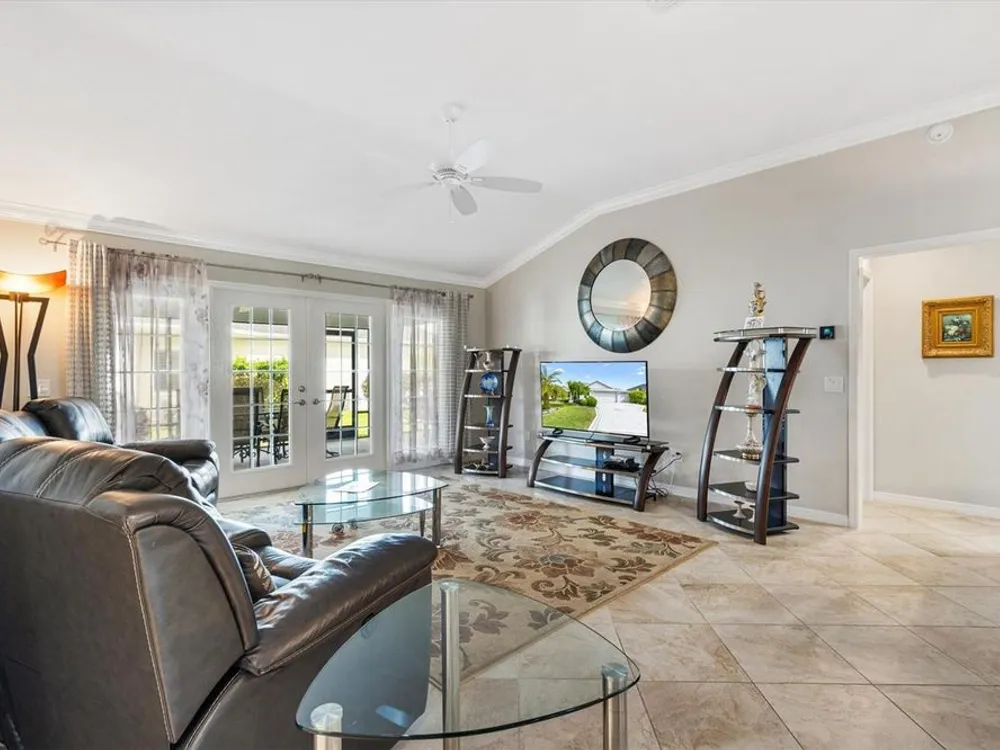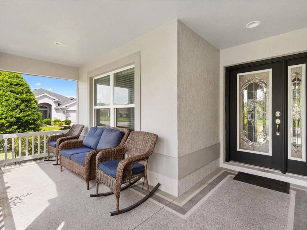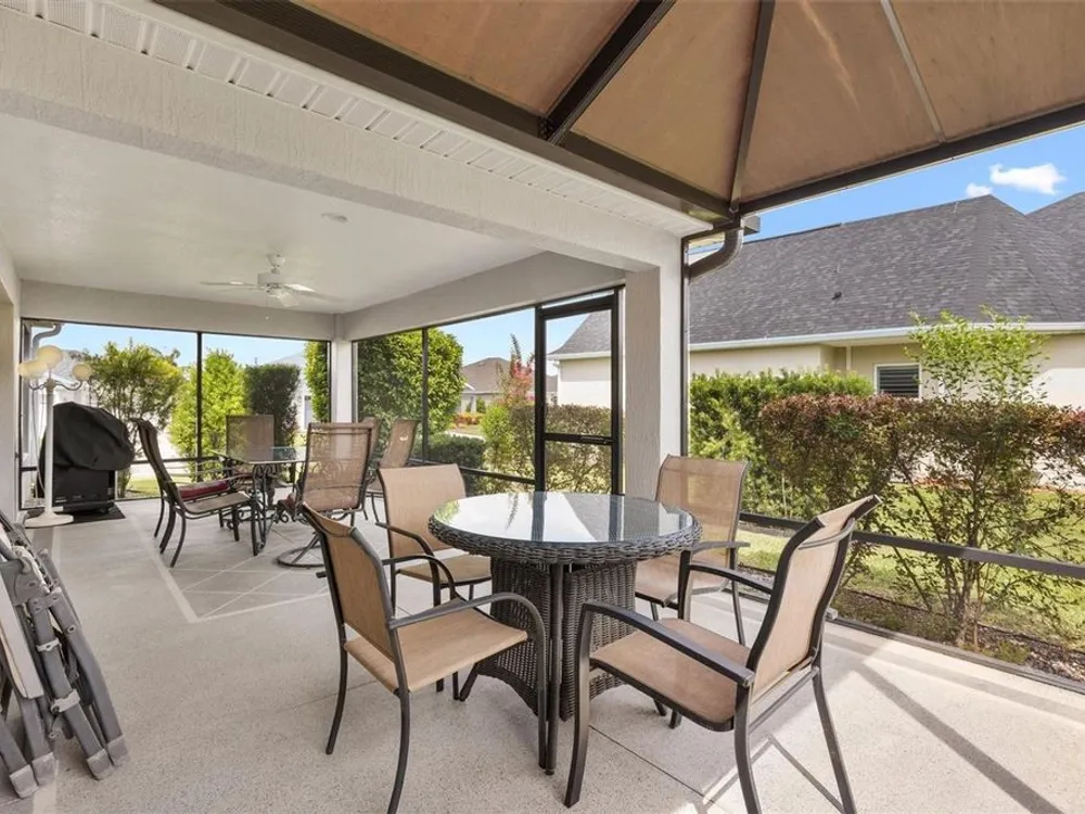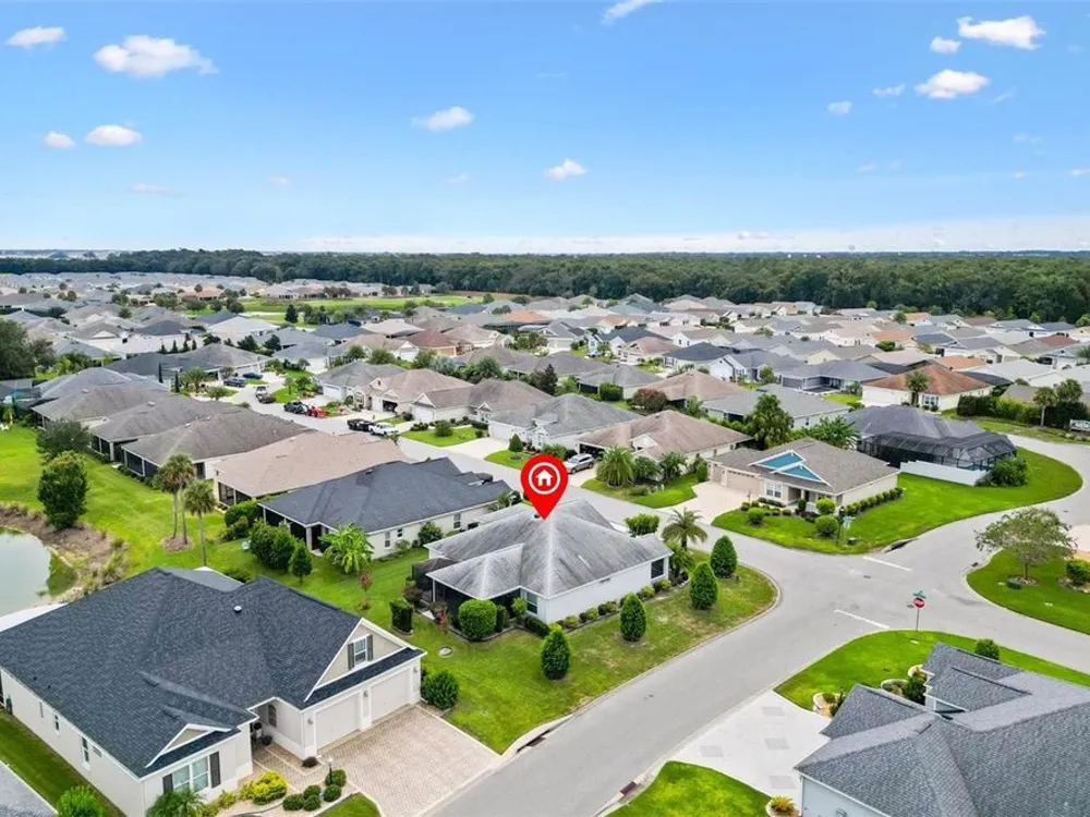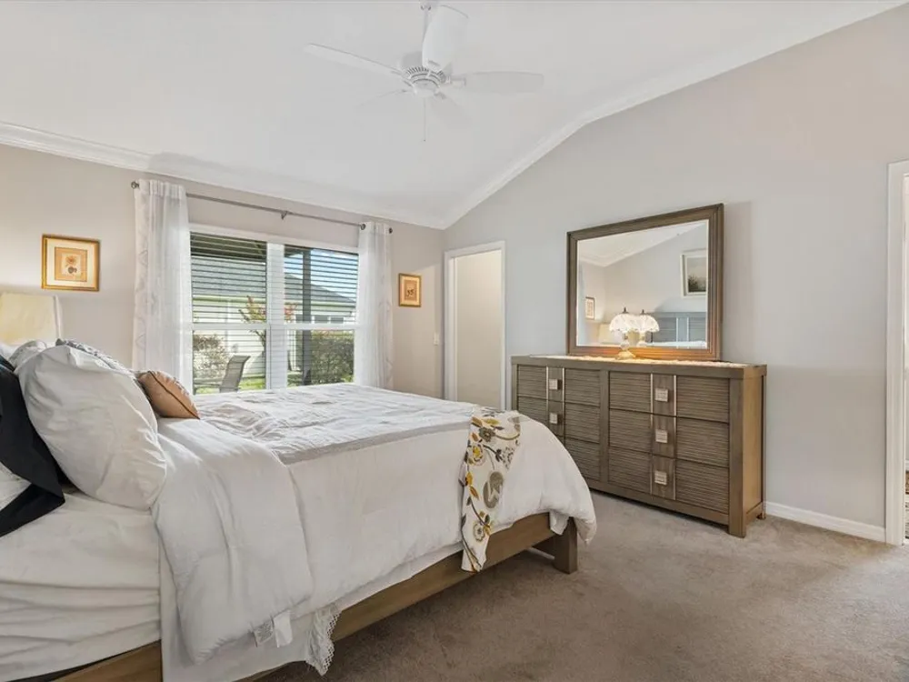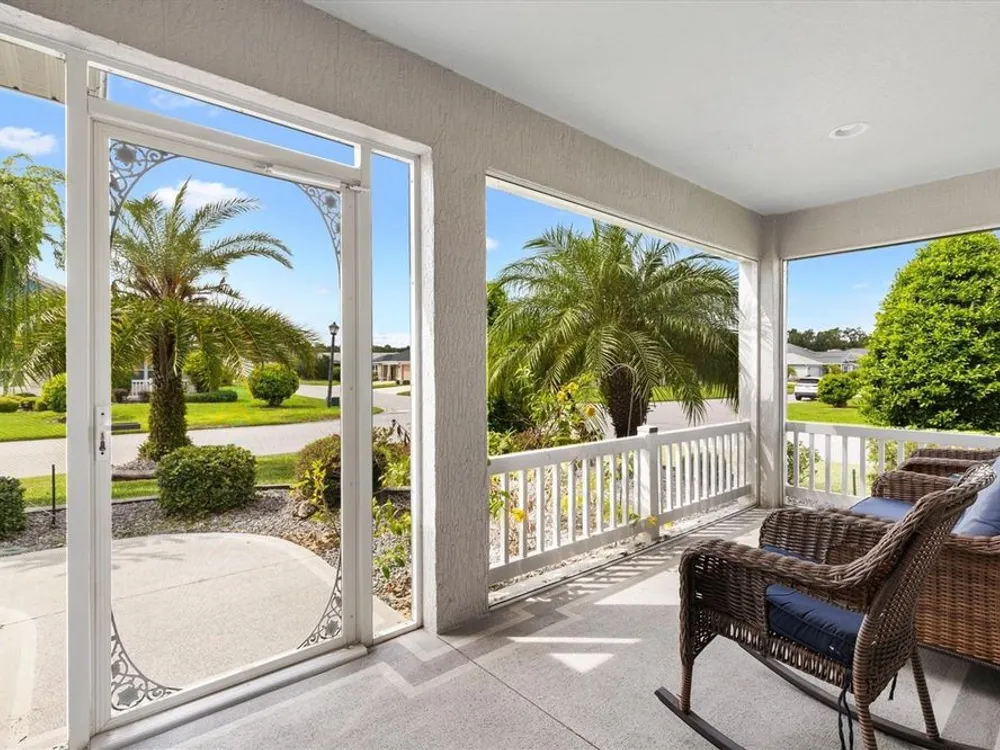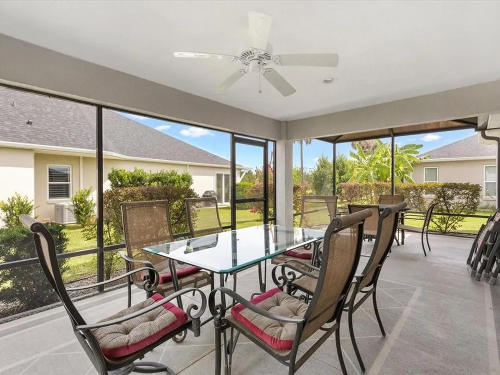 This beautifully maintained 3/2 Jasmine Designer home in the Village of De Soto is perfectly situated on a spacious corner lot and offers style and comfort. A painted driveway and walkway lead to the inviting enclosed screened front porch, accented by a stained glass front door with a Stained glass side panel. Inside, you’ll find diagonal tile flooring in the main living areas, vaulted ceilings, crown molding, and ceiling fans throughout. The split floor plan provides privacy, with a pocket door leading to the guest bedrooms. The guest bath features a tub/shower combo and a glass block window. The master suite includes a large walk-in closet and an en-suite bath with dual vanities, a step-in shower with bench, and windows for natural light. The eat-in kitchen is a cook’s delight, offering granite countertops, stainless steel appliances, pull-out shelving, and a pantry closet. A laundry room adds convenience with a closet with built-in shelves, storage cabinets, and a mud sink. Enjoy Florida outdoor living in the expansive 12x30 screened lanai with covered birdcage, ideal for relaxing or entertaining. Additional highlights include: a spacious 2-car plus golf cart garage with painted floor, Tankless hot water heater for efficiency and full gutters around the home. This home combines functionality, elegance, and outdoor enjoyment—ready for you to move in and make it your own! This location just can’t be beat. Just ½ mile to the Sugar Cane Recreation Center and Magnolia Plaza for shopping and dining. Fenney Regional Recreation Center is less than 2 miles and the Dudley Canine Park is close by. Don’t miss the opportunity to make this your new home and start living the Villages dream. 4 Seater 2019 Yamaha Quiet Tech Golf cart being sold separately.