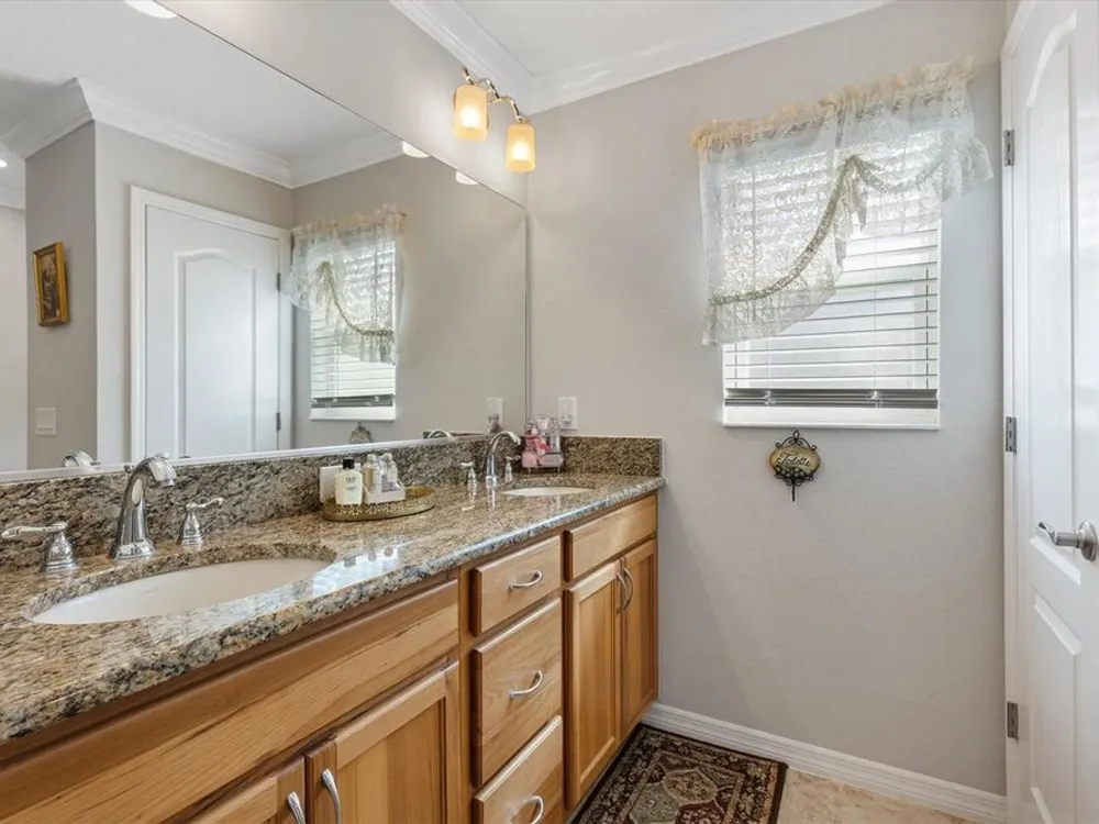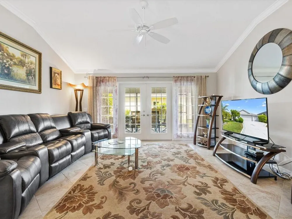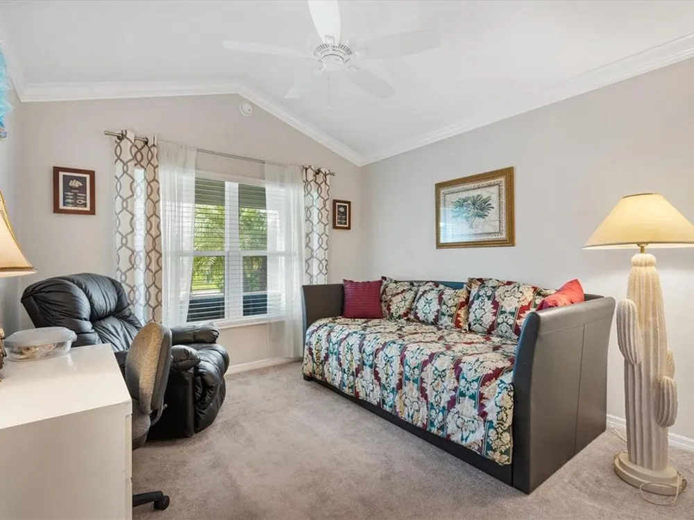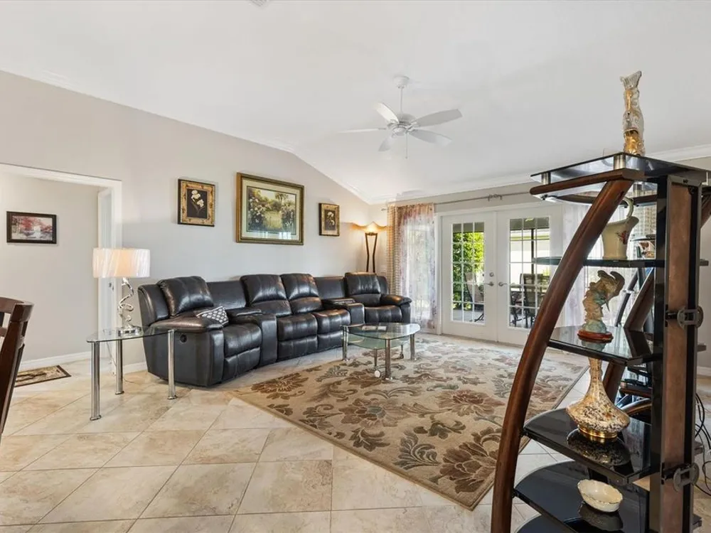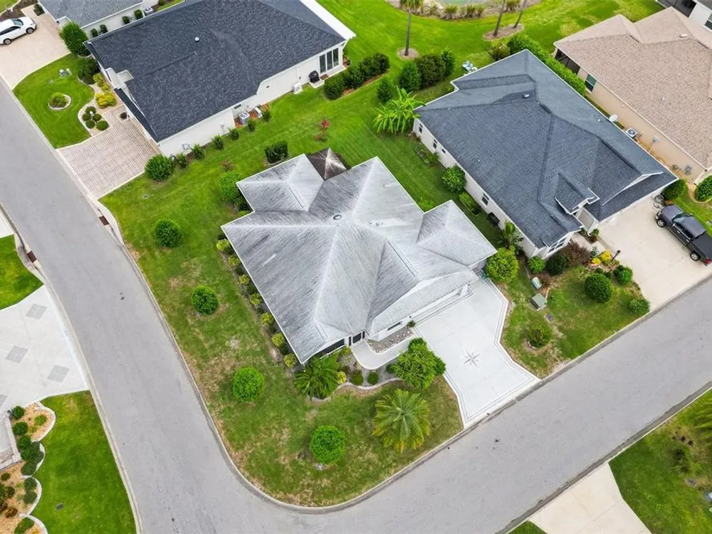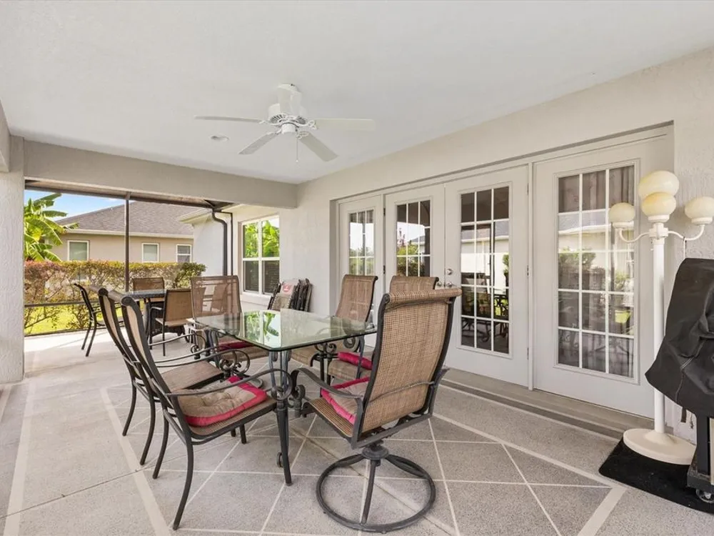 This beautifully maintained 3/2 Jasmine Designer home in the Village of De Soto is perfectly situated on a spacious corner lot and offers style and comfort. A painted driveway and walkway lead to the inviting enclosed screened front porch, accented by a stained glass front door with a Stained glass side panel. Inside, you’ll find diagonal tile flooring in the main living areas, vaulted ceilings, crown molding, and ceiling fans throughout. The split floor plan provides privacy, with a pocket door leading to the guest bedrooms. The guest bath features a tub/shower combo and a glass block window. The master suite includes a large walk-in closet and an en-suite bath with dual vanities, a step-in shower with bench, and windows for natural light. The eat-in kitchen is a cook’s delight, offering granite countertops, stainless steel appliances, pull-out shelving, and a pantry closet. A laundry room adds convenience with a closet with built-in shelves, storage cabinets, and a mud sink. Enjoy Florida outdoor living in the expansive 12x30 screened lanai with covered birdcage, ideal for relaxing or entertaining. Additional highlights include: a spacious 2-car plus golf cart garage with painted floor, Tankless hot water heater for efficiency and full gutters around the home. This home combines functionality, elegance, and outdoor enjoyment—ready for you to move in and make it your own! This location just can’t be beat. Just ½ mile to the Sugar Cane Recreation Center and Magnolia Plaza for shopping and dining. Fenney Regional Recreation Center is less than 2 miles and the Dudley Canine Park is close by. Don’t miss the opportunity to make this your new home and start living the Villages dream. 4 Seater 2019 Yamaha Quiet Tech Golf cart being sold separately.