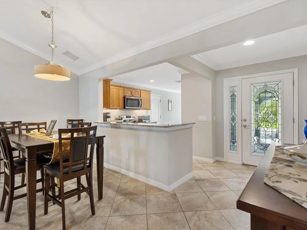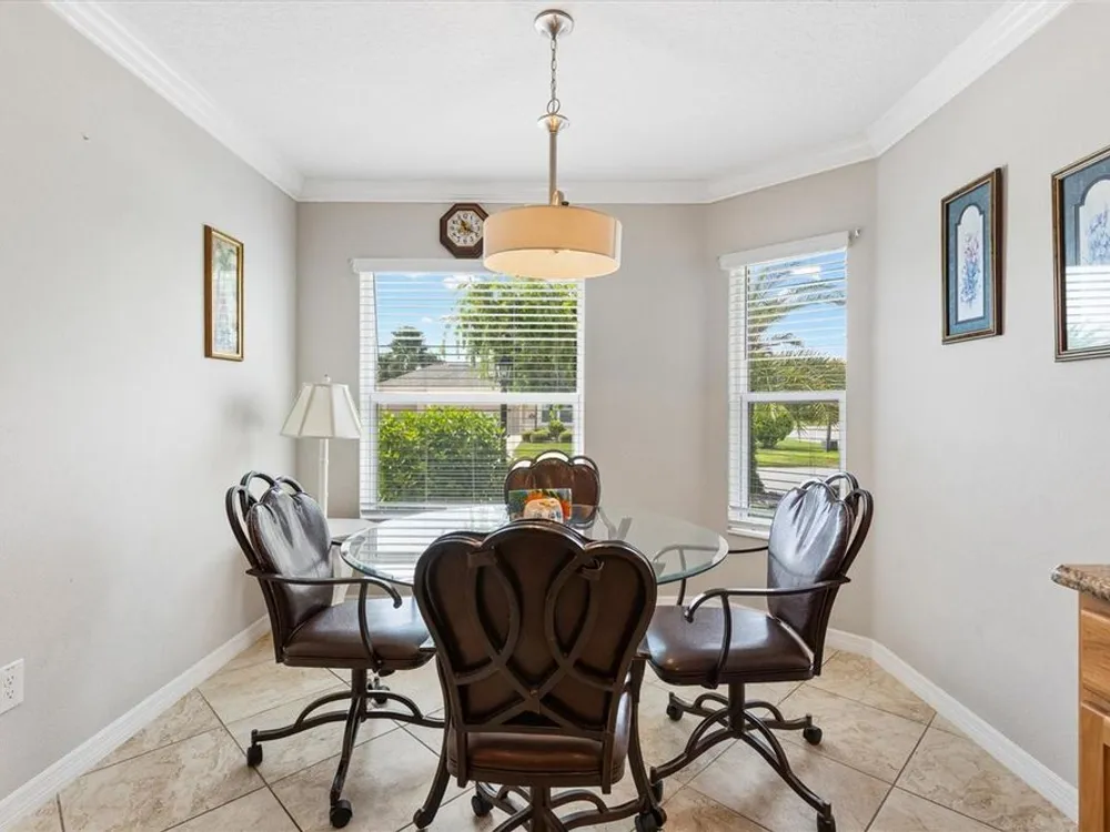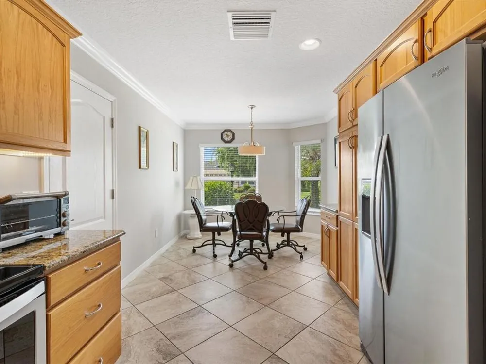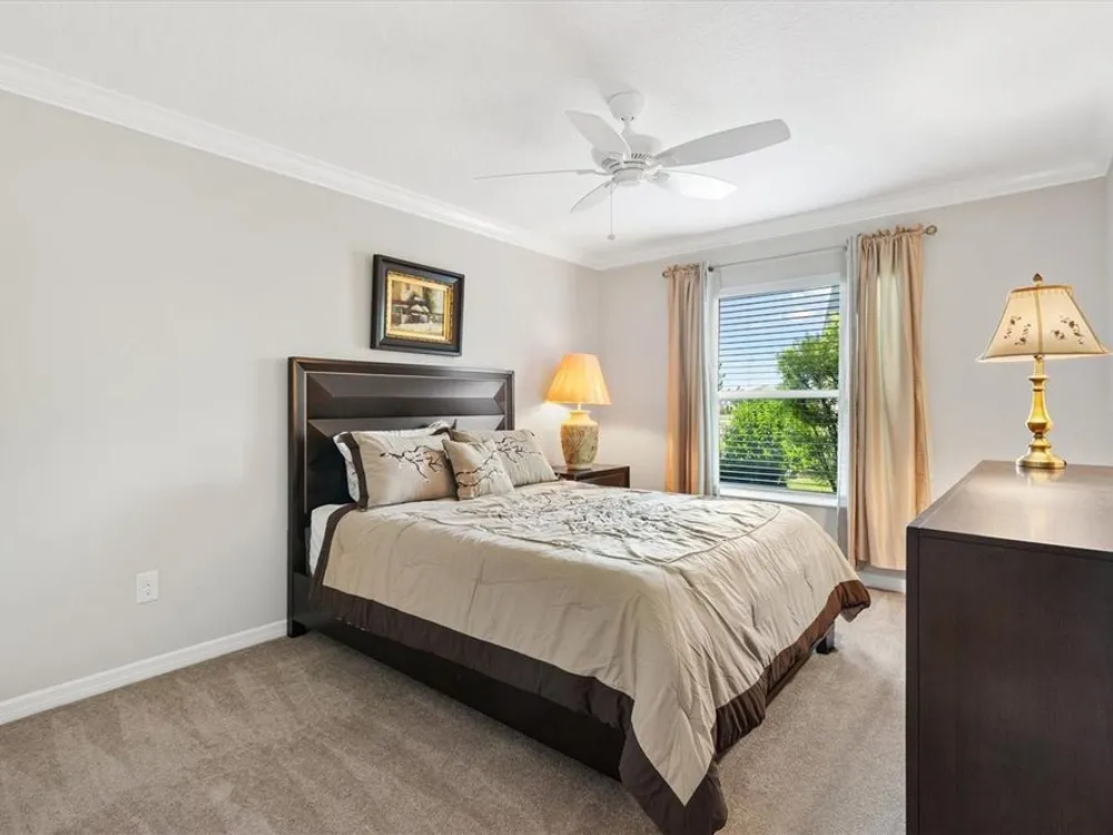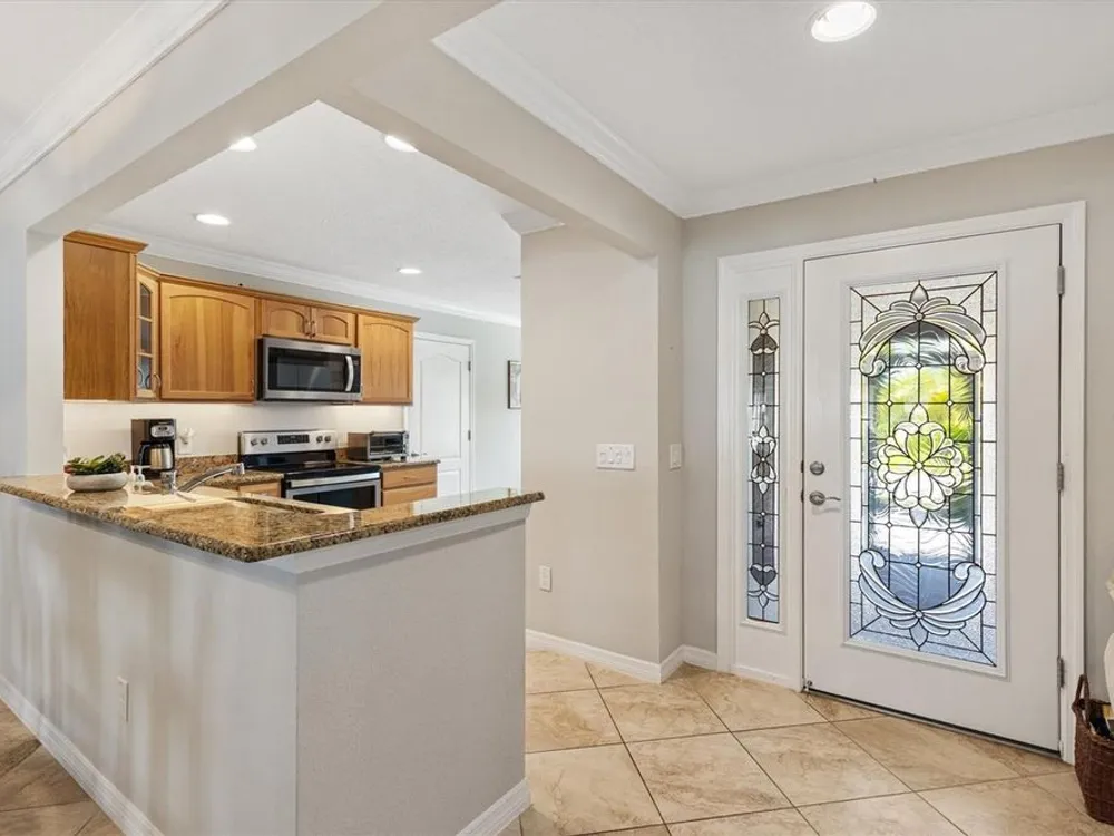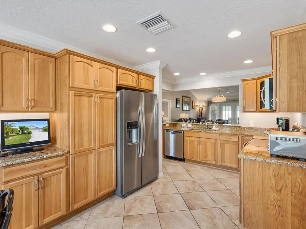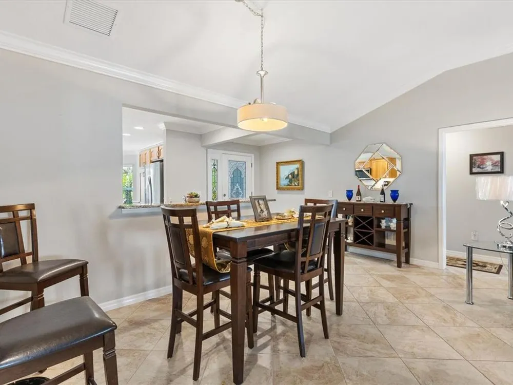 This beautifully maintained 3/2 Jasmine Designer home in the Village of De Soto is perfectly situated on a spacious corner lot and offers style and comfort. A painted driveway and walkway lead to the inviting enclosed screened front porch, accented by a stained glass front door with a Stained glass side panel. Inside, you’ll find diagonal tile flooring in the main living areas, vaulted ceilings, crown molding, and ceiling fans throughout. The split floor plan provides privacy, with a pocket door leading to the guest bedrooms. The guest bath features a tub/shower combo and a glass block window. The master suite includes a large walk-in closet and an en-suite bath with dual vanities, a step-in shower with bench, and windows for natural light. The eat-in kitchen is a cook’s delight, offering granite countertops, stainless steel appliances, pull-out shelving, and a pantry closet. A laundry room adds convenience with a closet with built-in shelves, storage cabinets, and a mud sink. Enjoy Florida outdoor living in the expansive 12x30 screened lanai with covered birdcage, ideal for relaxing or entertaining. Additional highlights include: a spacious 2-car plus golf cart garage with painted floor, Tankless hot water heater for efficiency and full gutters around the home. This home combines functionality, elegance, and outdoor enjoyment—ready for you to move in and make it your own! This location just can’t be beat. Just ½ mile to the Sugar Cane Recreation Center and Magnolia Plaza for shopping and dining. Fenney Regional Recreation Center is less than 2 miles and the Dudley Canine Park is close by. Don’t miss the opportunity to make this your new home and start living the Villages dream. 4 Seater 2019 Yamaha Quiet Tech Golf cart being sold separately.