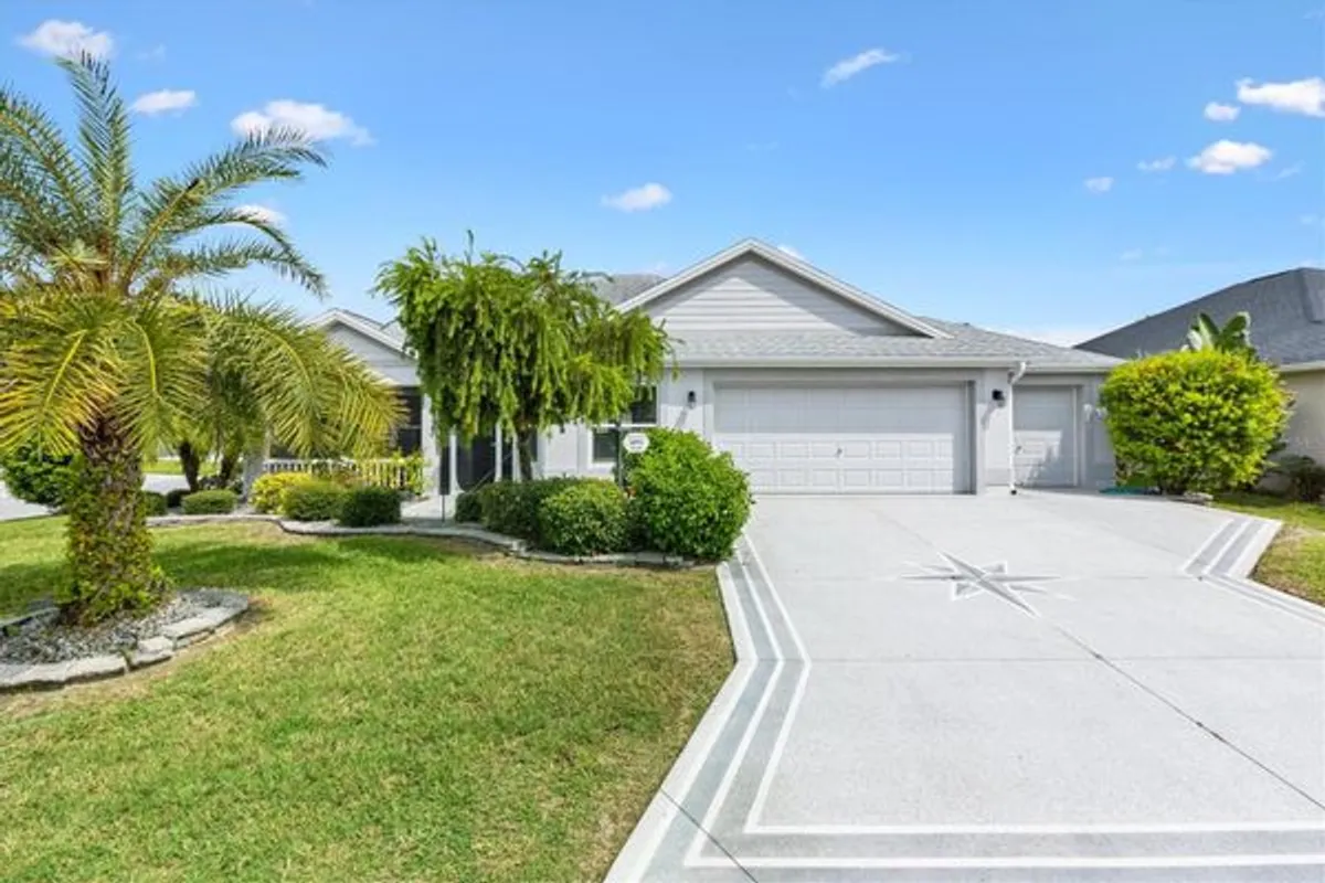 This beautifully maintained 3/2 Jasmine Designer home in the Village of De Soto is perfectly situated on a spacious corner lot and offers style and comfort. A painted driveway and walkway lead to the inviting enclosed screened front porch, accented by a stained glass front door with a Stained glass side panel. Inside, you’ll find diagonal tile flooring in the main living areas, vaulted ceilings, crown molding, and ceiling fans throughout. The split floor plan provides privacy, with a pocket door leading to the guest bedrooms. The guest bath features a tub/shower combo and a glass block window. The master suite includes a large walk-in closet and an en-suite bath with dual vanities, a step-in shower with bench, and windows for natural light. The eat-in kitchen is a cook’s delight, offering granite countertops, stainless steel appliances, pull-out shelving, and a pantry closet. A laundry room adds convenience with a closet with built-in shelves, storage cabinets, and a mud sink. Enjoy Florida outdoor living in the expansive 12x30 screened lanai with covered birdcage, ideal for relaxing or entertaining. Additional highlights include: a spacious 2-car plus golf cart garage with painted floor, Tankless hot water heater for efficiency and full gutters around the home. This home combines functionality, elegance, and outdoor enjoyment—ready for you to move in and make it your own! This location just can’t be beat. Just ½ mile to the Sugar Cane Recreation Center and Magnolia Plaza for shopping and dining. Fenney Regional Recreation Center is less than 2 miles and the Dudley Canine Park is close by. Don’t miss the opportunity to make this your new home and start living the Villages dream.