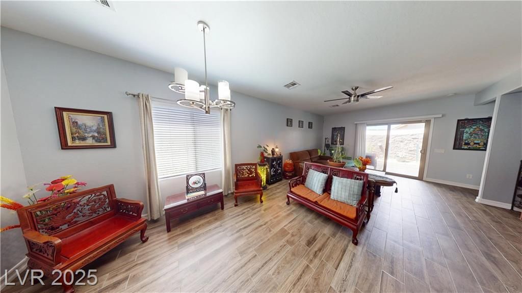 Welcome to the 55+ Solera by Del Webb community at Stallion Mountain. This beautiful single-story home features three spacious bedrooms and two modern bathrooms, with a stylish kitchen showcasing granite countertops.The home features grey wood-like tile flooring throughout, complemented by comfortable wood laminate in the secondary bedrooms. Each room includes updated light fixtures and ceiling fans. There is no carpet in the house.Step outside to a private, walled backyard with a covered patio, desert landscaping, and a BBQ stub-out. The spacious 2-car garage includes overhead storage and built-in cabinets for added convenience.Residents enjoy access to a resort-style clubhouse with over 10,000 square feet of amenities, including tennis and bocce ball courts, workout rooms, and more. This home offers not just comfort, but a vibrant lifestyle!
