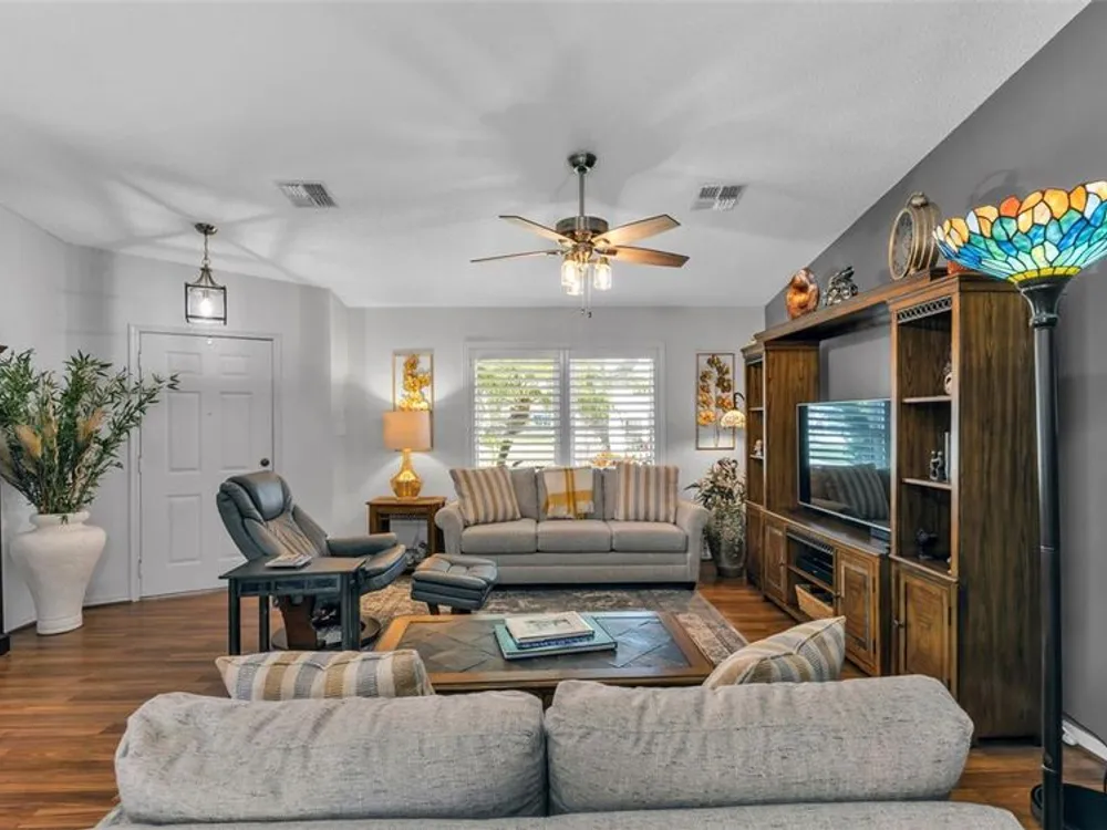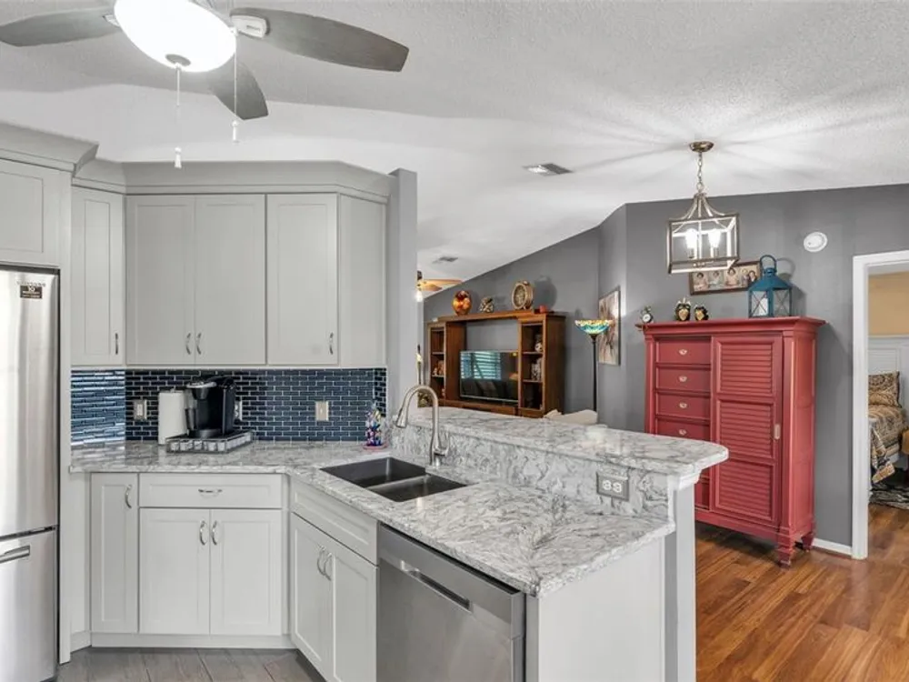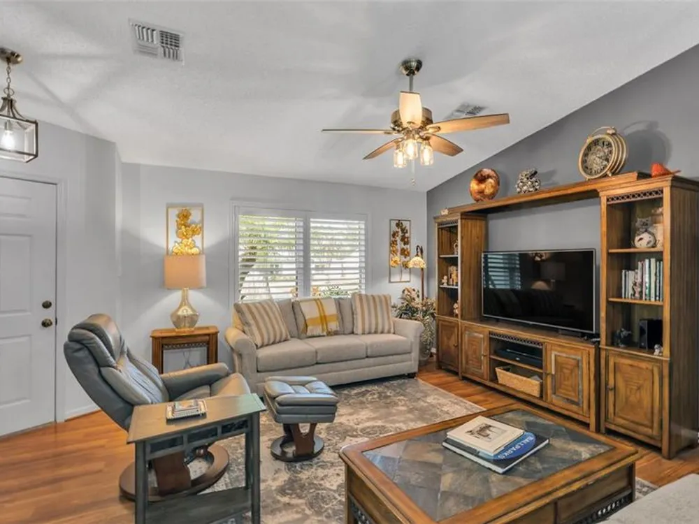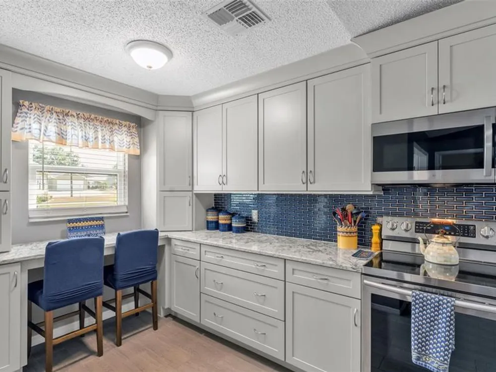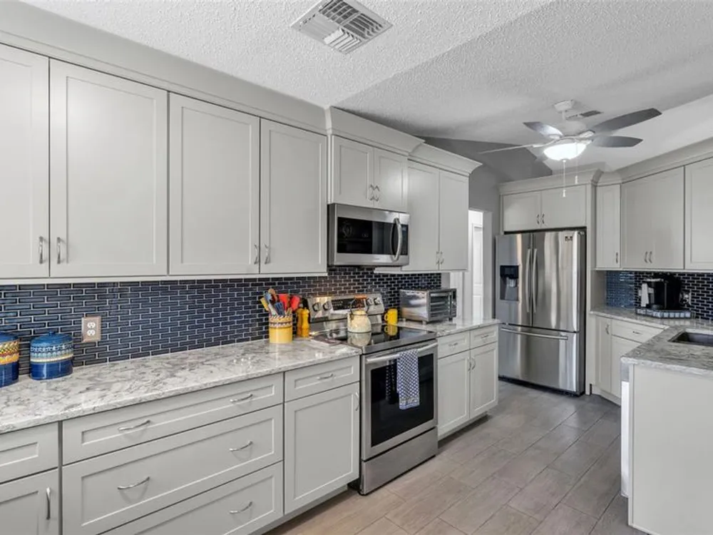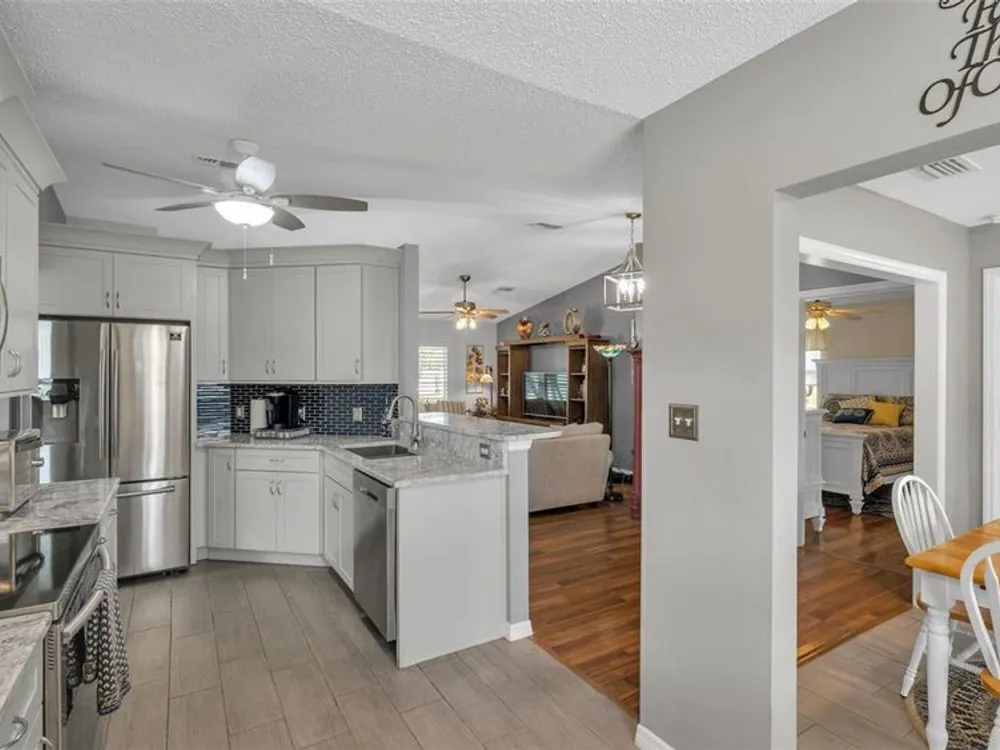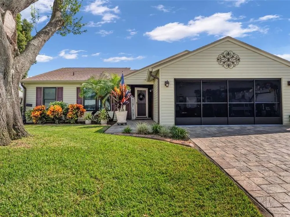 This is the pristine home you’ve been looking for in Central Florida! Presenting 6096 Kittiwake Drive… a move-in-ready, beautifully renovated 3 bedroom, 2 bathroom home located in sought-after 55+ community “Sandpiper Golf & Country Club.” As you walk up the paver driveway, notice the St. Augustine grass, concrete bordered landscaping, paver walkway around the house, new garage screen and fresh paint. Step inside to the spacious living room and enjoy the high ceilings, natural light and quality kitchen with all wood soft-close custom cabinets, quartz counters, new Samsung stainless appliances and tiled backsplash. French doors in the dining area lead out onto the newly installed paver patio with retaining wall, grilling area and awnings for shade. Imagine enjoying coffee here in the mornings or those famous Florida sunsets in the evenings! Back inside, the primary suite has double closets and ensuite bathroom with walk-in shower. The guest bedroom and bathroom are located on the other side of the kitchen, near the convenient indoor laundry room. The third bedrooms is positioned at the back of the home and can be private or open to the primary suite, making the perfect hobby room, home gym, office space, etc. Other features include luxury vinyl plank, porcelain floor tile, specialty vinyl flooring in the garage, brand new 50 gallon water heater, new roof in 2019 with wind mitigation certificate to save on insurance costs, HVAC installed in 2019, new vinyl windows, new bathroom vanities and high toilets, many new light fixtures, new doors & hardware, plus window treatments throughout. Sandpiper Golf & Country Club is an active and popular community featuring two clubhouses, pool tables, fitness center, tennis/pickleball courts, shuffleboard, a restaurant and manicured golf course. Your quarterly dues also include internet and cable. The location is ideal with easy access to the interstate, medical facilities, restaurants, sporting events, theme parks and area attractions. Set up your private tour today!