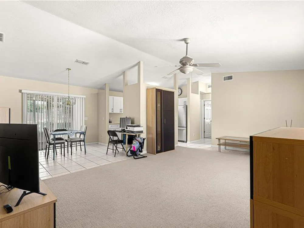 - Cathedral Ceiling(s), Ceiling Fan(s), Living/Dining Room, Main Level Primary, Window Treatments