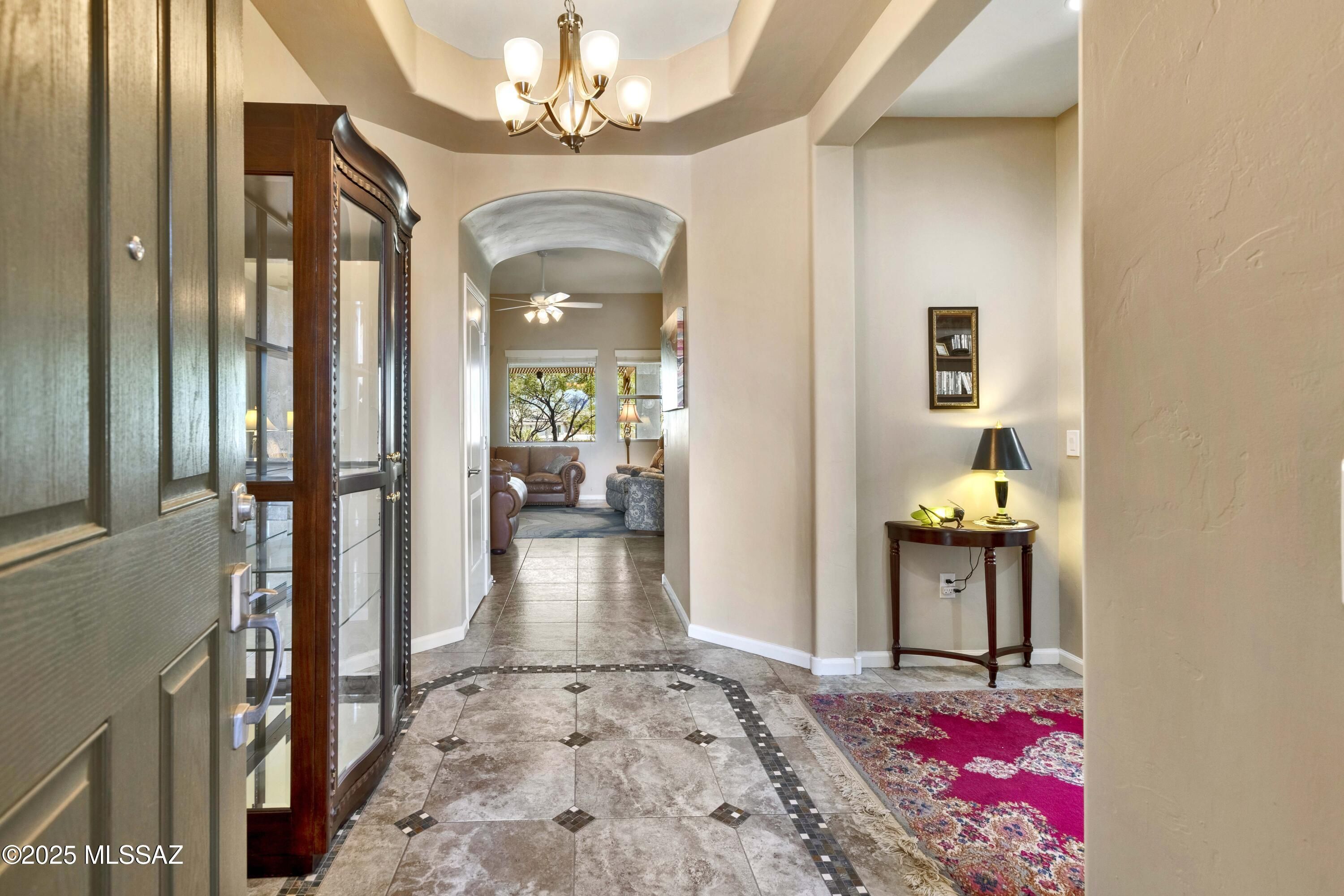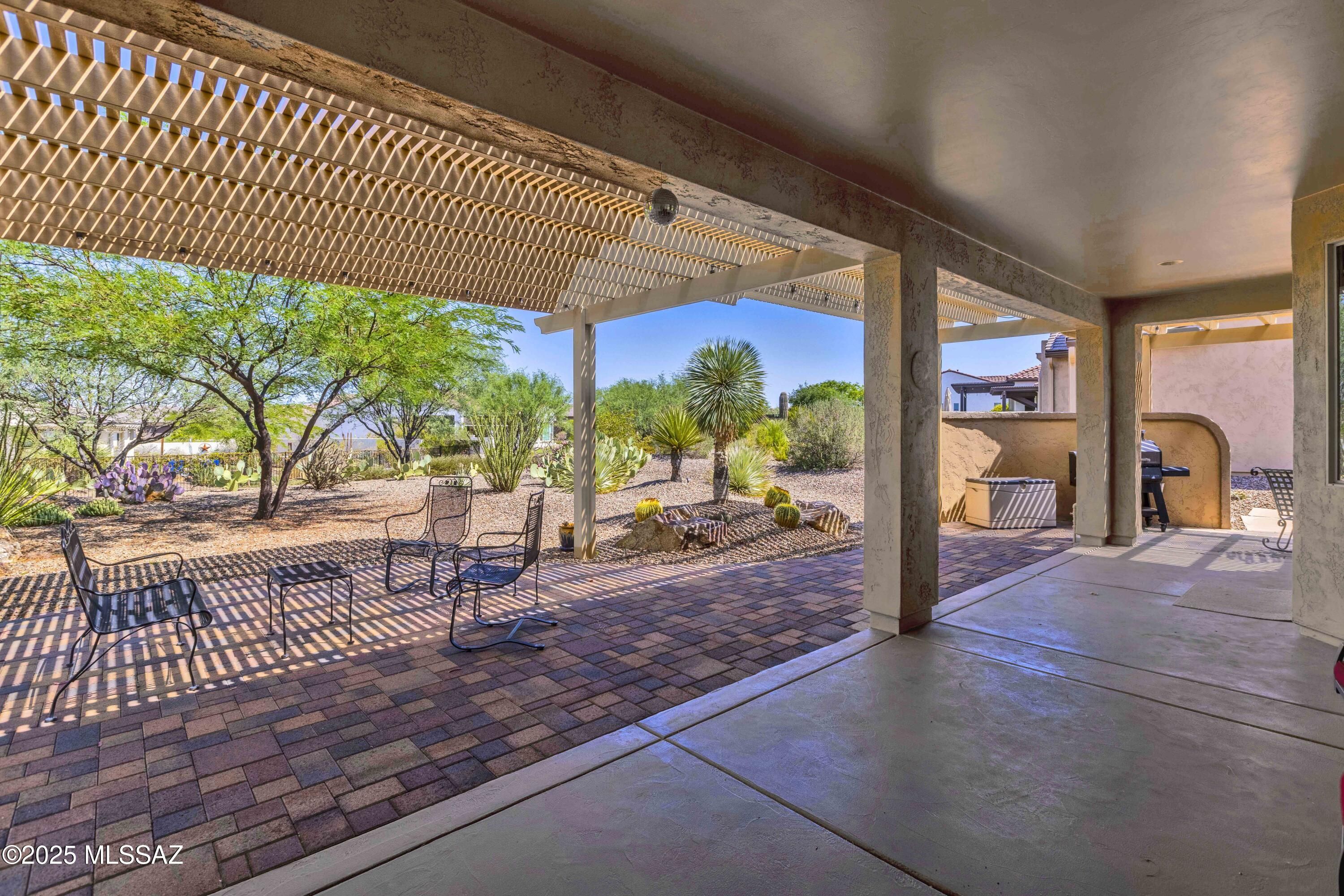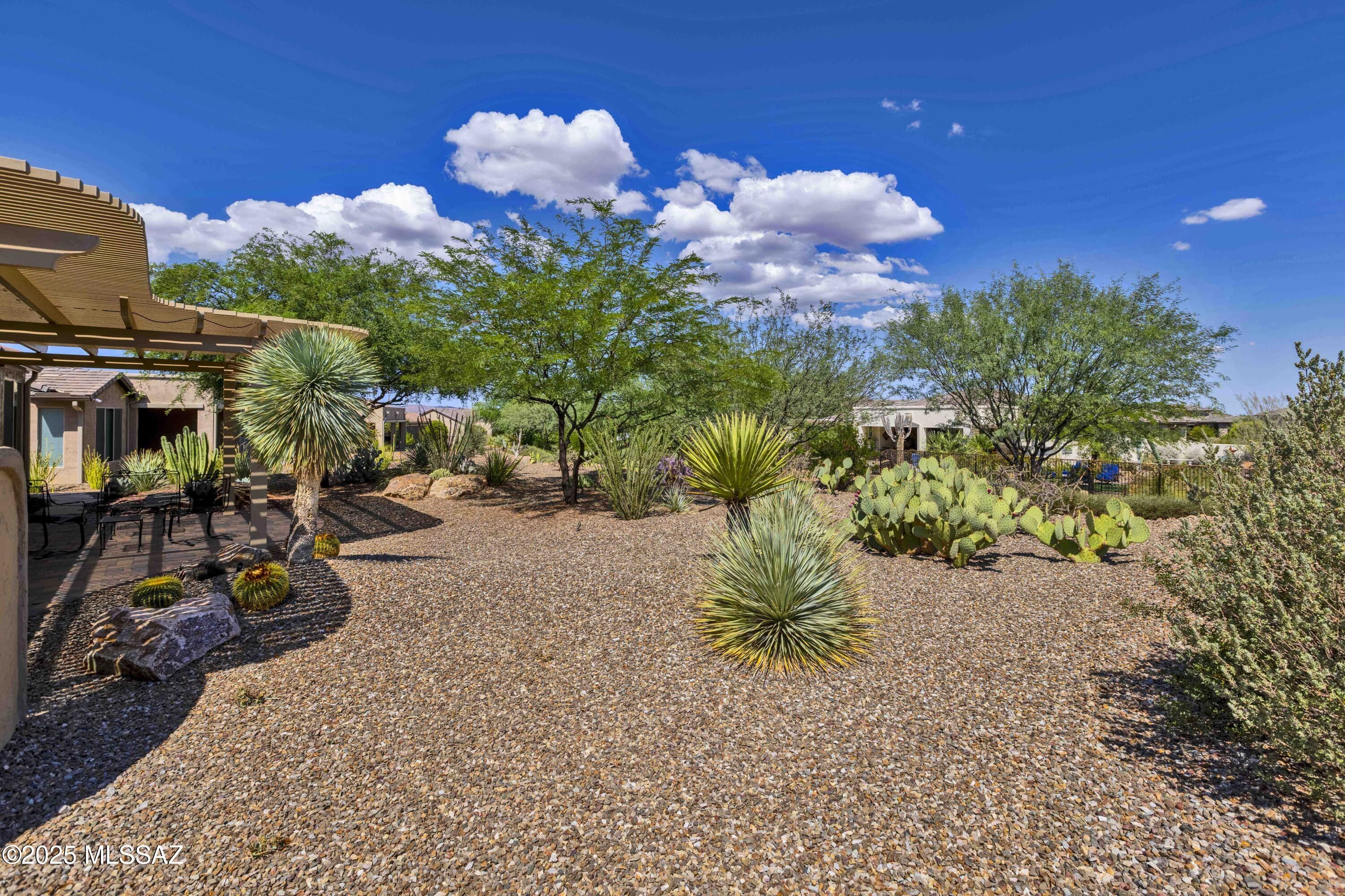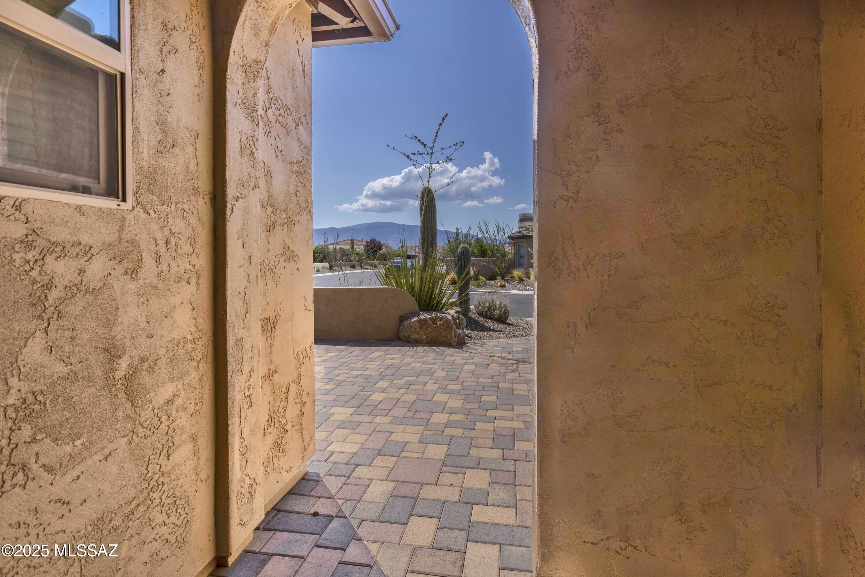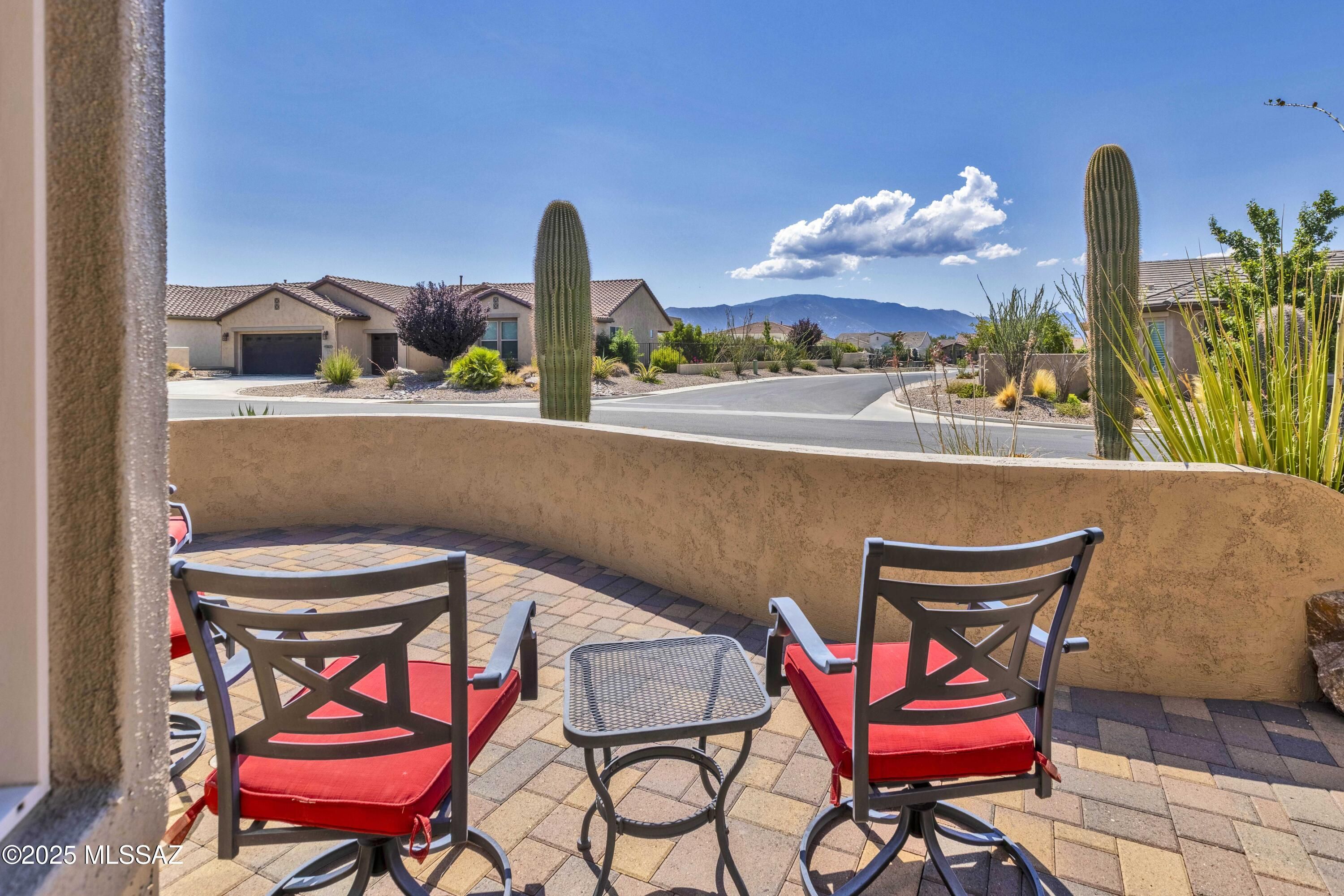 Welcome to this 1,986 sq. ft. Artesa Model on a premier lot in SaddleBrooke Ranch. Thoughtfully sited for privacy and efficiency, the home enjoys Mount Lemmon views from the shaded front patio and added space from the arroyo behind. Inside, arched accents, upgraded tile, plantation shutters, and custom cabinetry create timeless comfort. The kitchen shines with granite counters, Blanco sink, soft-close cabinets, and under/over cabinet lighting. Outdoor living features pergolas with lighting, sealed patios, mesquite trees, and gas/electric grill hookups. A 4-ft extended garage with storage and golf cart space completes this meticulously maintained property.