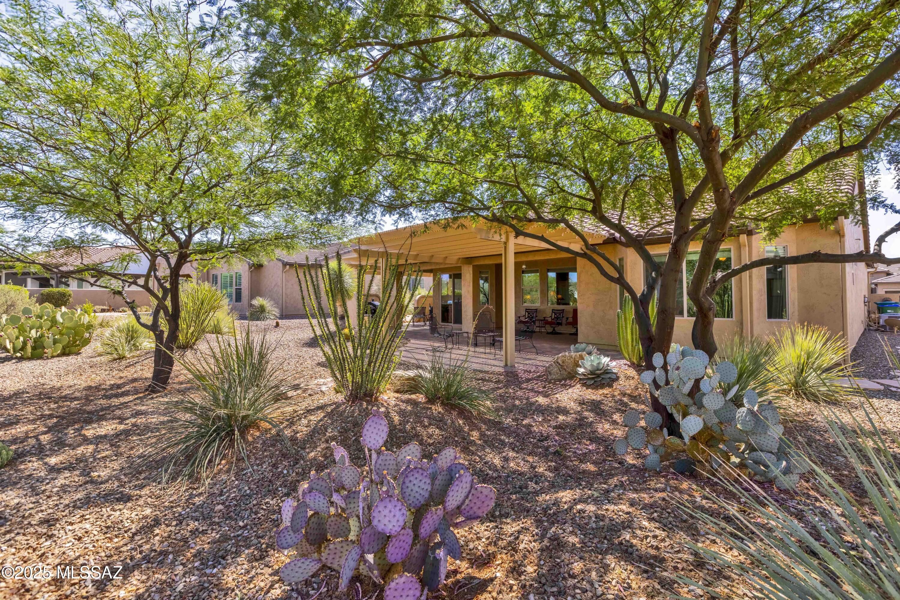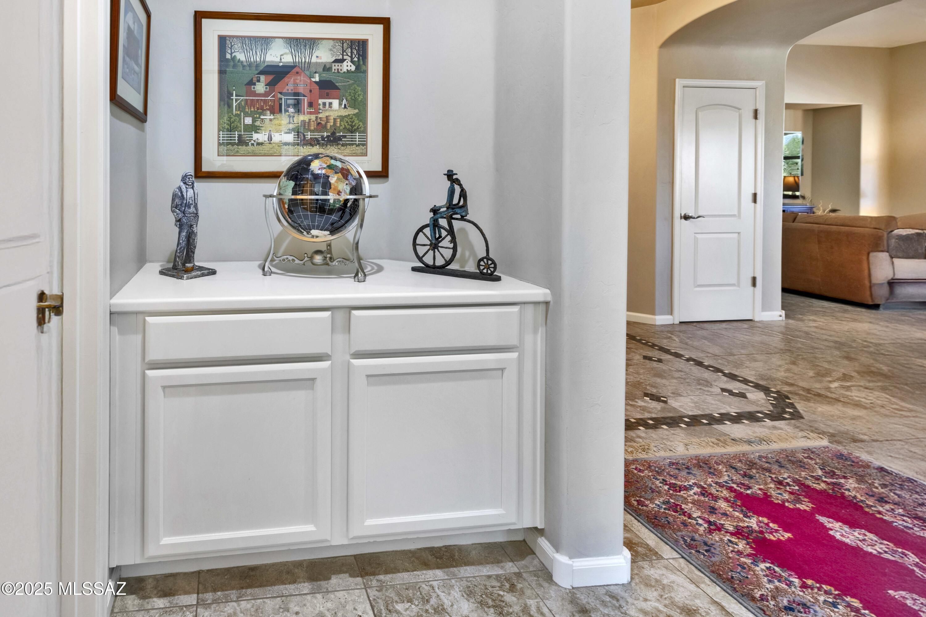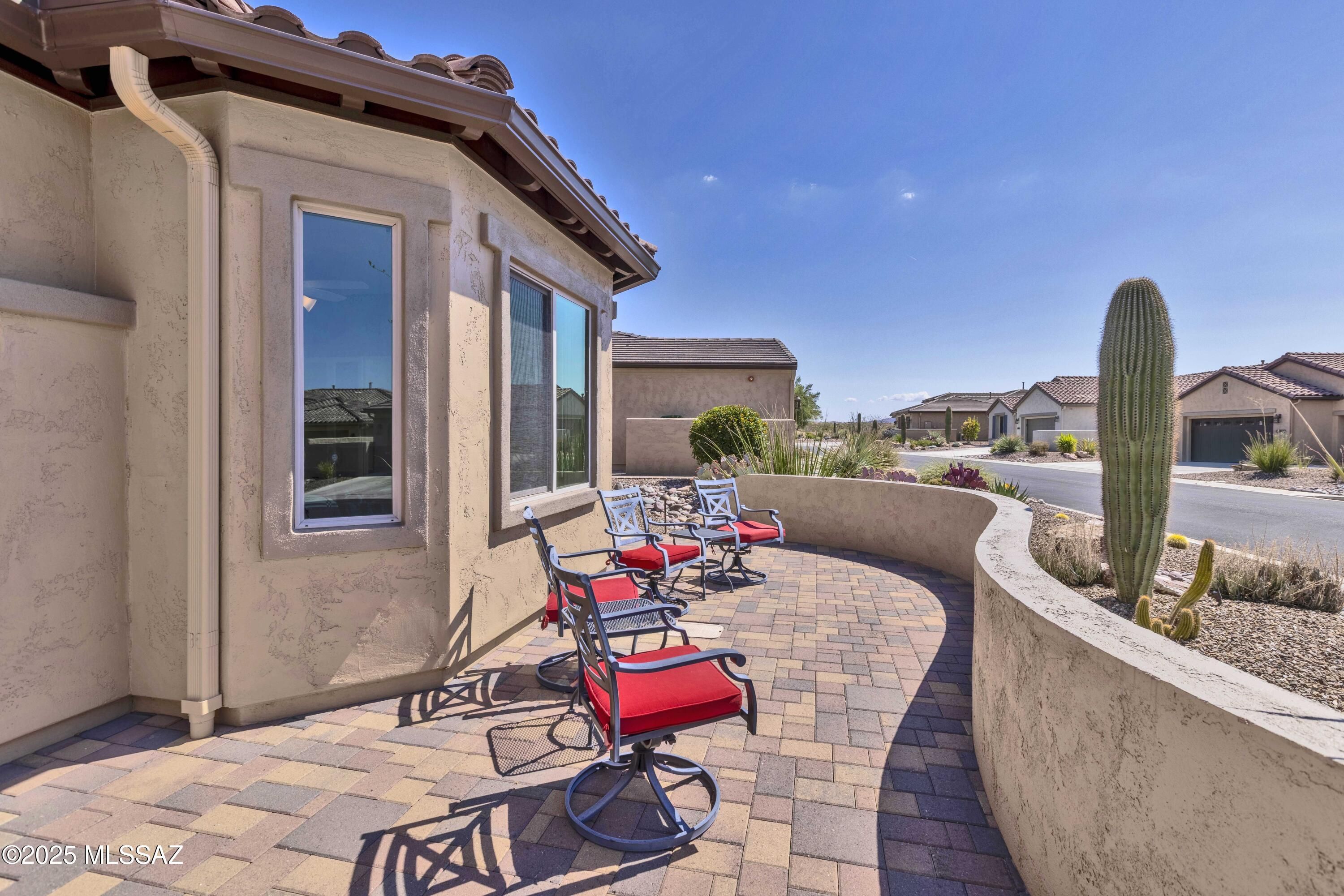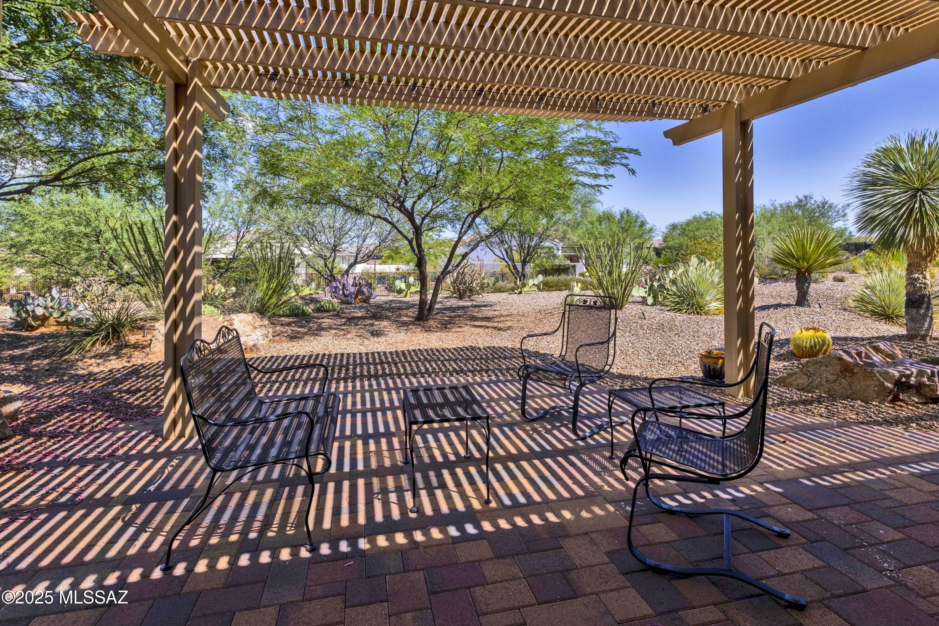 Welcome to this 1,986 sq. ft. Artesa Model on a premier lot in SaddleBrooke Ranch. Thoughtfully sited for privacy and efficiency, the home enjoys Mount Lemmon views from the shaded front patio and added space from the arroyo behind. Inside, arched accents, upgraded tile, plantation shutters, and custom cabinetry create timeless comfort. The kitchen shines with granite counters, Blanco sink, soft-close cabinets, and under/over cabinet lighting. Outdoor living features pergolas with lighting, sealed patios, mesquite trees, and gas/electric grill hookups. A 4-ft extended garage with storage and golf cart space completes this meticulously maintained property.