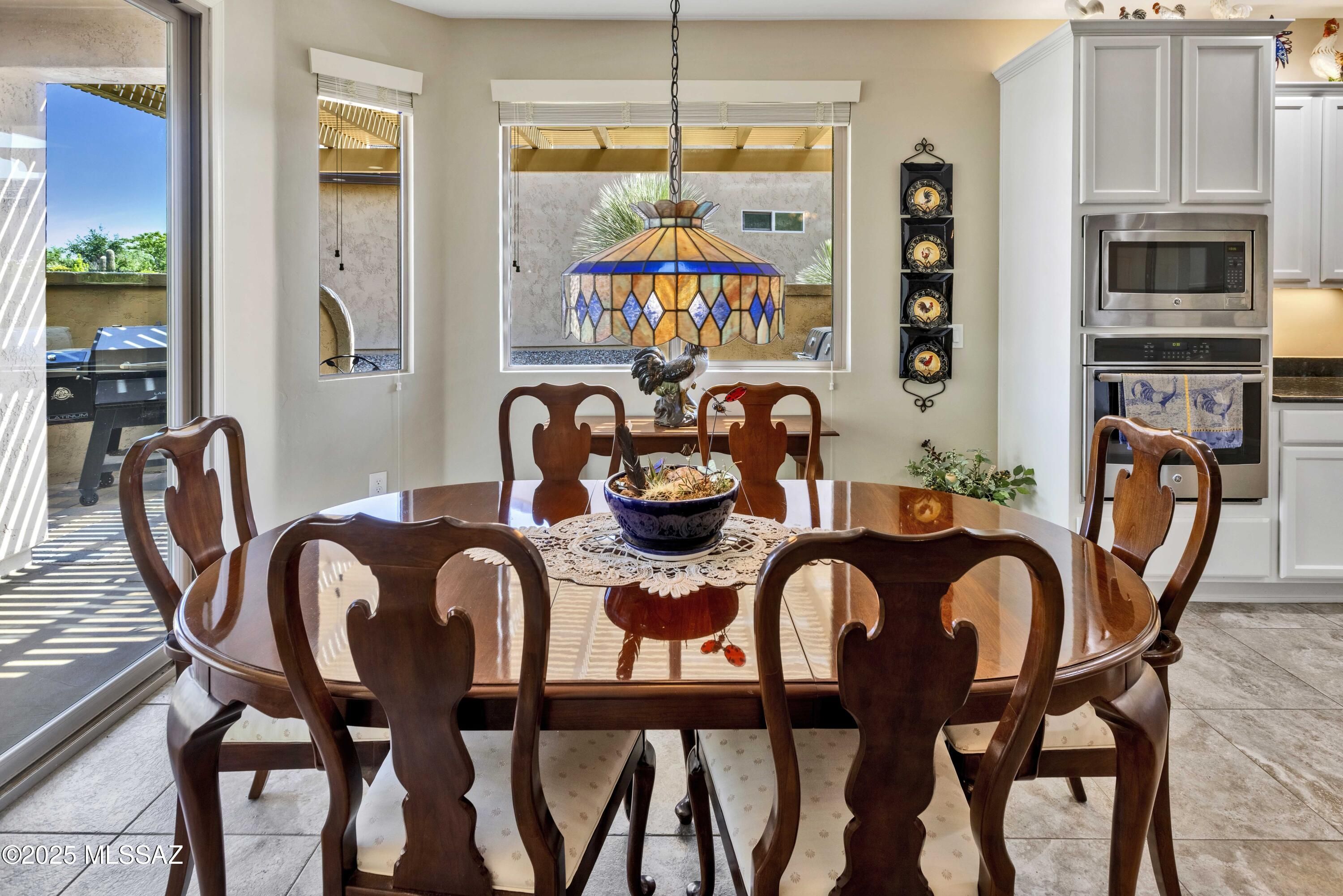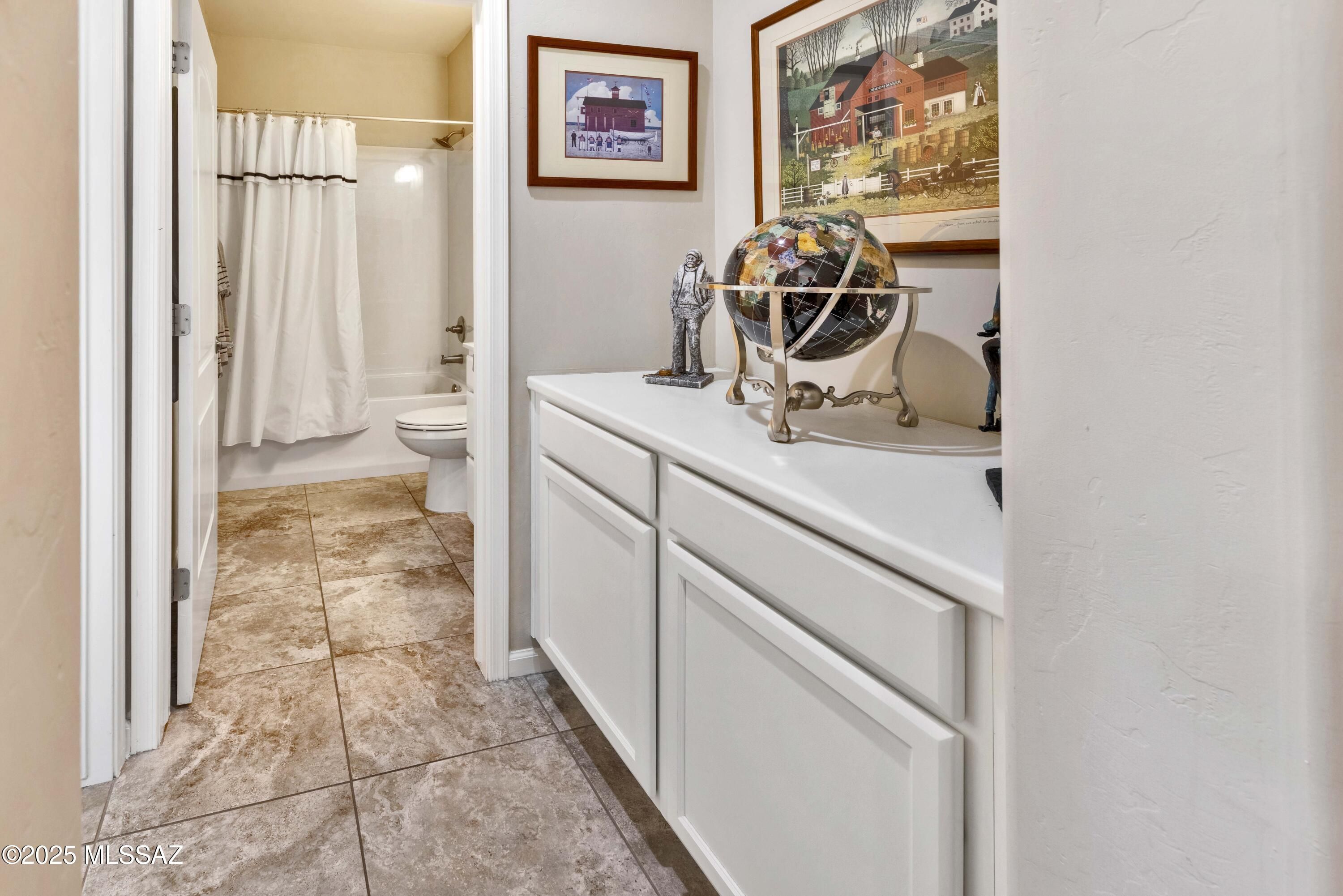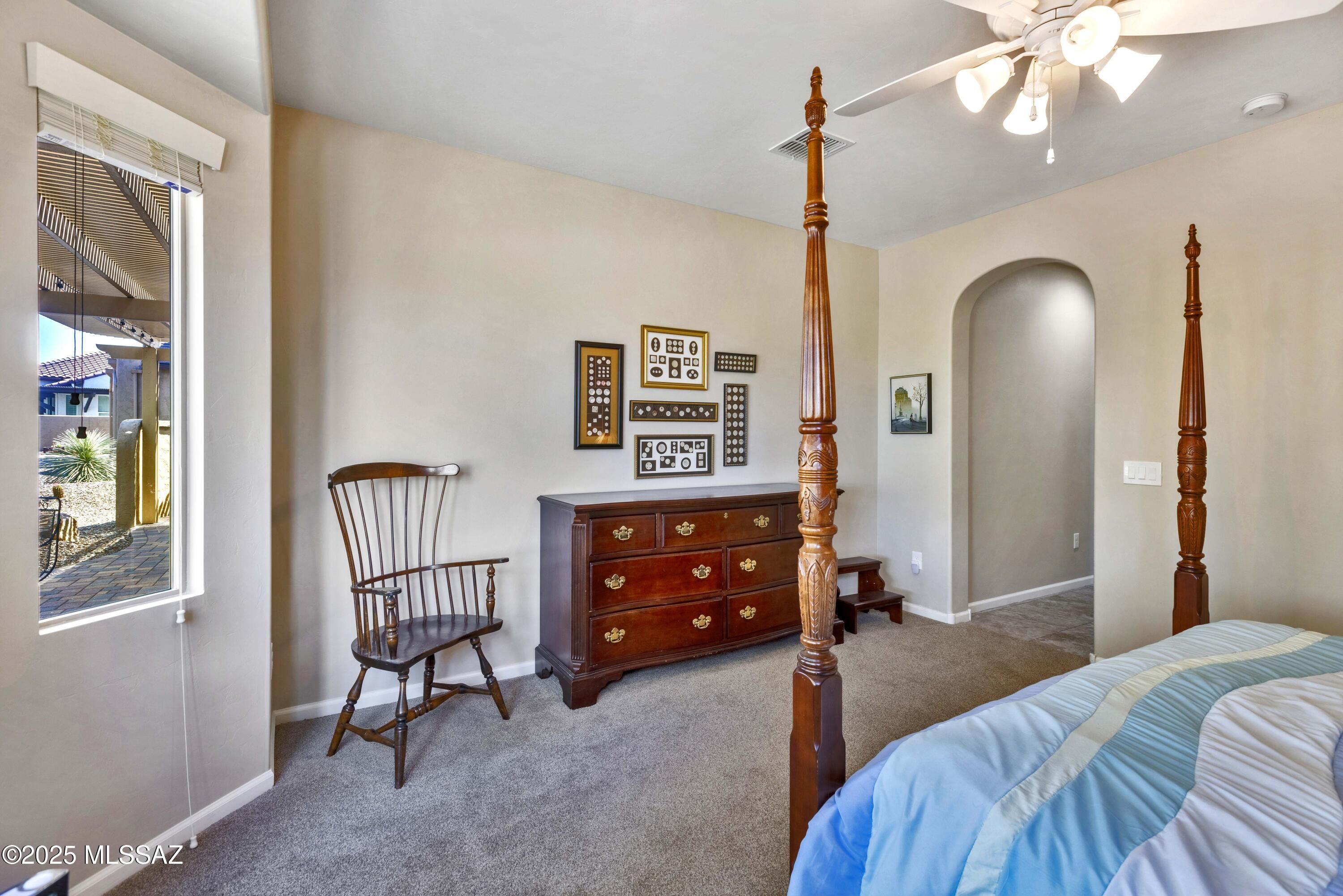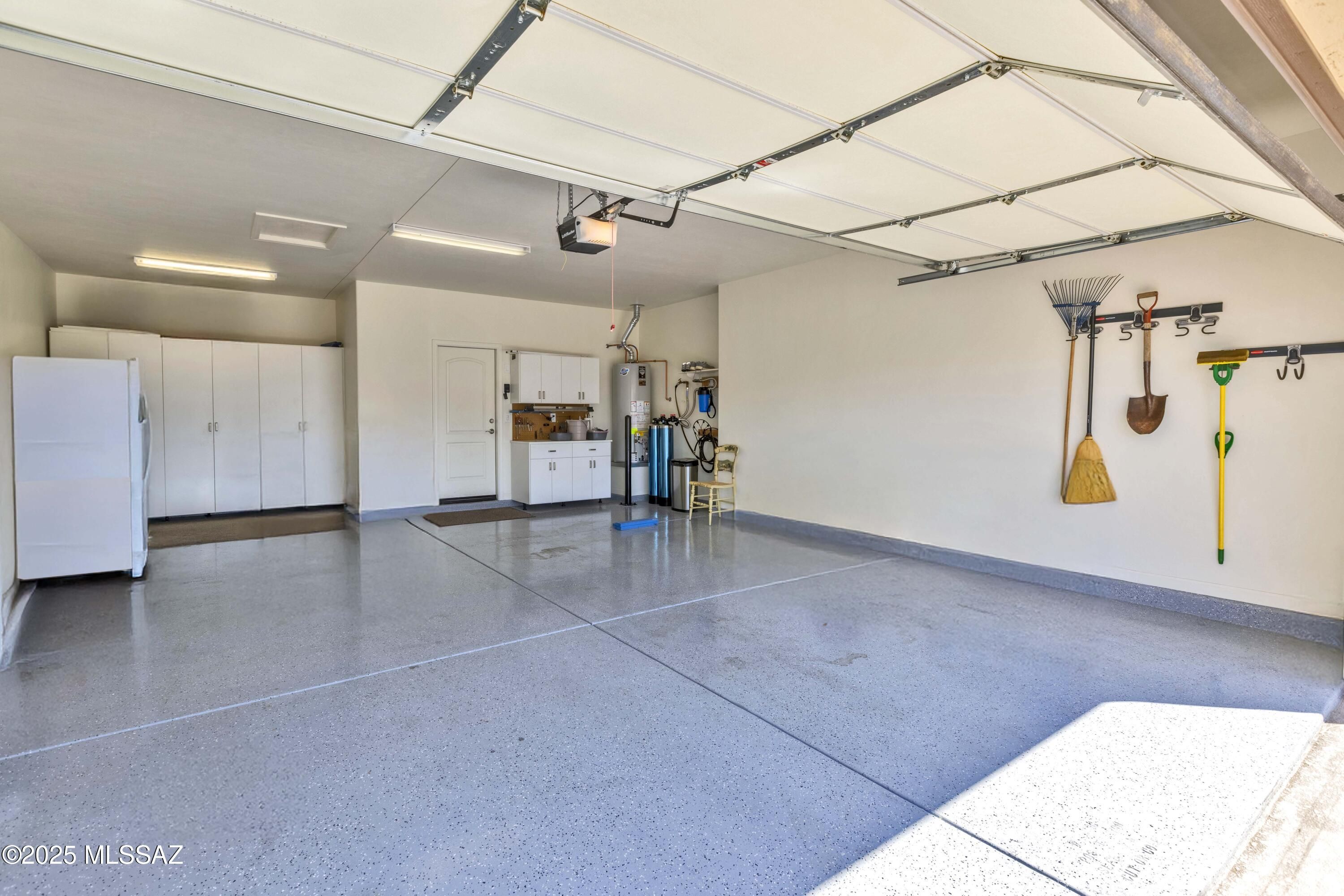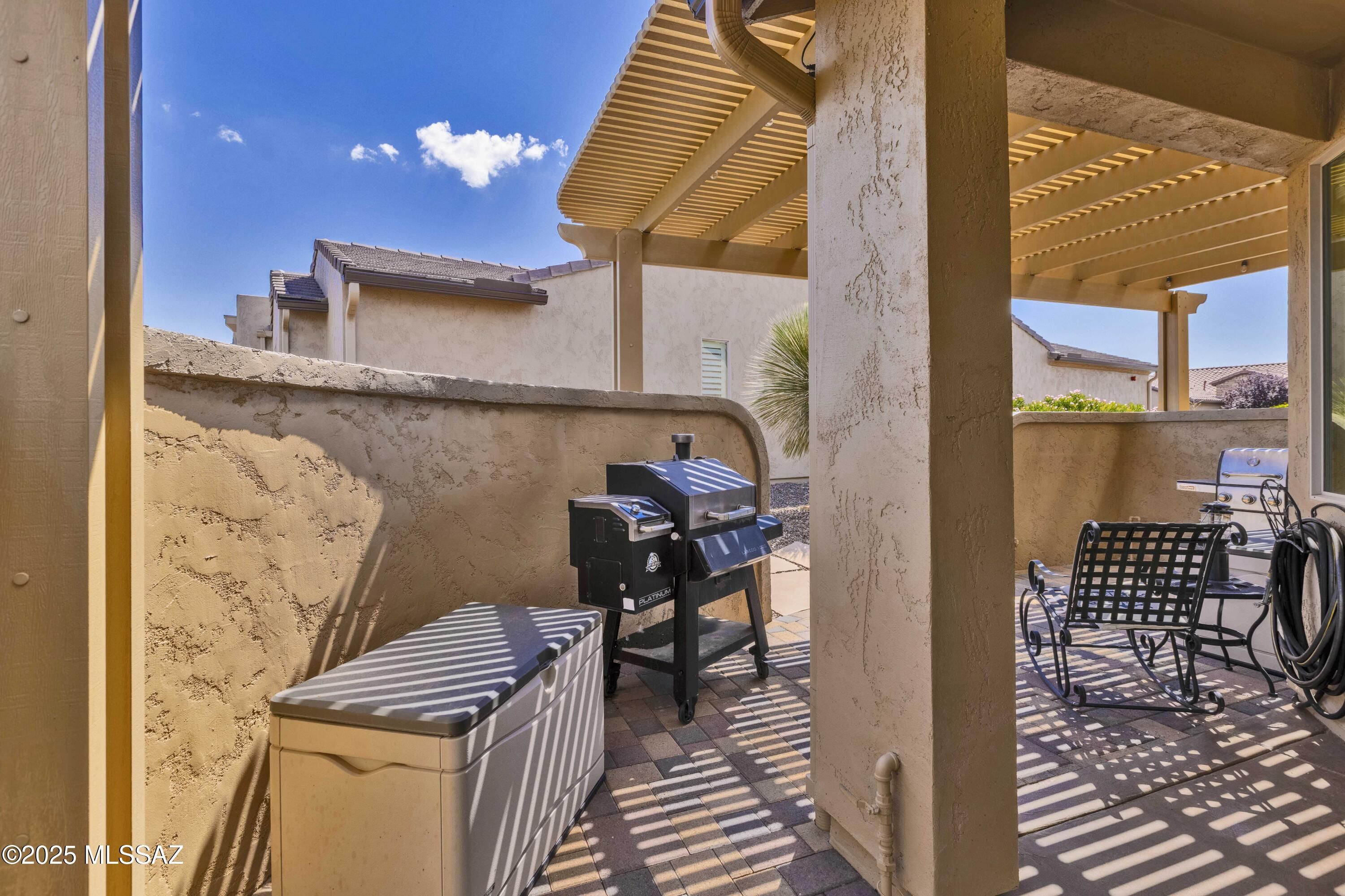 Welcome to this 1,986 sq. ft. Artesa Model on a premier lot in SaddleBrooke Ranch. Thoughtfully sited for privacy and efficiency, the home enjoys Mount Lemmon views from the shaded front patio and added space from the arroyo behind. Inside, arched accents, upgraded tile, plantation shutters, and custom cabinetry create timeless comfort. The kitchen shines with granite counters, Blanco sink, soft-close cabinets, and under/over cabinet lighting. Outdoor living features pergolas with lighting, sealed patios, mesquite trees, and gas/electric grill hookups. A 4-ft extended garage with storage and golf cart space completes this meticulously maintained property.
