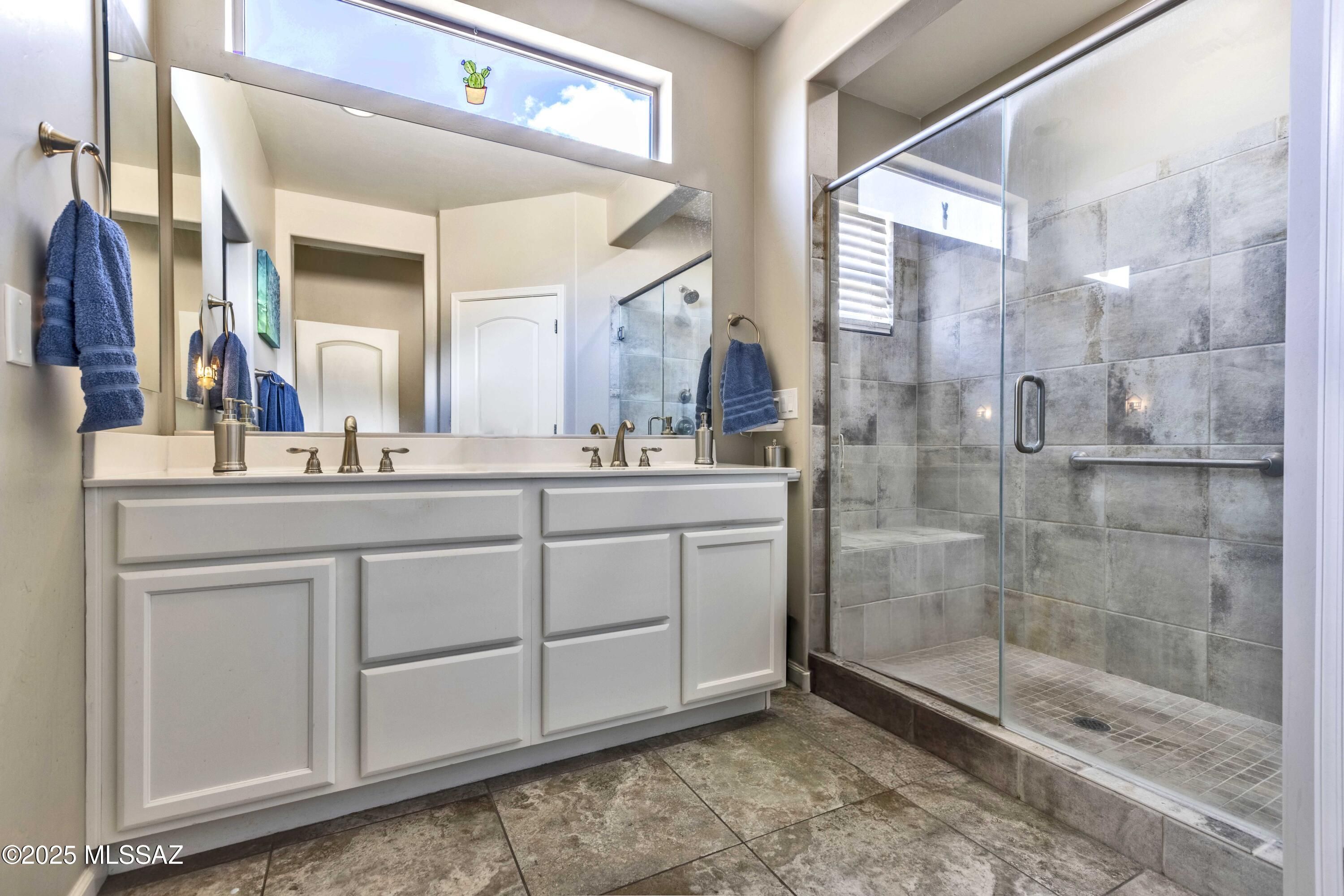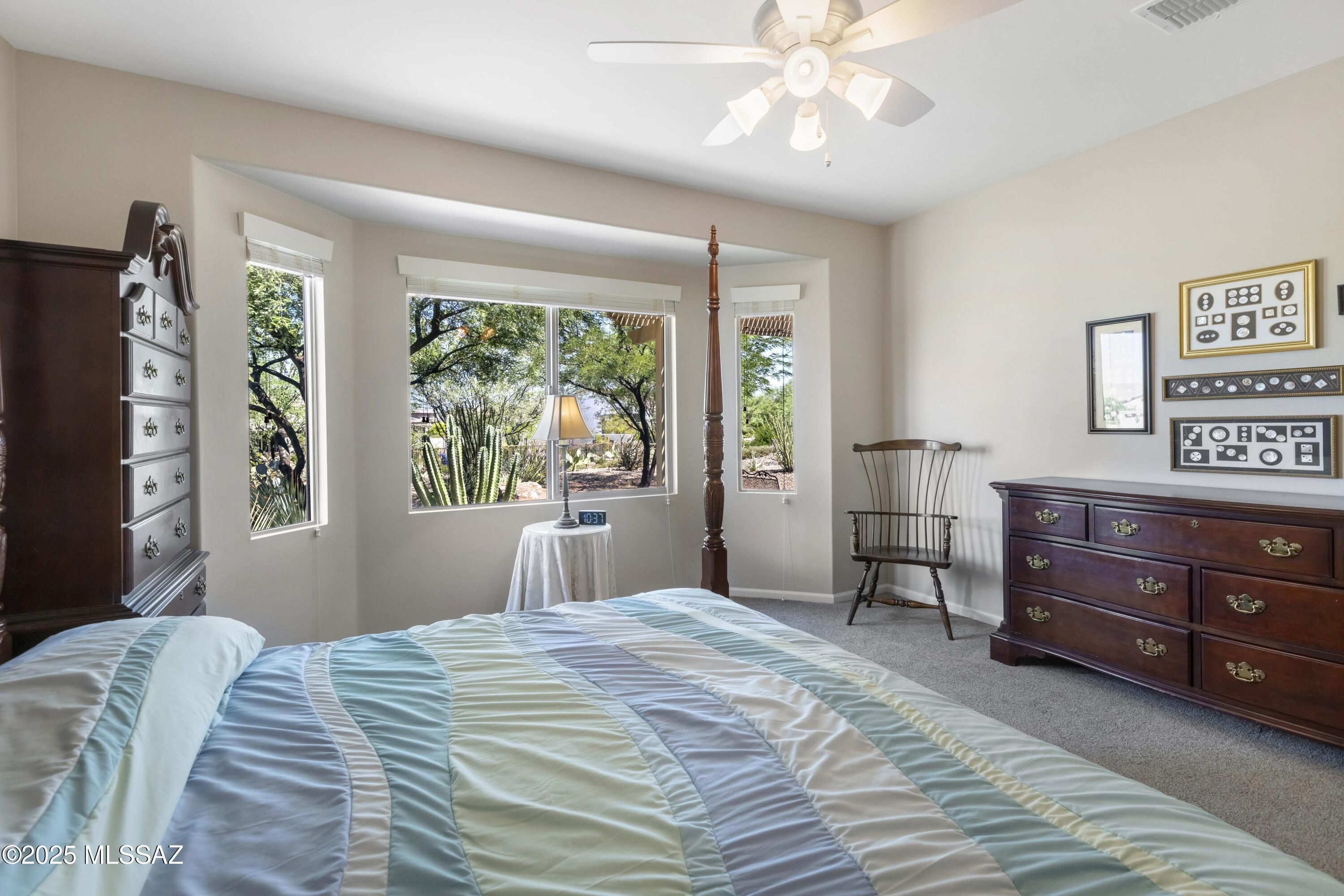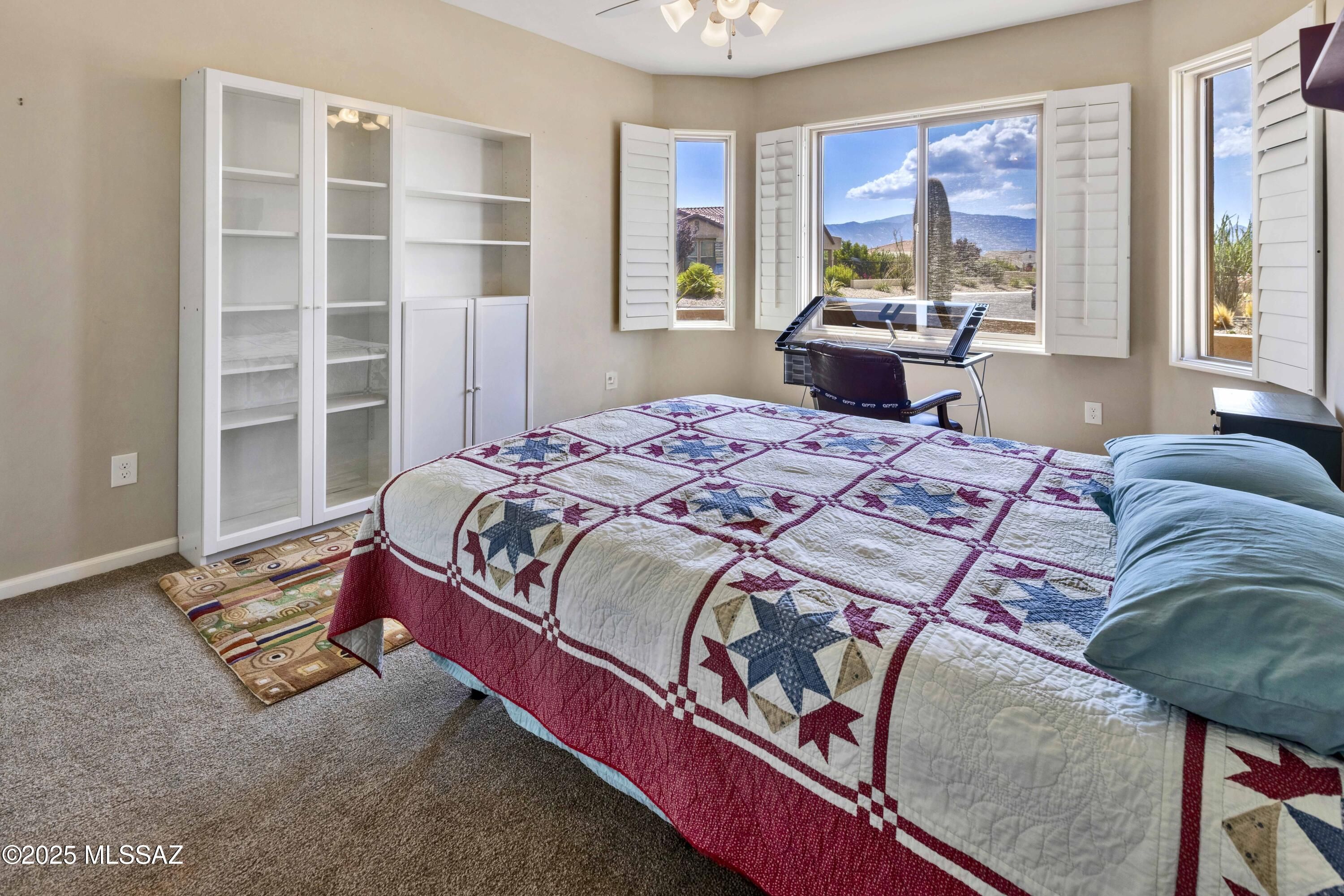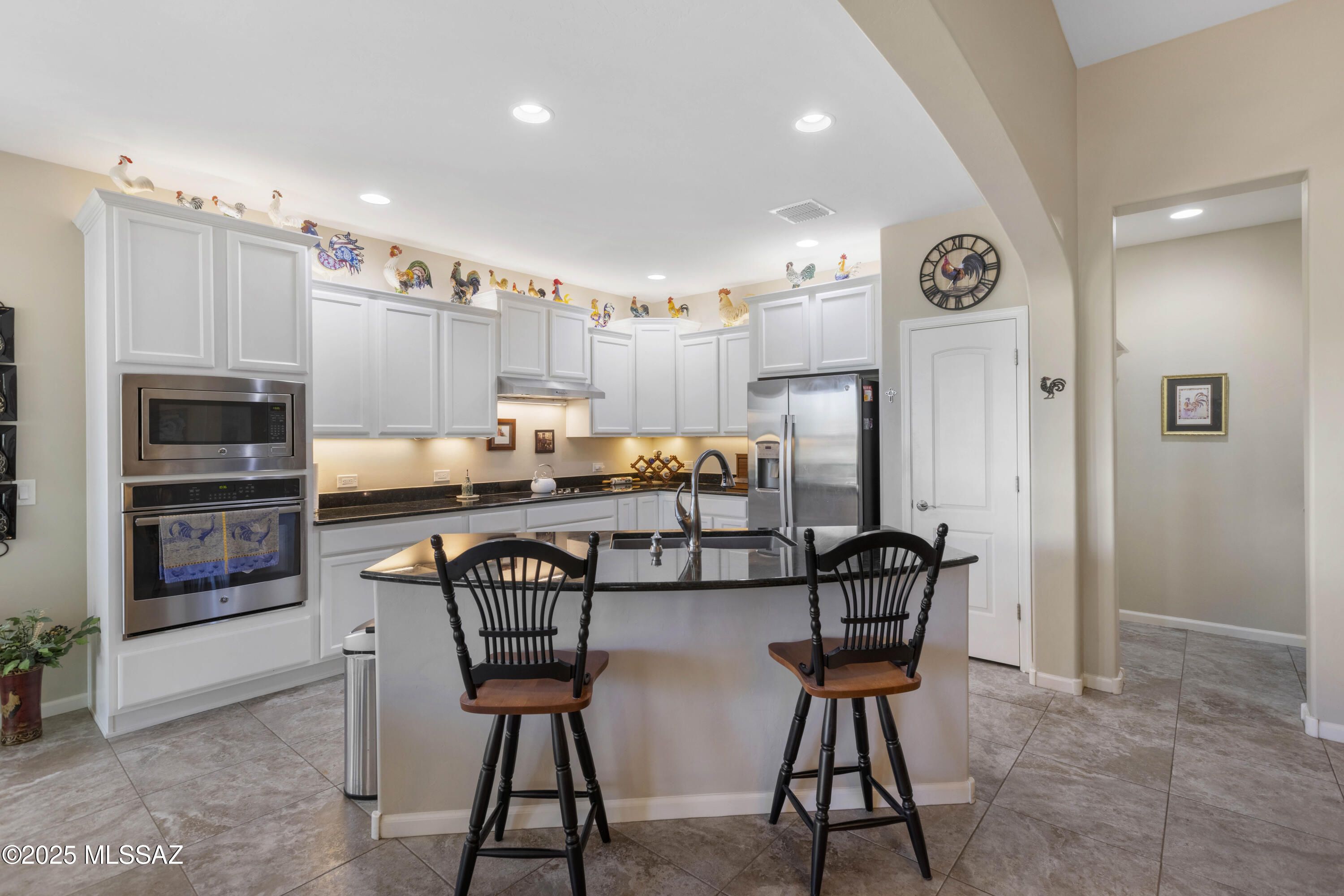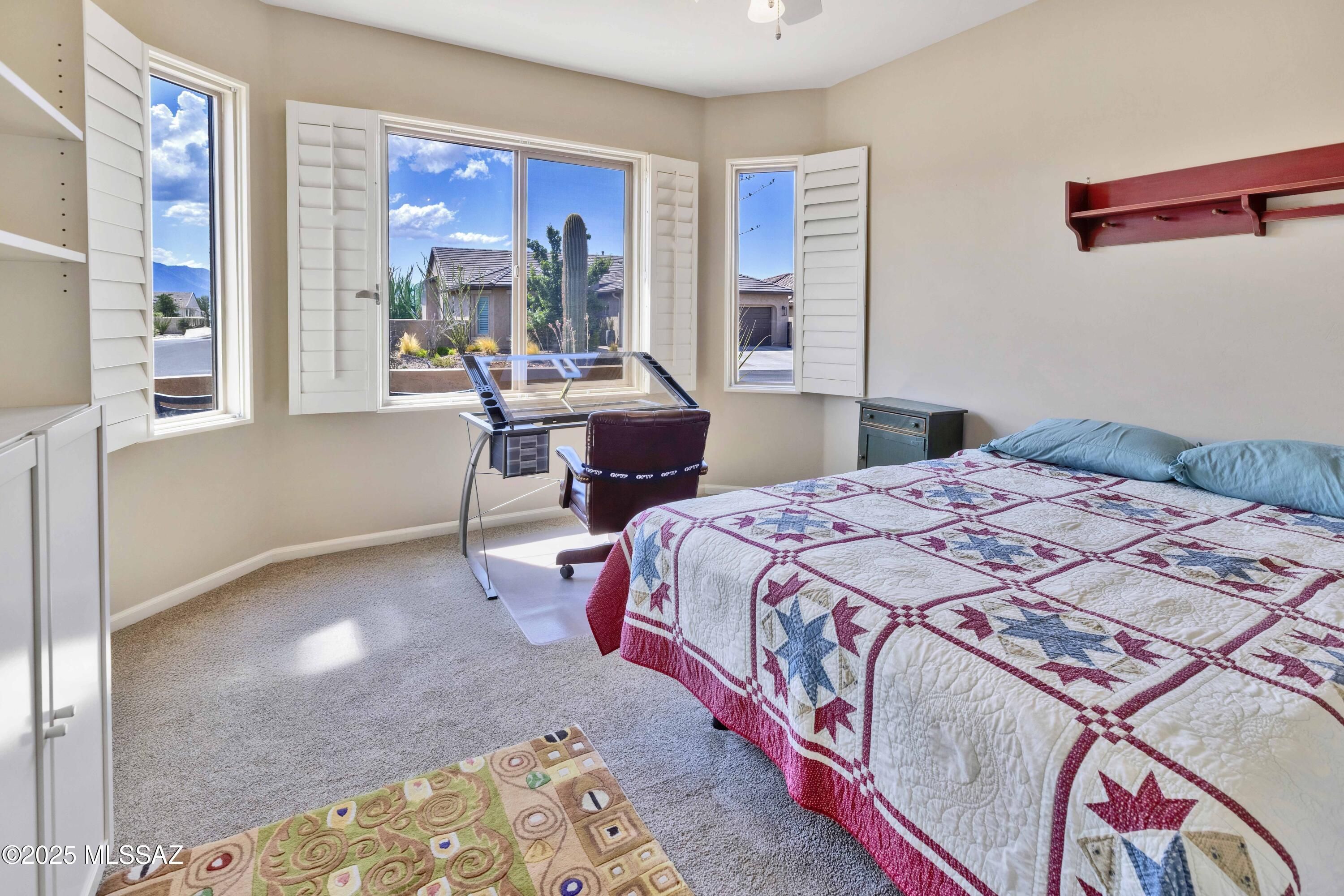 Welcome to this 1,986 sq. ft. Artesa Model on a premier lot in SaddleBrooke Ranch. Thoughtfully sited for privacy and efficiency, the home enjoys Mount Lemmon views from the shaded front patio and added space from the arroyo behind. Inside, arched accents, upgraded tile, plantation shutters, and custom cabinetry create timeless comfort. The kitchen shines with granite counters, Blanco sink, soft-close cabinets, and under/over cabinet lighting. Outdoor living features pergolas with lighting, sealed patios, mesquite trees, and gas/electric grill hookups. A 4-ft extended garage with storage and golf cart space completes this meticulously maintained property.