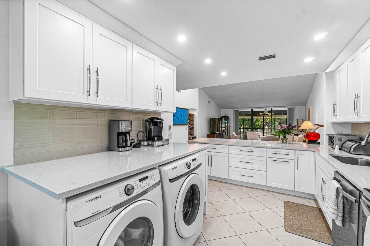 Welcome to this modern 2BR/2BA in Eastgate at Hunters Run Country Club. This updated gem spans 1421 square feet and offers stunning western golf and water views. The great room with a vaulted ceiling and skylights creates a bright and airy ambiance, while the open-concept kitchen boasts custom cabinetry, quartz countertops, and stainless steel appliances. The luxury vinyl plank flooring adds a touch of elegance, and the glass-enclosed Florida room provides a serene space to unwind and take in the picturesque surroundings. ROOF & SKYLIGHTS REPLACED IN 2023. Make this your home at Hunters Run today! The best of country club living is waiting for you at Hunters Run. Residents enjoy access to 54 holes of championship golf, 18 har-tru tennis courts, 12 pickleball courts, newly updated resort style clubhouse and pool, salons and spa, state of the art fitness center, six dining venues and so much more. Mandatory membership