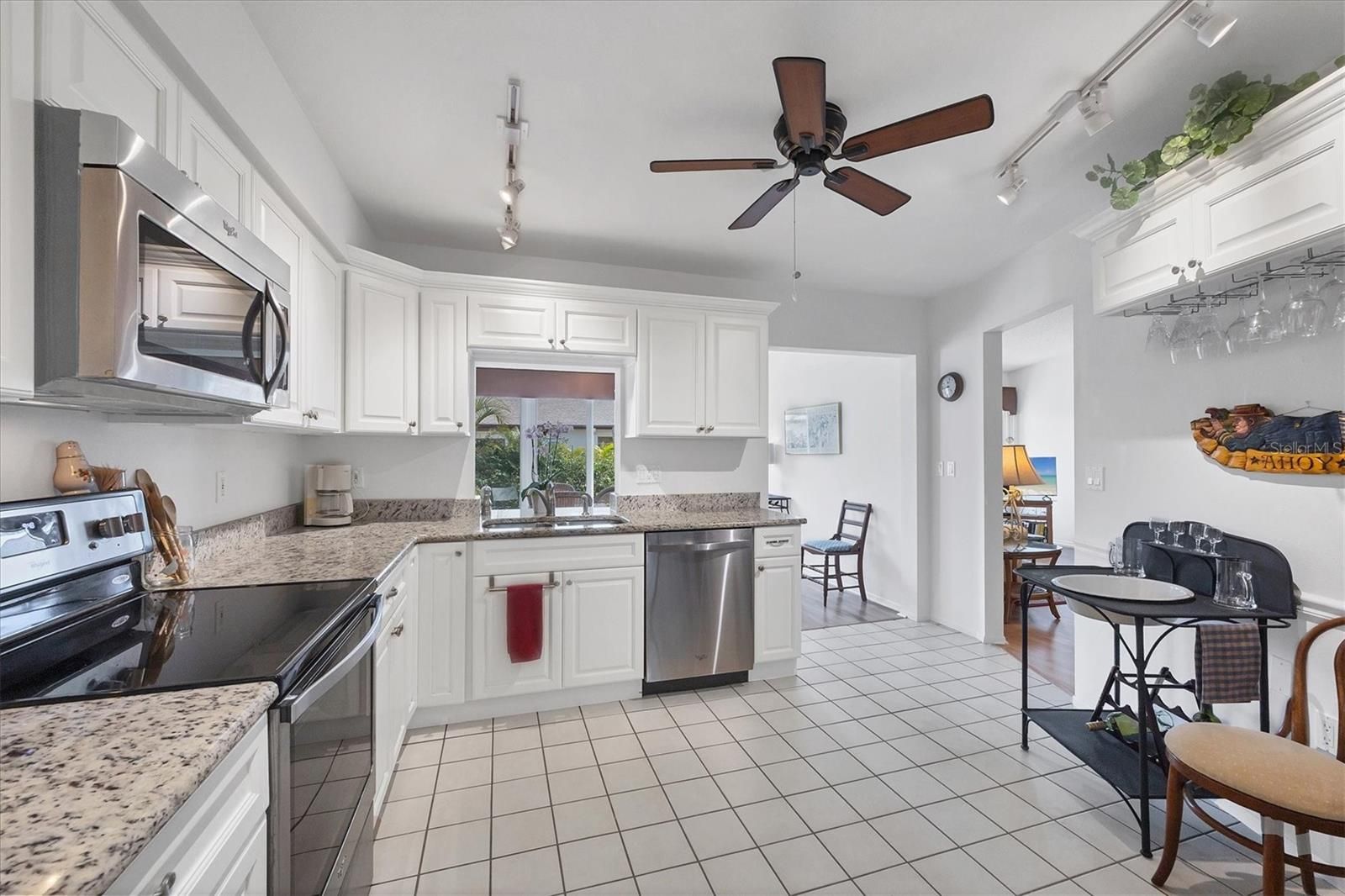 Welcome to your dream villa in the charming dog-friendly community of Foxwood! This beautifully furnished home is nestled at one of the highest elevations within the community and has not received any damage from storms. You are in a NON-FLOOD ZONE, ensuring PEACE OF MIND. The modern kitchen boasts elegant granite countertops and soft-close cabinets and drawers, making cooking a delight. Ample countertop space allows plenty of room for those Holiday pies, or breads. This exceptional Kitchen seamlessly opens to a light and bright dining room, perfect for entertaining, which leads out to a lovely outdoor patio—ideal for enjoying your morning coffee or evening gatherings. The primary suite is a true retreat, complete with a spacious walk-in closet that provides ample storage. The guest bathroom has been thoughtfully updated with a beautifully tiled shower, ensuring your guests feel right at home. Additional highlights include an inviting living space with a large nook area—ideal for a desk or card table and a new ceiling fan. Both bedrooms have new window treatments. The garage is complete with a screen, excellent for those lovely inland sea breezes, an epoxy-finished floor with built-in storage and a newer washer and dryer for your convenience. The roof and A/C system were replaced in 2023, in 2022 a backflow valve was replaced, and the hot water heater was replaced in 2019. Foxwood guests boast of the friendly clubhouse, warm pool and sidewalks as well as the convenience of a low maintenance 55 and over lifestyle. Don’t miss the opportunity to make this stunning villa your own in the welcoming Foxwood community!