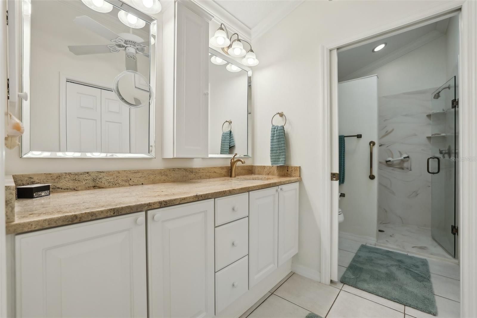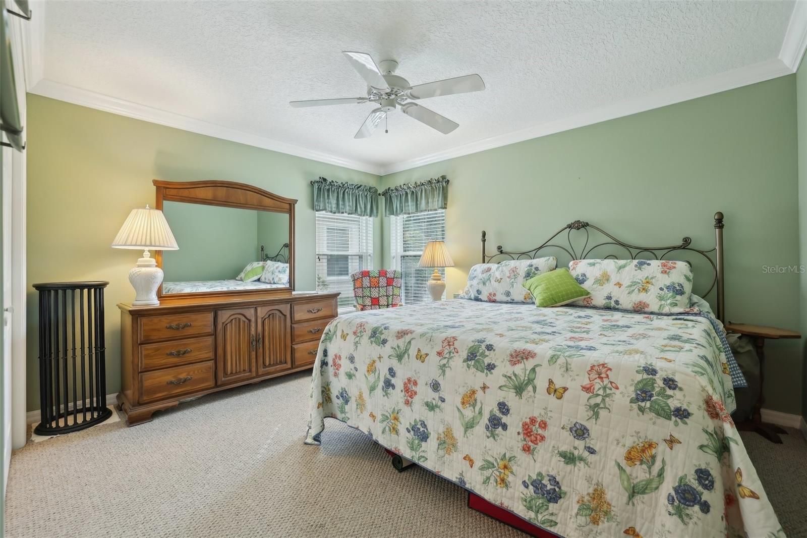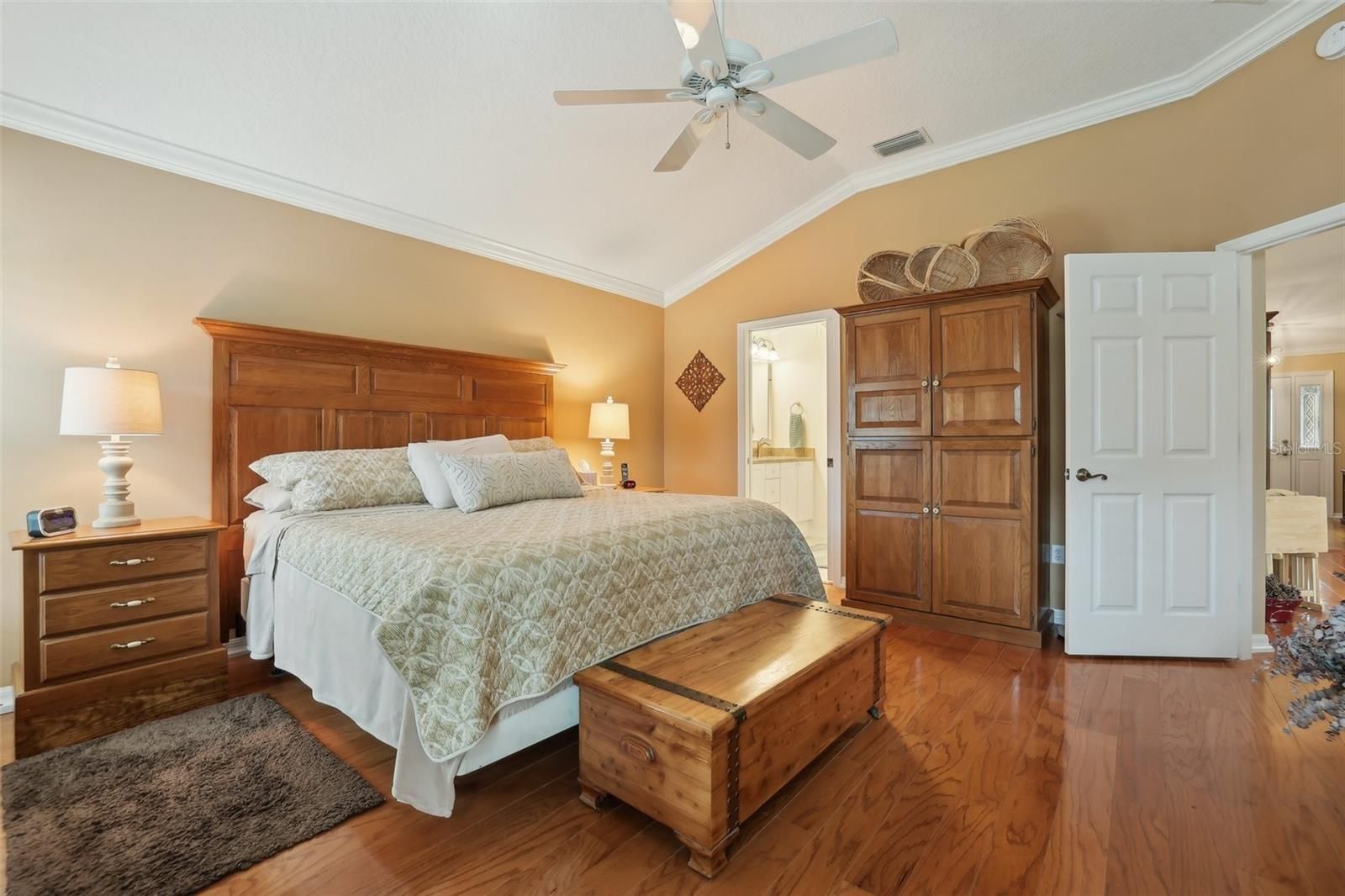 - Built-in Features, Ceiling Fan(s), Crown Molding, Eat-in Kitchen, High Ceilings, Living/Dining Room, Main Level Primary, Stone Counters, Walk-In Closet(s)