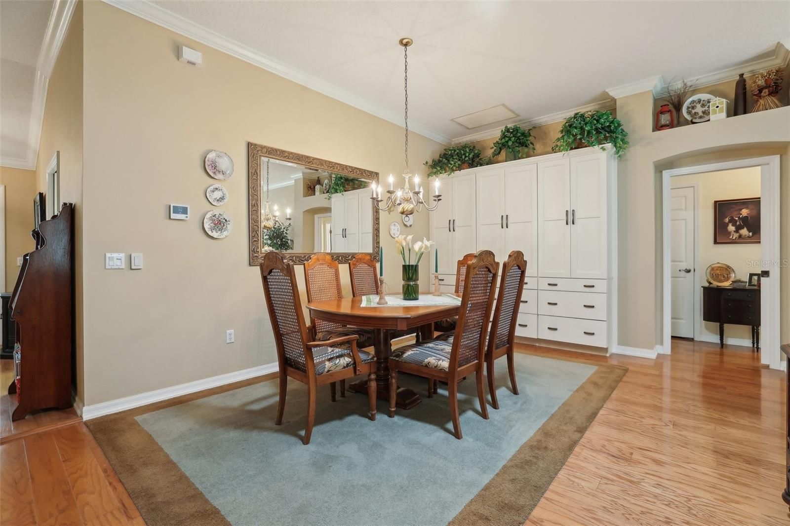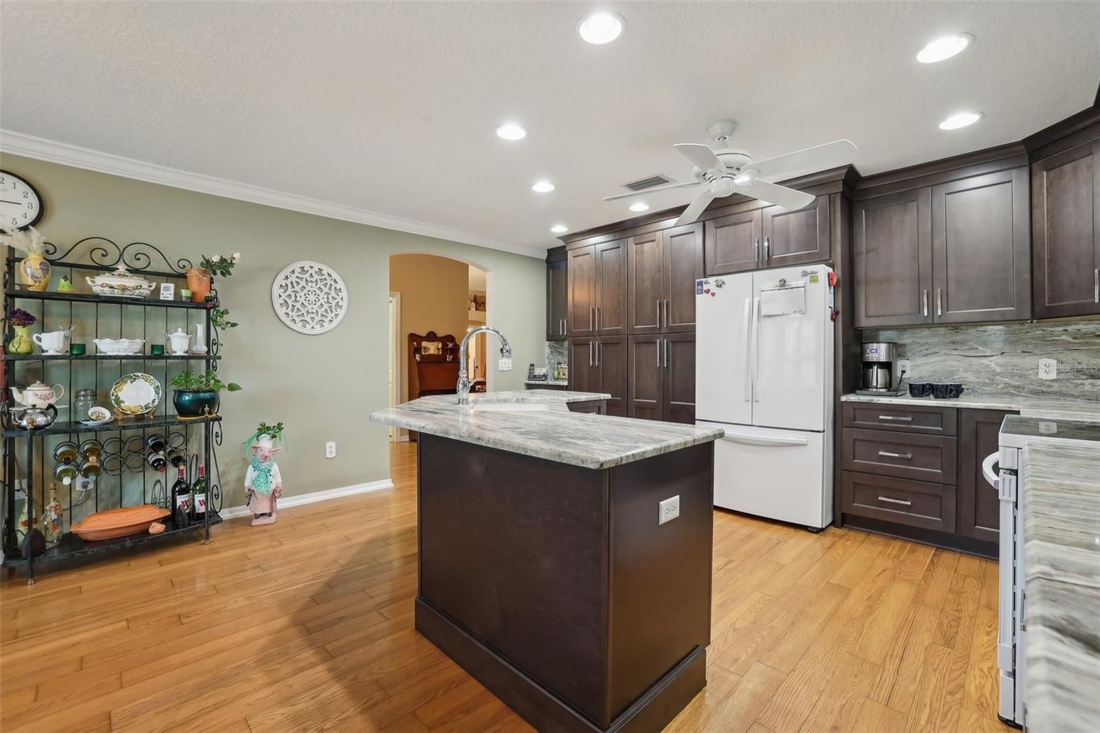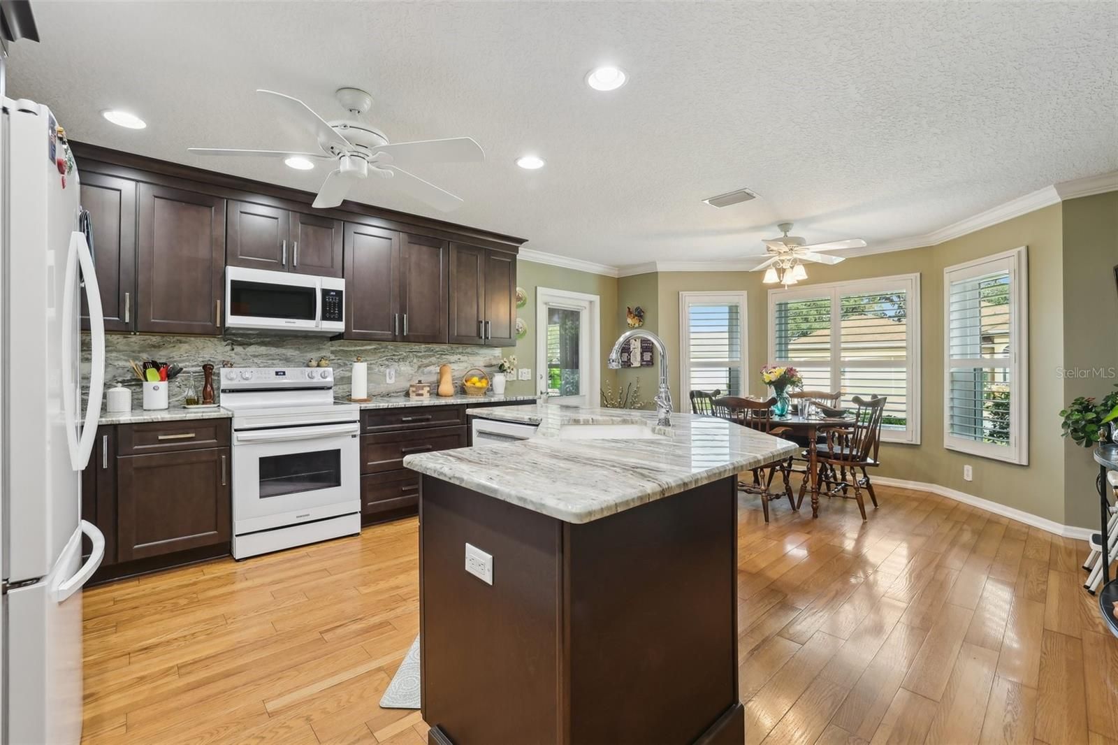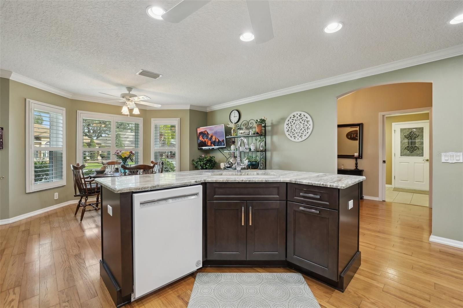 - Built-in Features, Ceiling Fan(s), Crown Molding, Eat-in Kitchen, High Ceilings, Living/Dining Room, Main Level Primary, Stone Counters, Walk-In Closet(s)