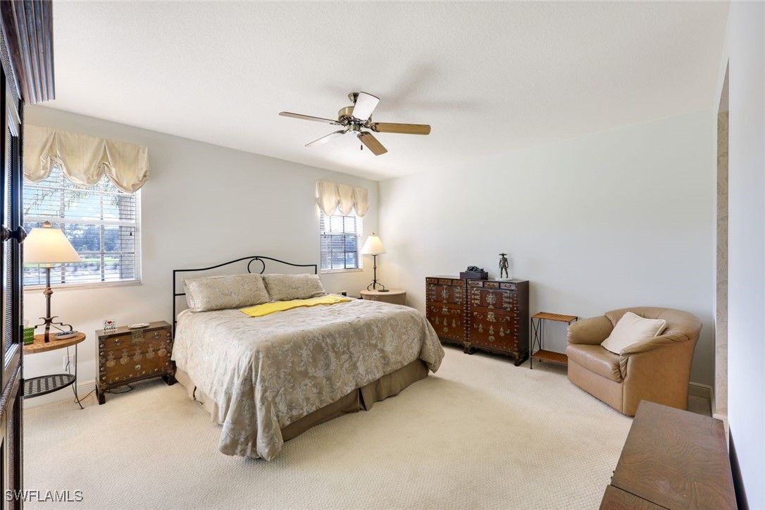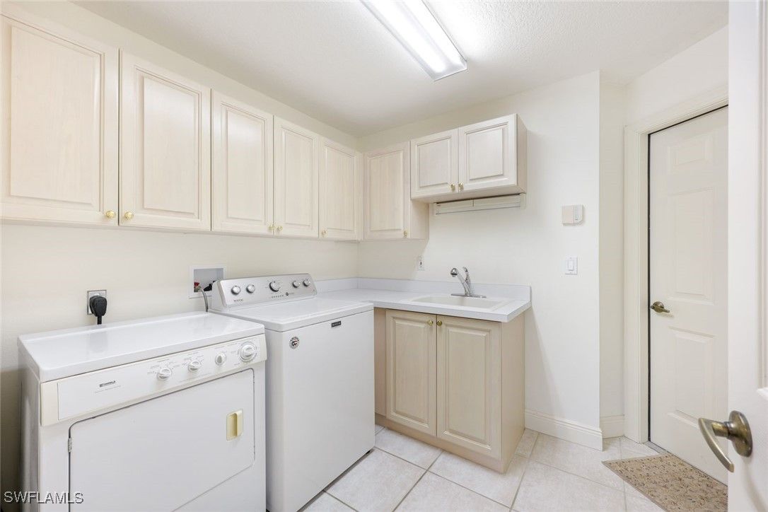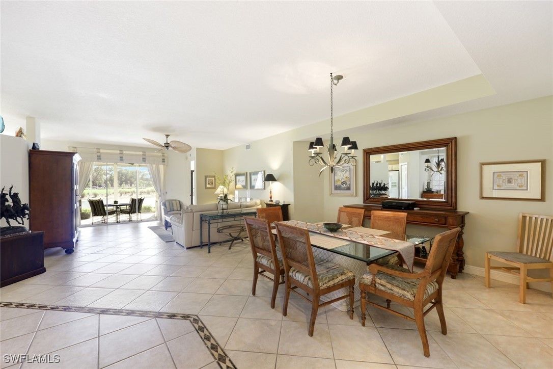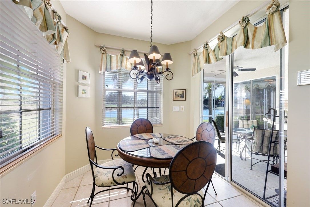 This meticulously maintained first-floor end unit features an open floor plan, a single-car garage, and impressive views of the lake, fountain, and golf course. The primary suite includes a generous walk-in closet, a spacious bathroom with both a separate tub and shower, and a double-sink vanity. Features include a screened lanai with electric storm shutters, newly painted interiors, tile flooring in living areas, and in-unit laundry with extra storage. The unit is offered tastefully furnished and ready for immediate occupancy. For added peace of mind, a one-year home warranty is provided. Laguna Royale benefits from recently replaced roofs (approximately 2.5 years ago) and newly painted exteriors. The community pool and spa offer panoramic views of the lake, fountain, and golf course, providing an ideal setting for relaxation. Centrally positioned, Laguna Royale offers convenient access to all that Naples has to offer, making it one of the best values within Vineyards.