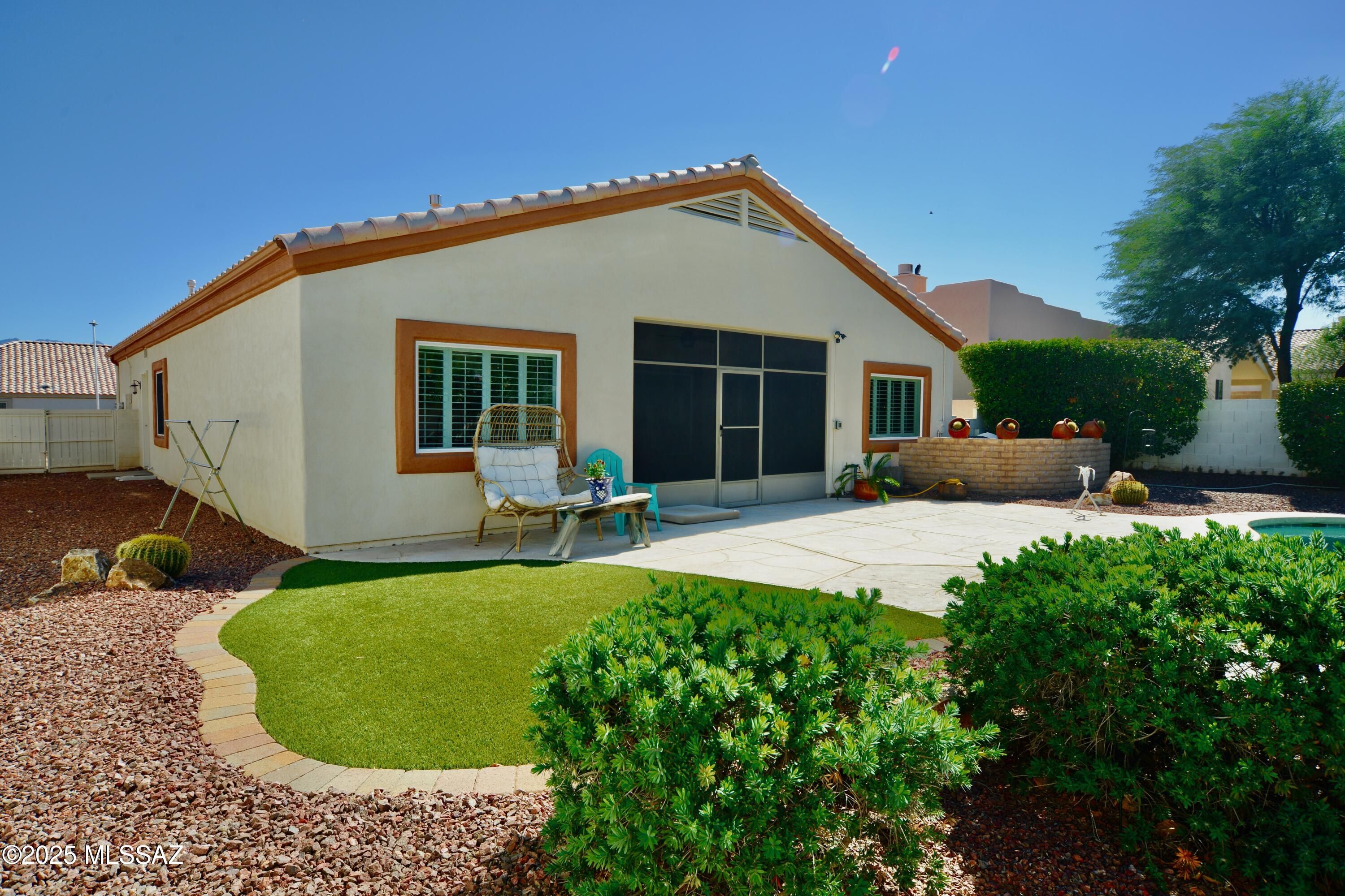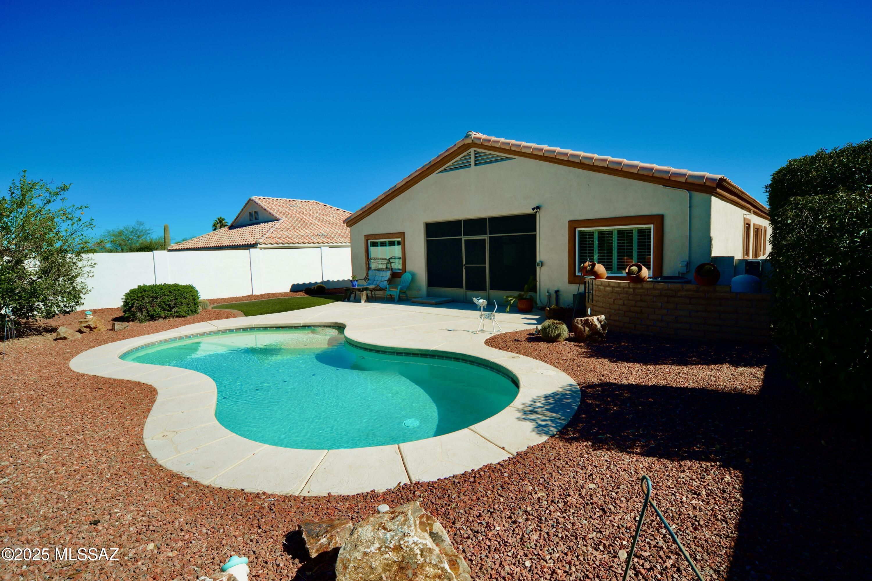 Beautifully updated 2BR + den, 2BA home in Desert Creek with a private saltwater pool and pet-friendly turf creating the perfect patio retreat. A screened Arizona room invites year-round enjoyment. This light-filled home features a split floor plan, high ceilings, tile and wood flooring, and a spacious kitchen with granite counters, island, and dual gas ovens. The open great room includes a gas fireplace and large windows, while the den with double doors and adjacent office nook offer flexibility. The primary suite has dual vanities, garden tub, separate shower, and walk-in closet. New water softener, knotty alder front door, 2-car garage, low HOA, and a convenient location make this move-in ready gem complete.