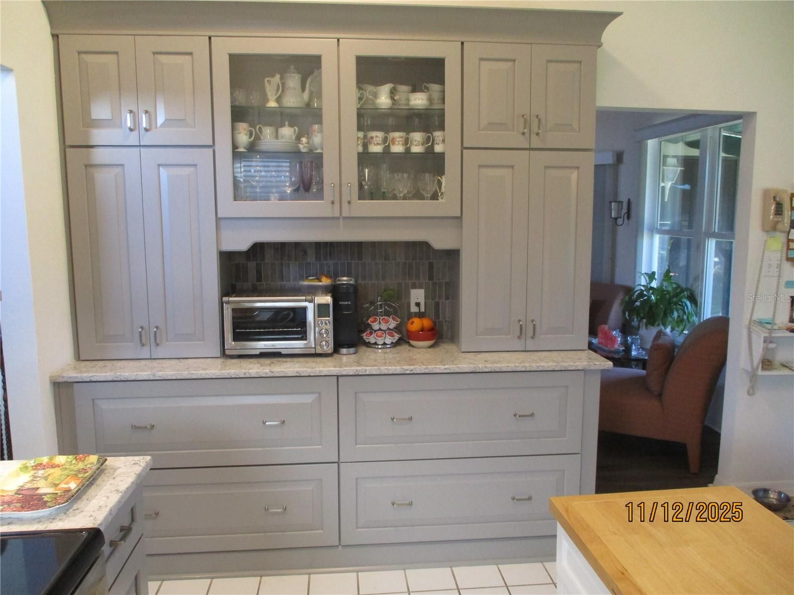 - Cathedral Ceiling(s), Ceiling Fan(s), Eat-in Kitchen, High Ceilings, L-Shaped Dining Room, Main Level Primary, Solid Surface Counters, Solid-Wood Cabinets, Thermostat, Walk-In Closet(s), Window Treatments
