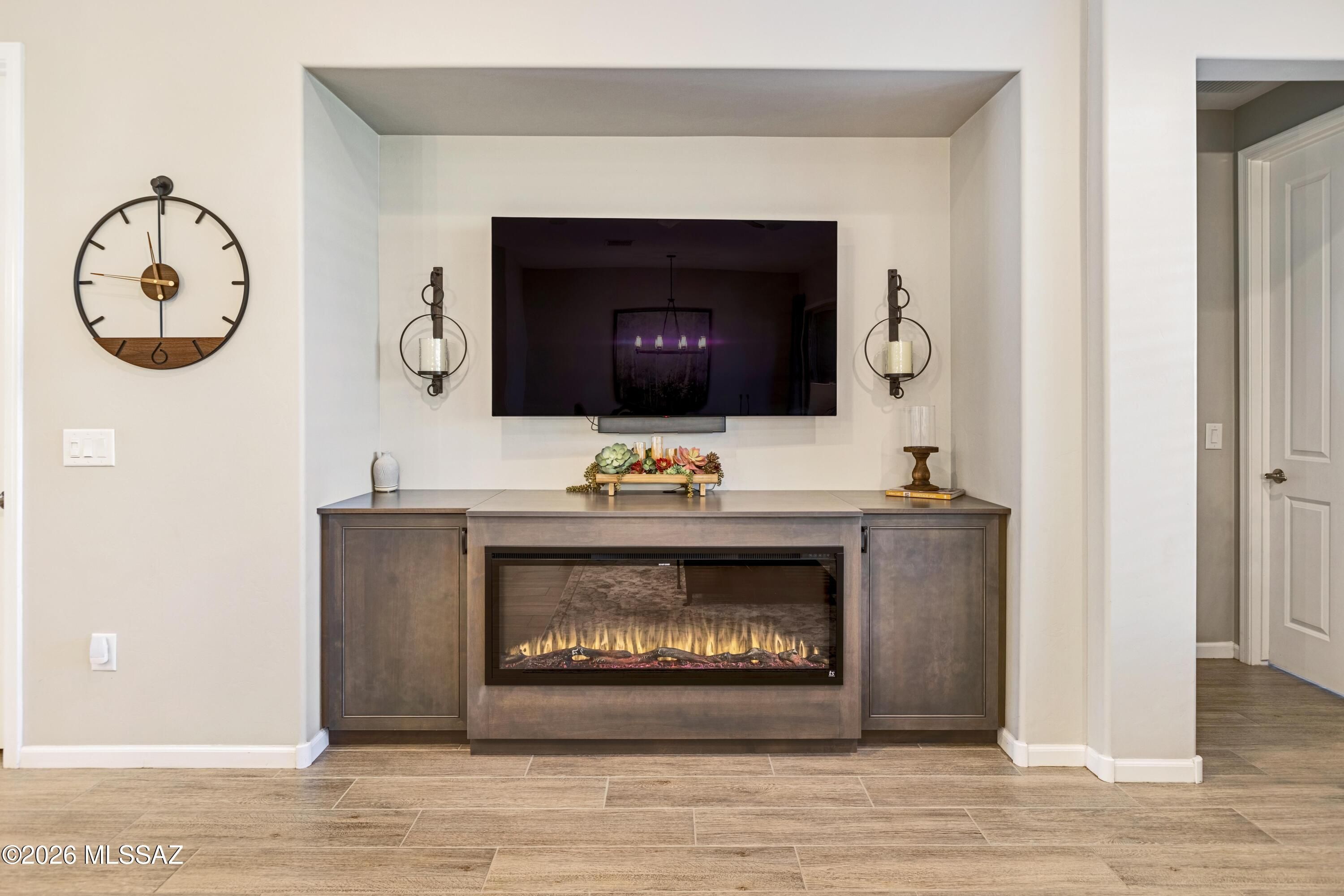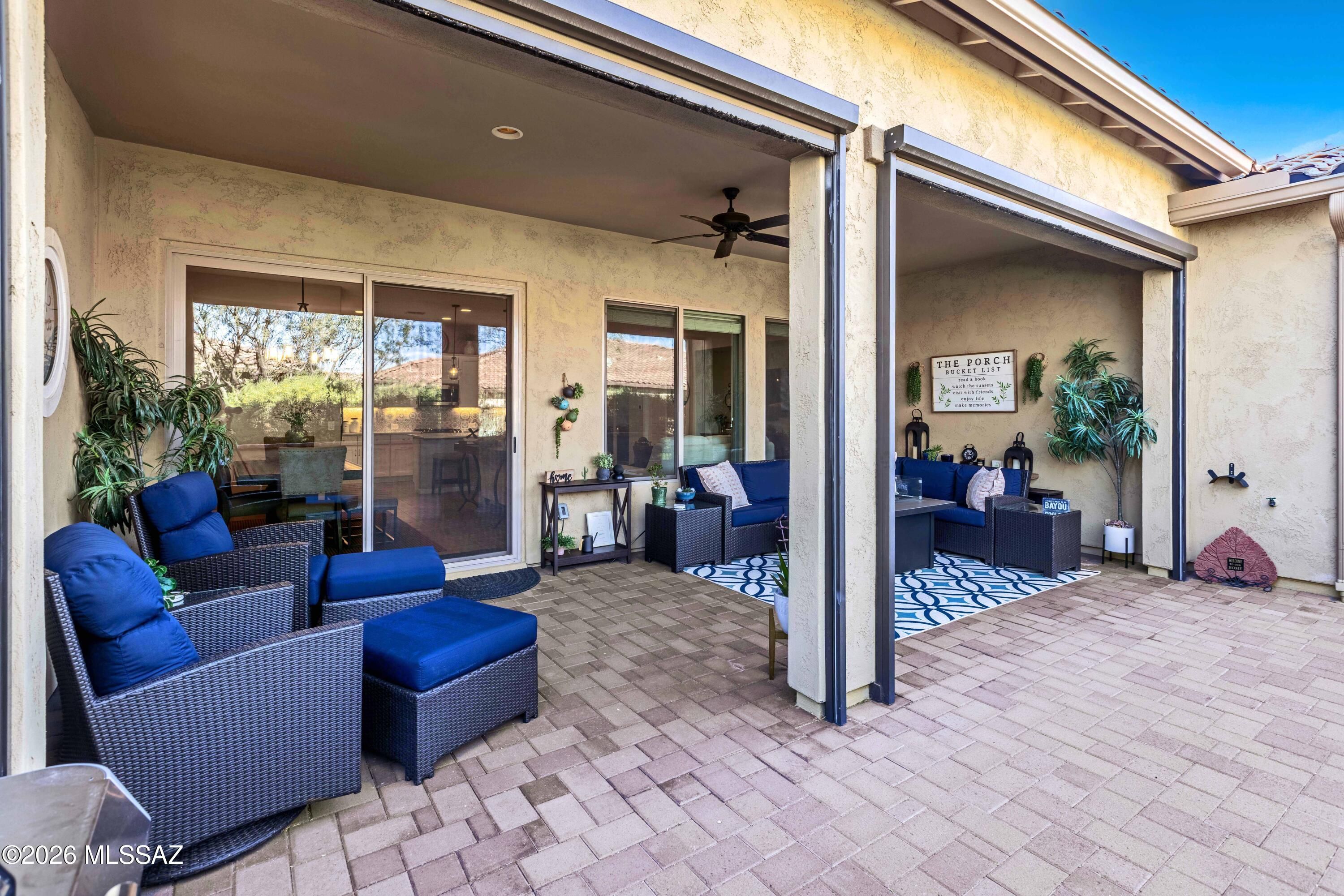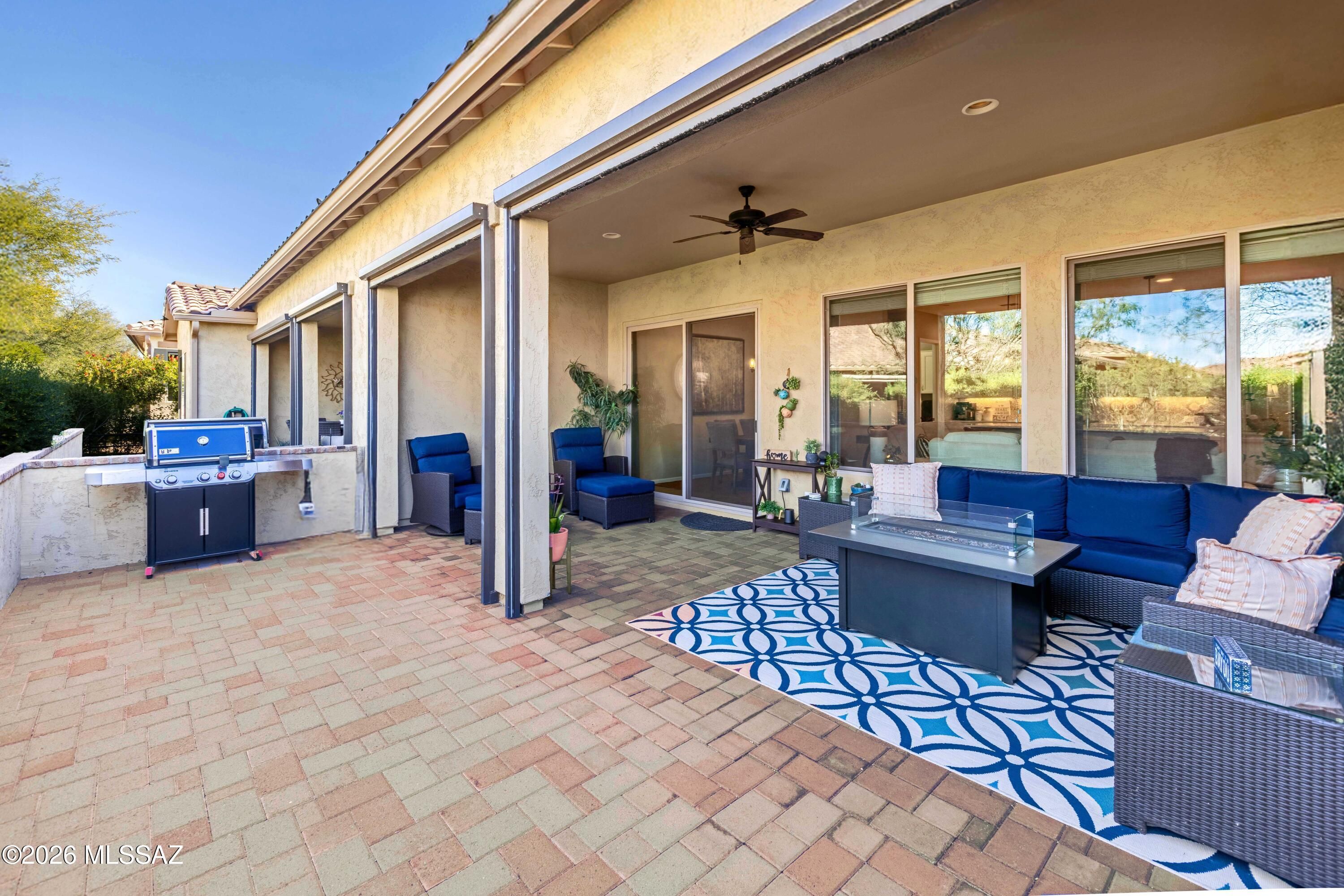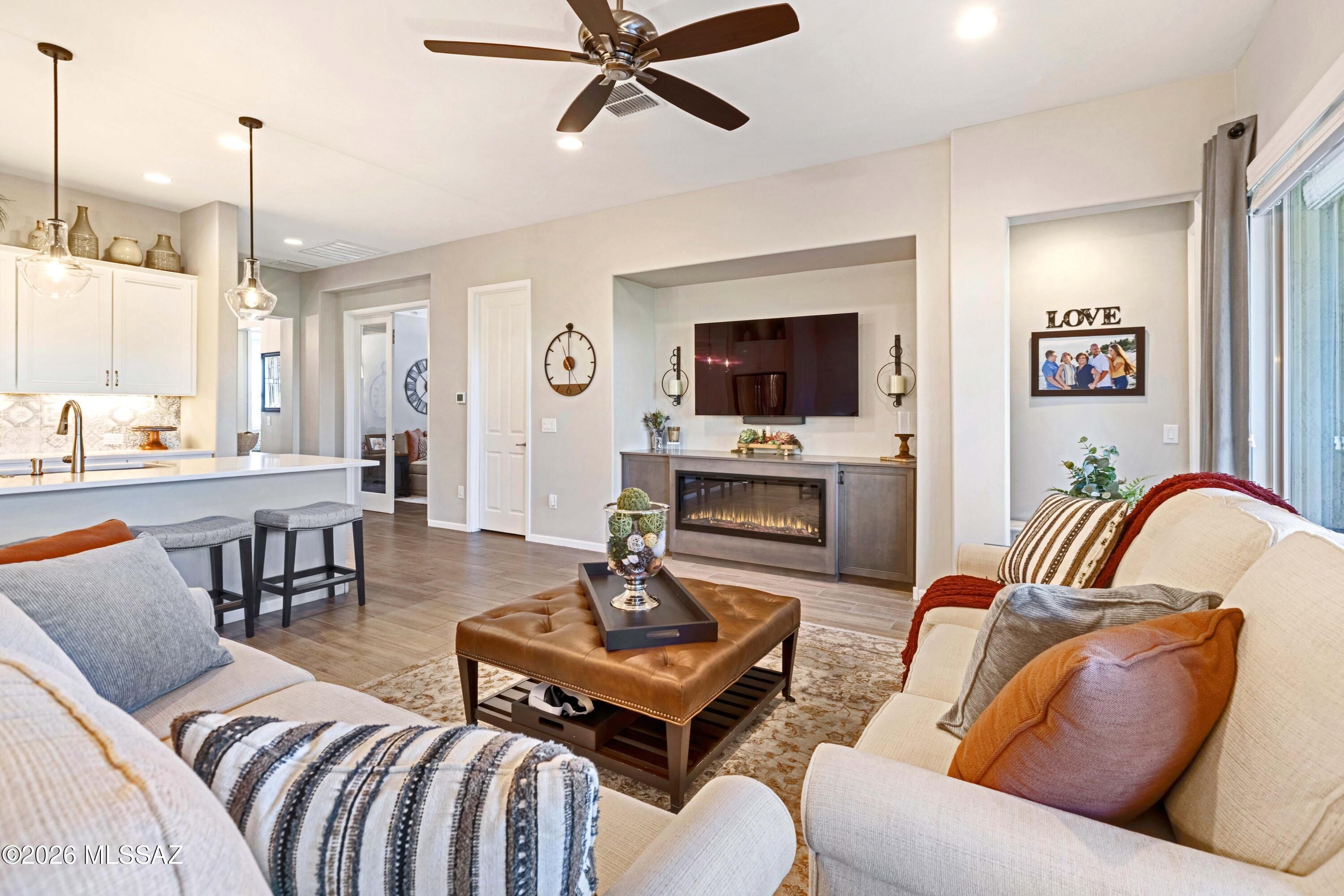 Welcome to this upgraded Viva model villa in the gated community of SaddleBrooke Ranch. This home offers 2 bedrooms plus a den, an open great room, high ceilings, quartz countertops, upgraded cabinetry, and stainless steel appliances. Since May 2023, the owners have added a custom primary closet, upgraded lighting throughout, framed bathroom mirrors, added electrical outlets in key storage areas, and added a custom built-in with an electric fireplace with lots of storage. Enjoy custom panel drapery, smart lighting, a custom glass-front door, a covered paver patio with rolling shutters, professionally designed front-yard landscaping, a snake fence, and a freshly painted garage. HOA-maintained exterior and resort-style amenities complete this low-maintenance home. Owner/Agent.