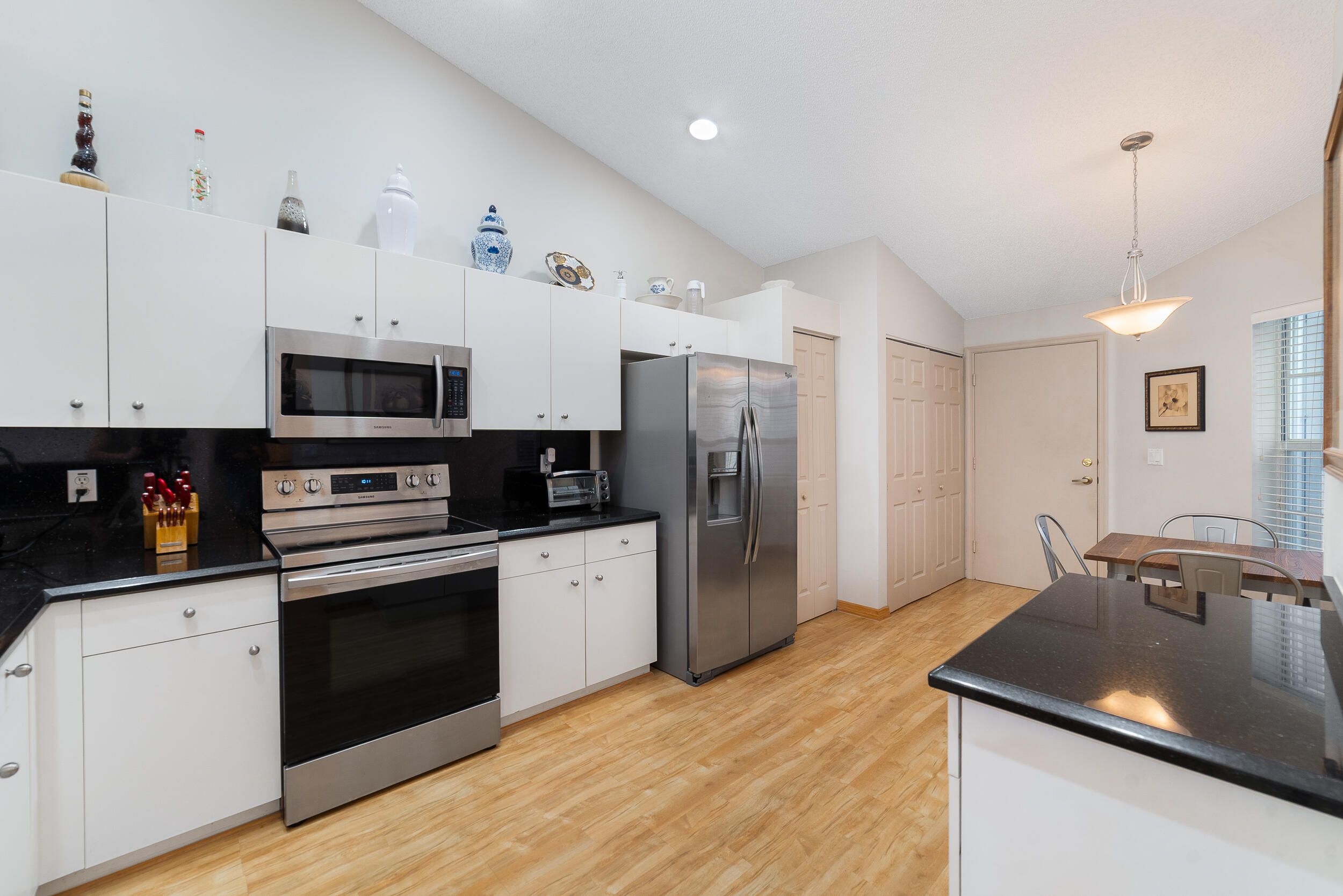 Welcome to this bright 2-bedroom, 2-bath townhouse in 55+ Floral Lakes, offering 1,378 sq ft of well-designed living space with abundant natural light, high-hat lighting, and ceiling fans throughout. The open kitchen anchors the home and features stainless steel appliances, including a refrigerator, stove, built-in microwave, dishwasher, and a double stainless steel sink, flowing seamlessly into the dining and living areas for easy everyday living and entertaining. The primary suite includes a renovated bathroom, while washer and dryer are conveniently located in the home. Head out to the extended screened lanai with birdcage enclosure and enjoy peaceful water views—an ideal spot to relax and unwind. Additional highlights include a one-car garage and hurricane shutters. Floral Lakes is a gated community offering a clubhouse, fitness center, pool and spa, tennis courts, library, game room, business center, sauna, putting green, bike and scenic paths, sidewalks, and on-site management. A well-maintained home with thoughtful updates in a beautifully kept setting.