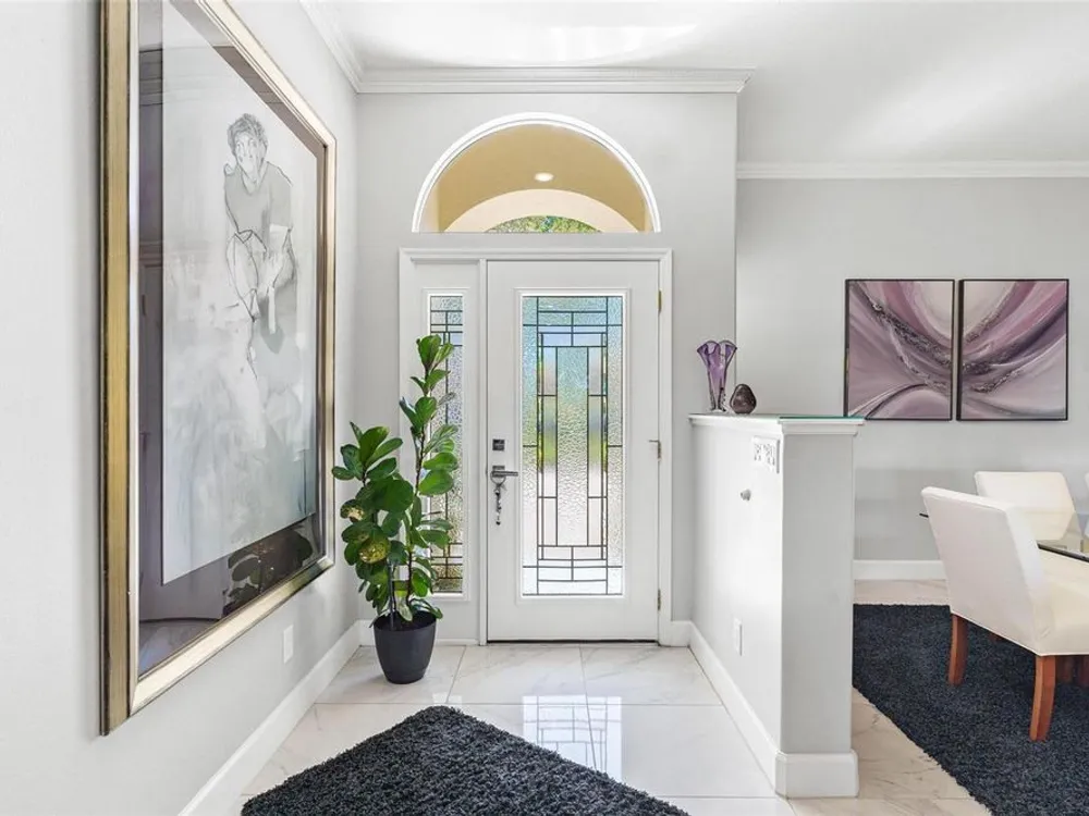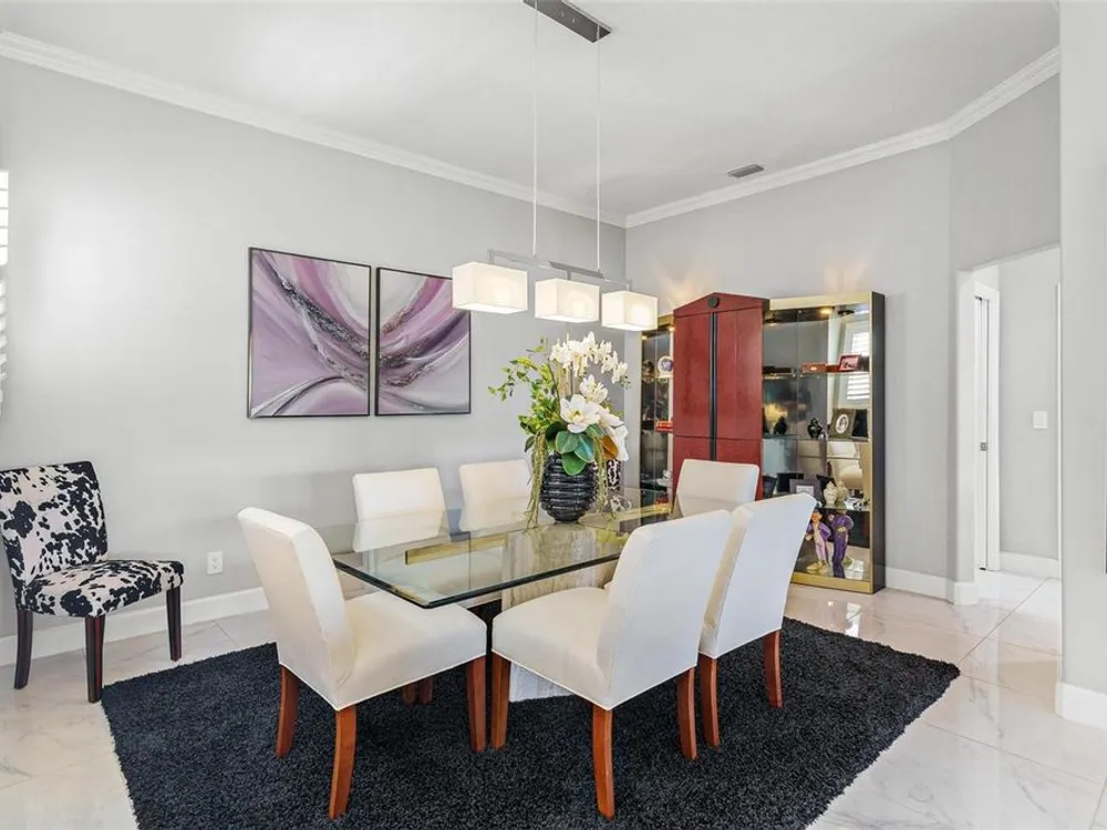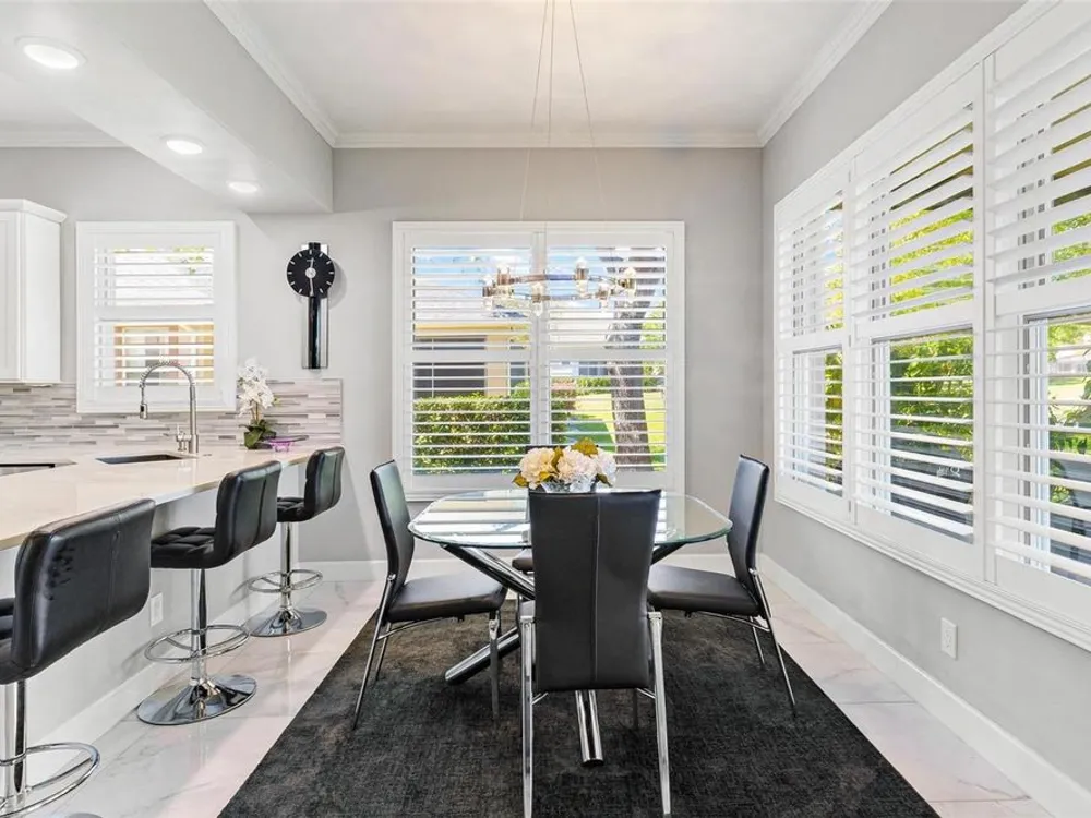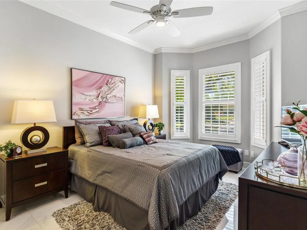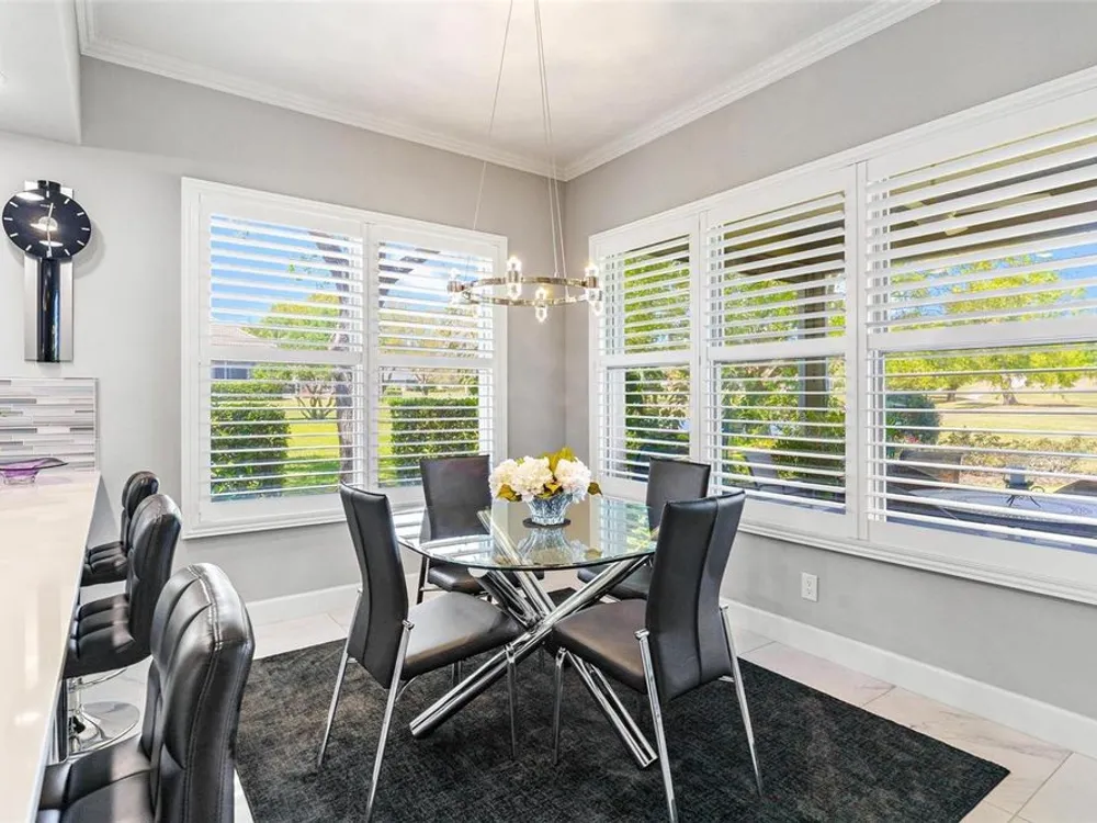 - Ceiling Fan(s), Crown Molding, Eat-in Kitchen, High Ceilings, Kitchen/Family Room Combo, Living/Dining Room, Open Floorplan, Solid Surface Counters, Split Bedrooms, Window Treatments