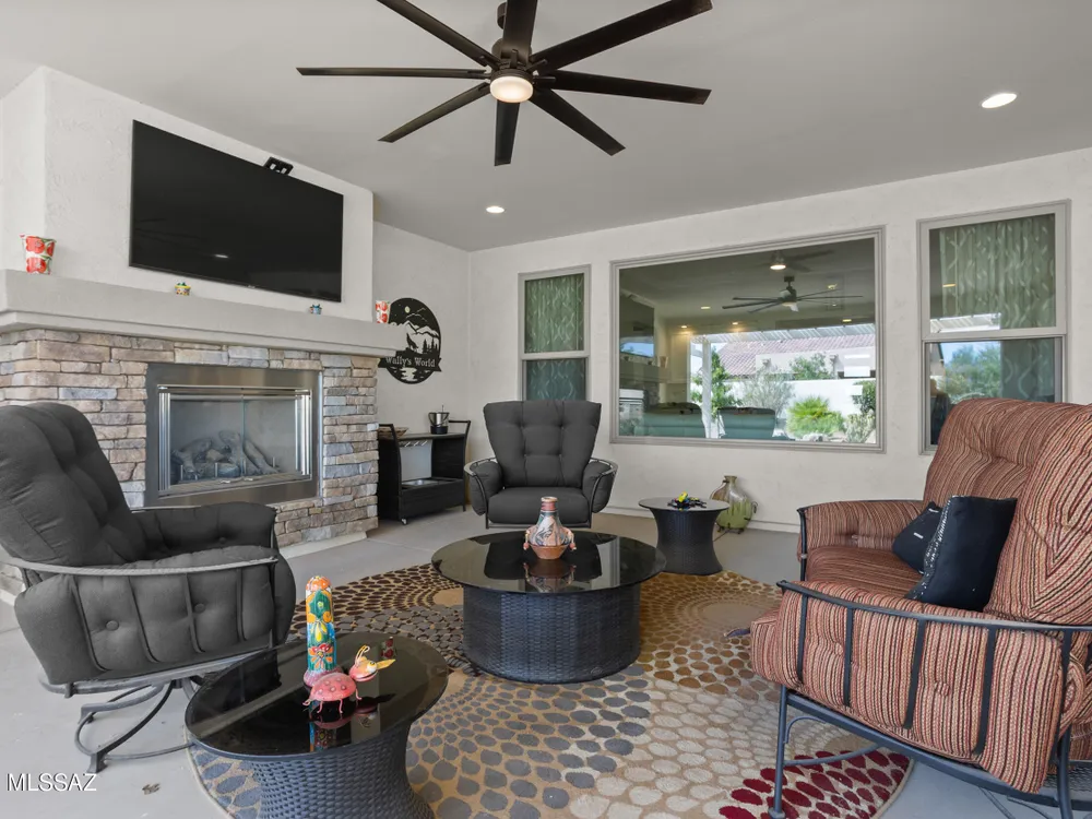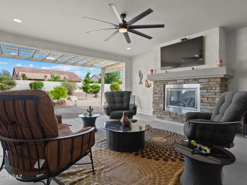 Tesoro floor plan on a cul-de-sac across from State land. Two bedroom plus den with 2 1/2 baths, garage includes 4' extension and golf cart garage, built in 2018. The front offers stacked stone exterior, courtyard, and views of the Catalina Mountains. The interior offers 8' doors and tile flooring throughout. Gourmet kitchen layout with gas cooktop, dove-tail soft-close drawers. The great room has 11' ceilings and crown molding. Built-in cabinets at den and entertainment center. Expanded walk-in closet at master with closet organizers. Gorgeous, fully walled backyard with gas fireplace and extended pergola. Epoxy garage floor. Fridge, washer, dryer included! Check out all the facilities, clubs, and activities that the gated community of Saddlebrooke Ranch has to offer.