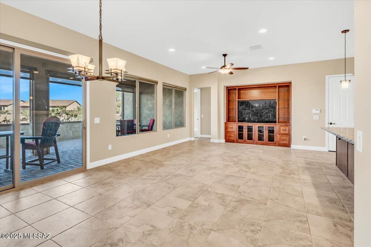 Experience refined desert living in this beautifully upgraded Viva Villa, where unobstructed views of open desert & distant mountains create a serene backdrop. The designer kitchen is a showpiece, featuring Cambria quartz countertops, upgraded cabinetry & hardware, and elegant under-cabinet & pendant lighting. A custom media center anchors a spacious Great Room, enhanced by dimmer switches to set the perfect ambiance. The primary suite offers a luxurious retreat w/walk-in custom closet, separate linen closet, & a large curbless shower. Step outside to a fully pavered extended patio w/solar screens-ideal for enjoying the desert vistas. Add to that a well-appointed laundry room w/built-in cabinets & hang bar, and a finished garage w/HVAC, epoxy flooring, water softener, utility sink. Hurry
