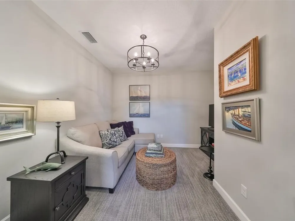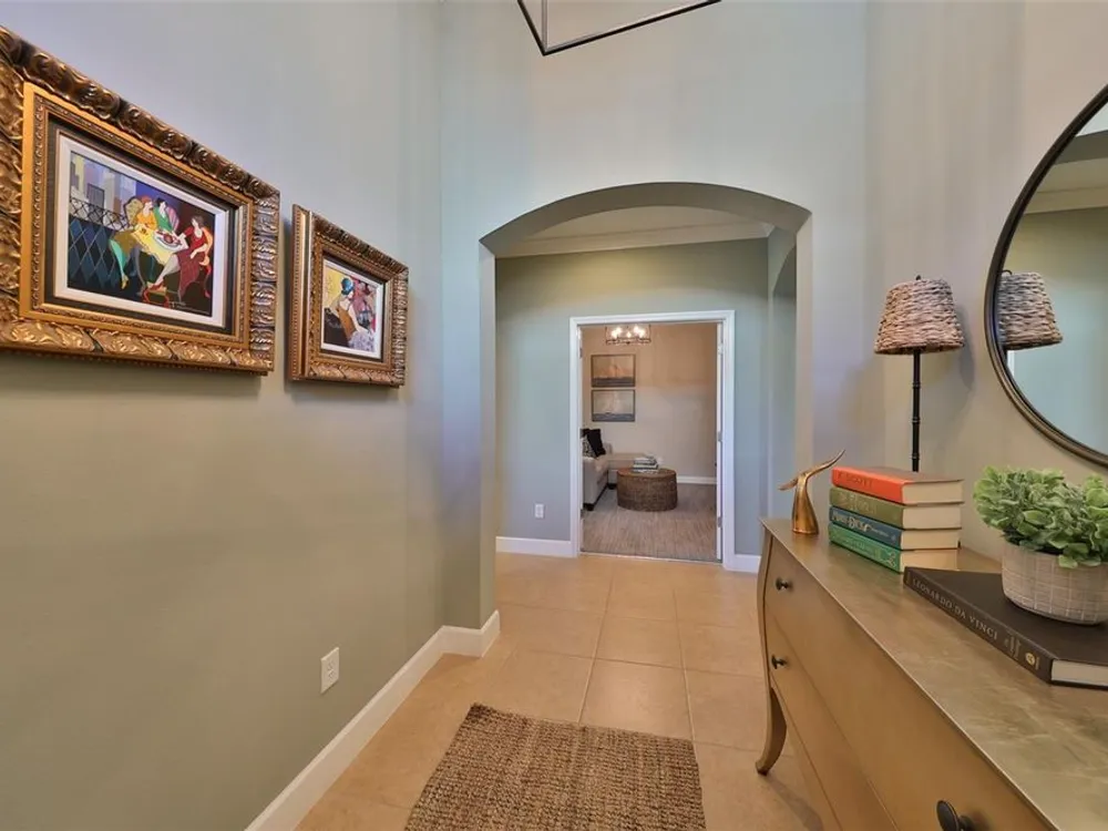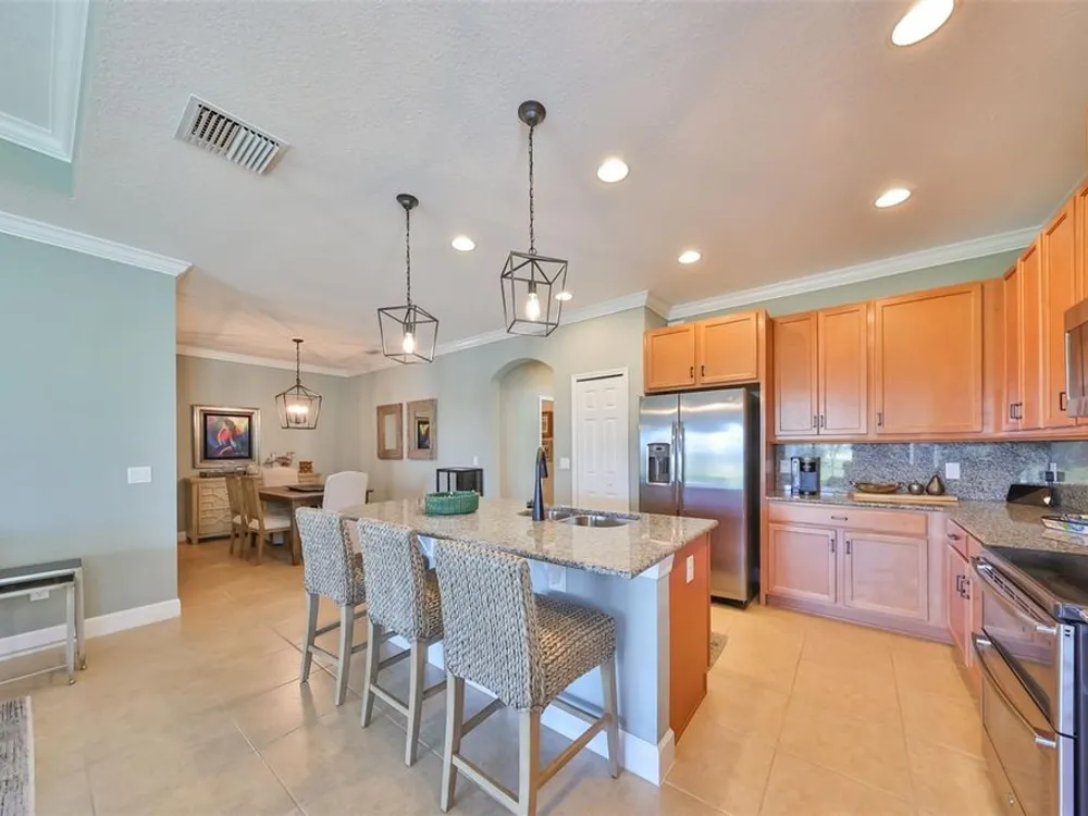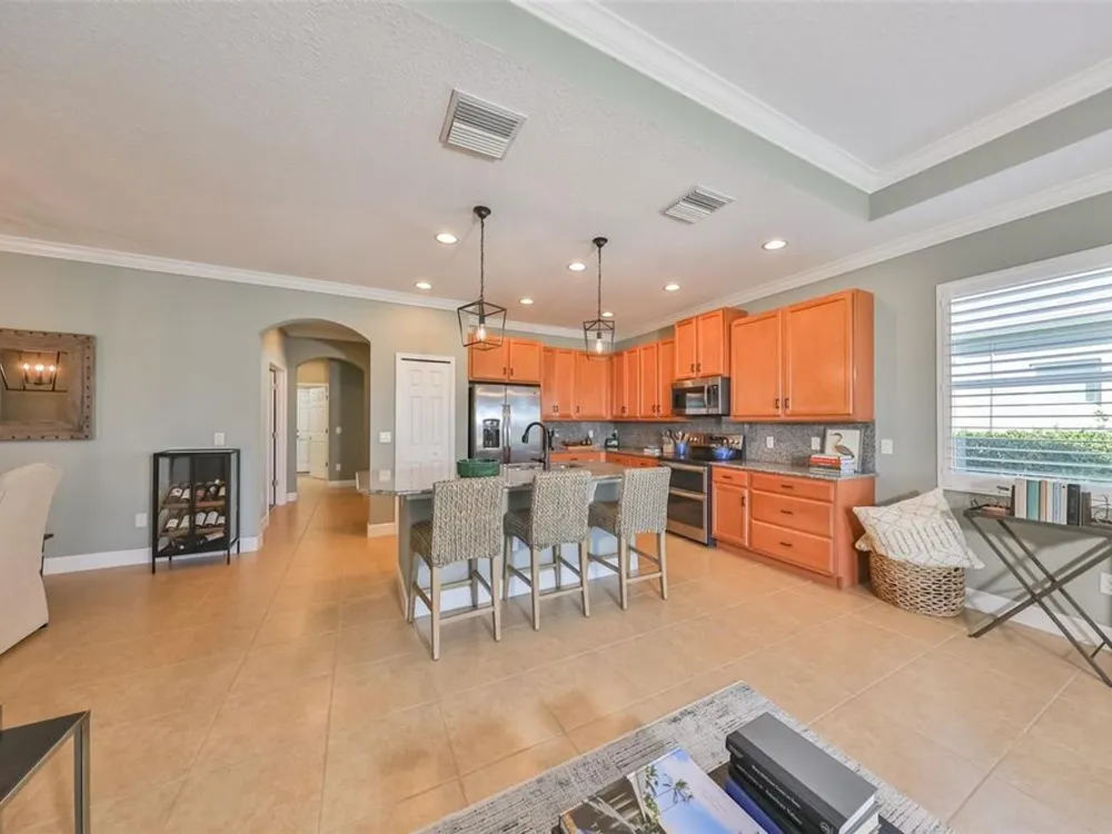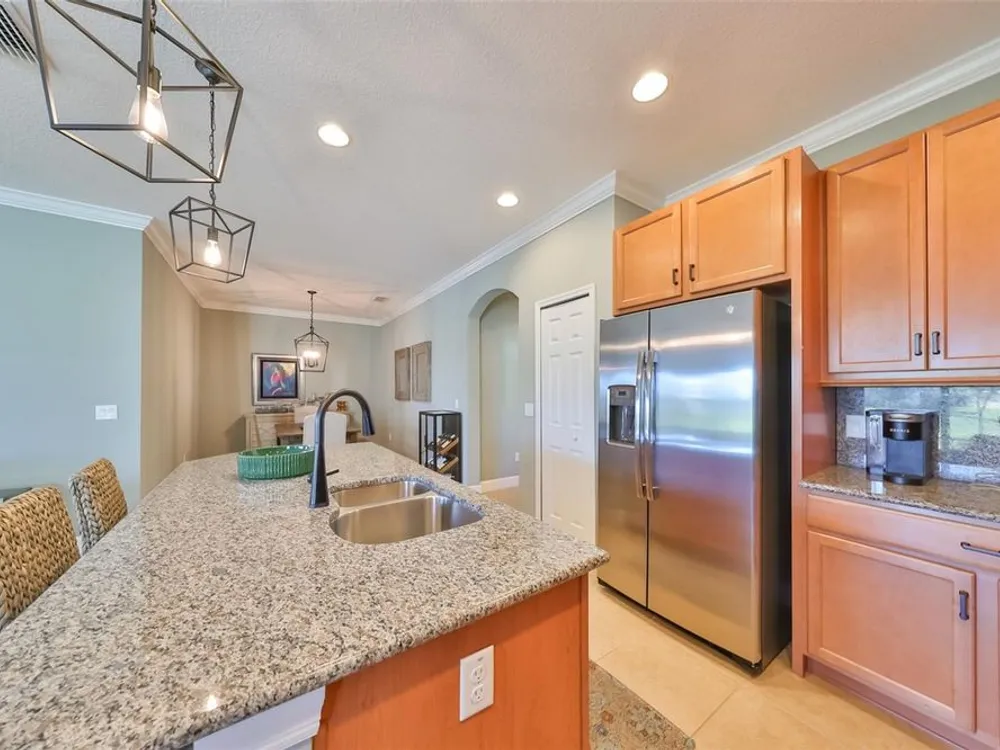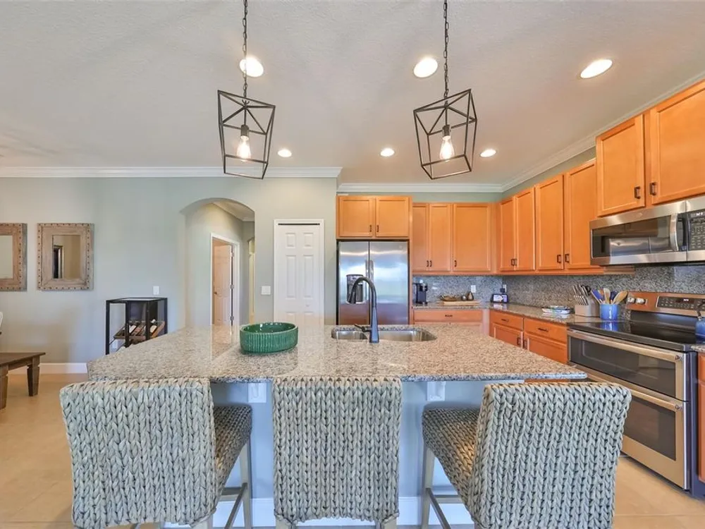 CONTEMPORARY COASTAL and ELEGANT is the best way to describe this MAINTENANCE FREE, SPARKLING CLEAN, WATER VIEW Villa located in the desirable GATED community of Renaissance known as Verona. And it is ONLY 100' from the PRIVATE VERONA POOL RESORT. *A very popular OPEN FLOOR PLAN model, the “Mahogany”, is a 2 bed/2bath home WITH A DEN/OFFICE. It is 4.5 years YOUNG and is than new. This home has all of the touches of a PROFESSIONAL DECORATOR. *The EXPANSIVE KITCHEN includes such HIGH-END FEATURES as GRANITE COUNTERTOPS, STAINLESS STEEL APPLIANCES (including a DOUBLE OVEN), 42” HONEY TONE, ALL WOOD cabinets. *Large, beautiful, LOW E-ENERGY EFFICIENT windows, with PLANTATION SHUTTERS, allow the Floridian sunshine to naturally filter throughout the home. CONTEMPORARY PAINT TONES accent the walls and TREY CEILINGS, which make the CROWN MOLDING pop. The light fixtures are MODERN. *The LARGE OWNERS SUITE is relaxing and CALM with COASTAL tones being carried on through the master bathroom. There is a LARGE, WALK-IN, CALIFORNIA STYLE closet for ultimate storage and ORGANIZATION. The en-suite bath boasts of GRANITE COUNTERS, DUAL SINKS, PRIVATE water closet and lovely walk-in shower. All of the bedrooms are spacious with OVERSIZED windows for maximum enjoyment of the views. *The dining room, while separate is still open to the main floor plan for easy entertaining. *The den/office is comfortable and the only room with carpeting specific for reduced noise. *The LANAI provides the perfect space for grilling, reading or entertaining, while overlooking the water and the wildlife. *The garage has a lovely EPOXY FLOORING and the CUSTOM PAVER-STONE driveway and walkway, adds such a rich feel to the entrance. *One of the best features about this home is that ALL EXTERIOR MAINTENANCE is taken care of by the HOA association. Nothing for you to do but enjoy all that this active community offers. The unique gated community of Verona offers its own private, resort-style amenities and all the pleasures of a hall of fame maintenance free retirement community. Come and enjoy the world-class country club, fine dining, 5 resort style pools, two state-of the-art fitness centers, spa, saunas, hundreds of social and sports clubs and more. Start living the dream!! Sun City Center has 3 beautiful clubhouses, dance, theater, an arts and crafts building, state-of-the-art medical facilities, shopping, endless entertainment & resources all accessible by golf cart. Verona in Sun City Center is a great place to live! Come and see why this is the place to retire, according to the New York Times and have fun, especially with this home. NOTE: Most of the furniture is available for sale under separate bill of sale. Roof 2019; A/C (on continuous service contract) 2019; Water Heater 2023; Water Softener 2021