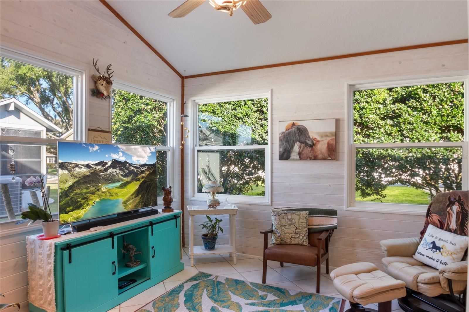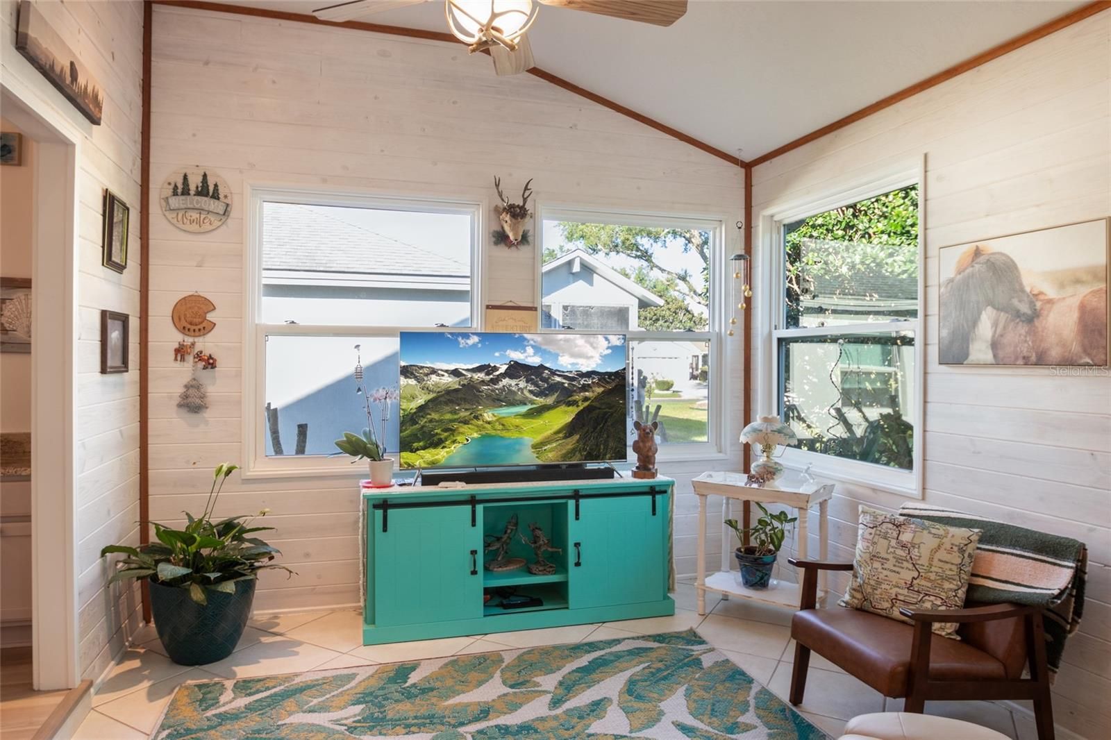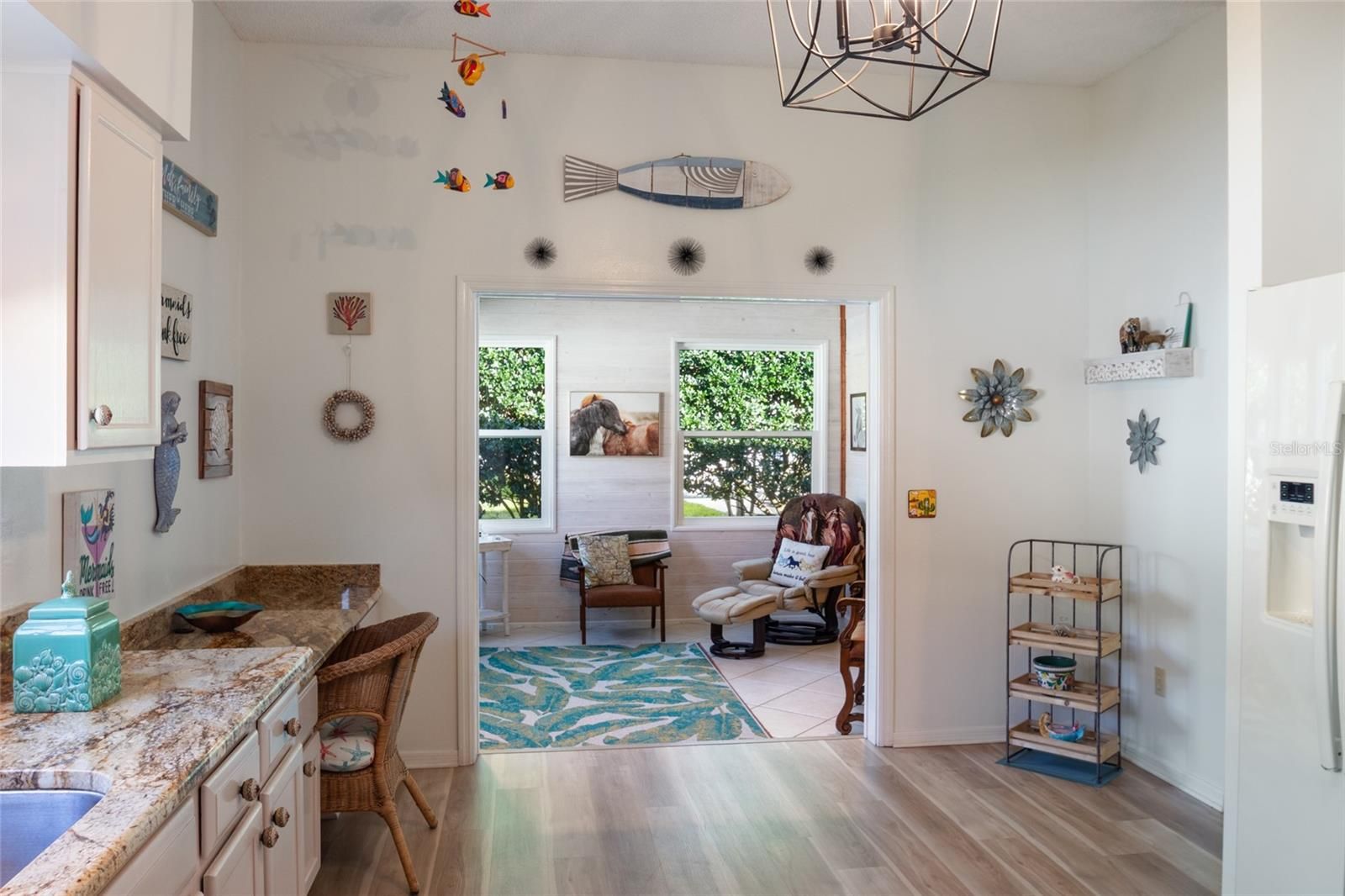 MUST SEE spacious, updated home near Spanish Springs and Lake Sumter Landing in The Villages, Florida. BOND PAID * NEW FLOORS * NEW AC * NEW HOT WATER HEATER * NEW WASHER * NEW DRYER * NEW DISHWASHER * NEW MICROWAVE *NEW PAINT. Enjoy your morning coffee on the covered front porch. Enter into your bright, large 20' x 27' entertaining area (living and dining room combination), perfect for family holidays or neighborhood gatherings. The functional kitchen has white cabinets and granite counter tops. Cozy Florida room has new windows. The primary suite is 15' x 12' and spacious enough for a king size bed, night stands, and a seating area. Two walk in closets provide ample storage. One has been repurposed as an office space. This is a MUST SEE as it is unique and fun. The primary bathroom has been recently remodeled to include a tiled shower with seat, spectacular 2 sink cabinet, separate water closet. The guest bedroom is 13' x 11' with a large closet. This home is MOVE IN READY. FURNITURE AND GOLF CAR are available separately. Buy it all, move in and begin living your Florida dream!