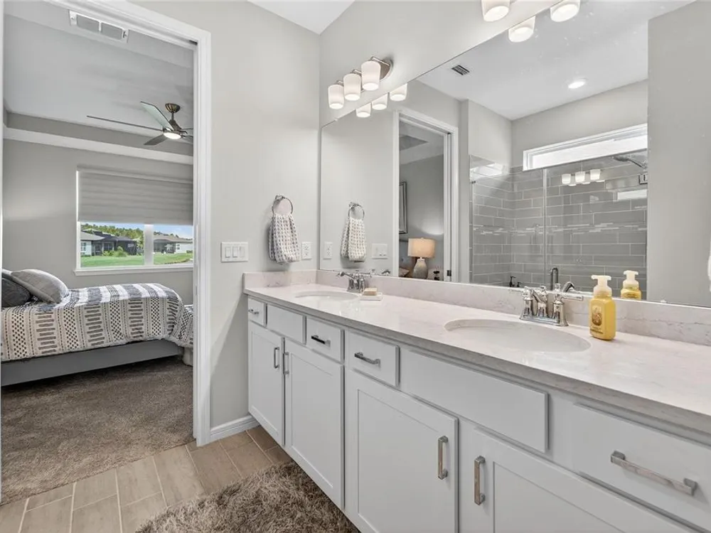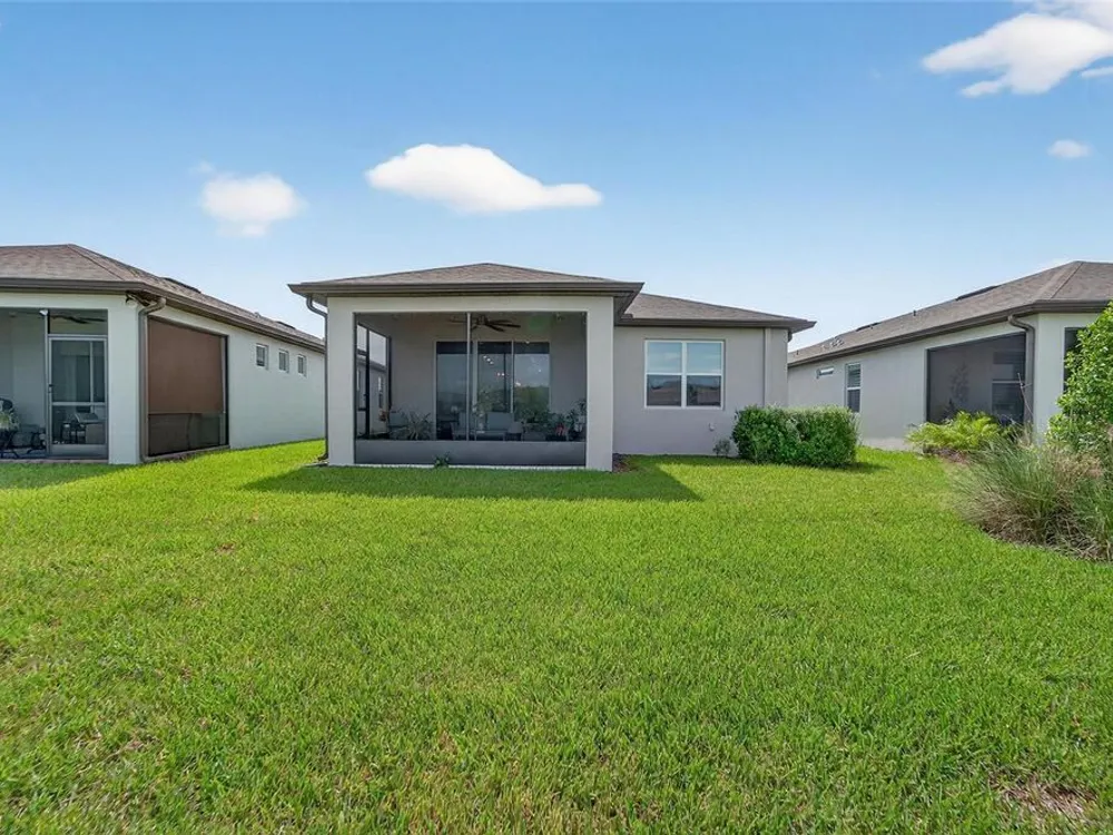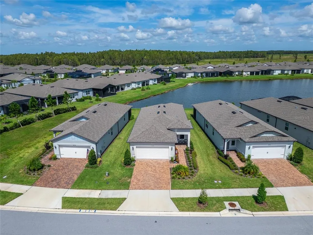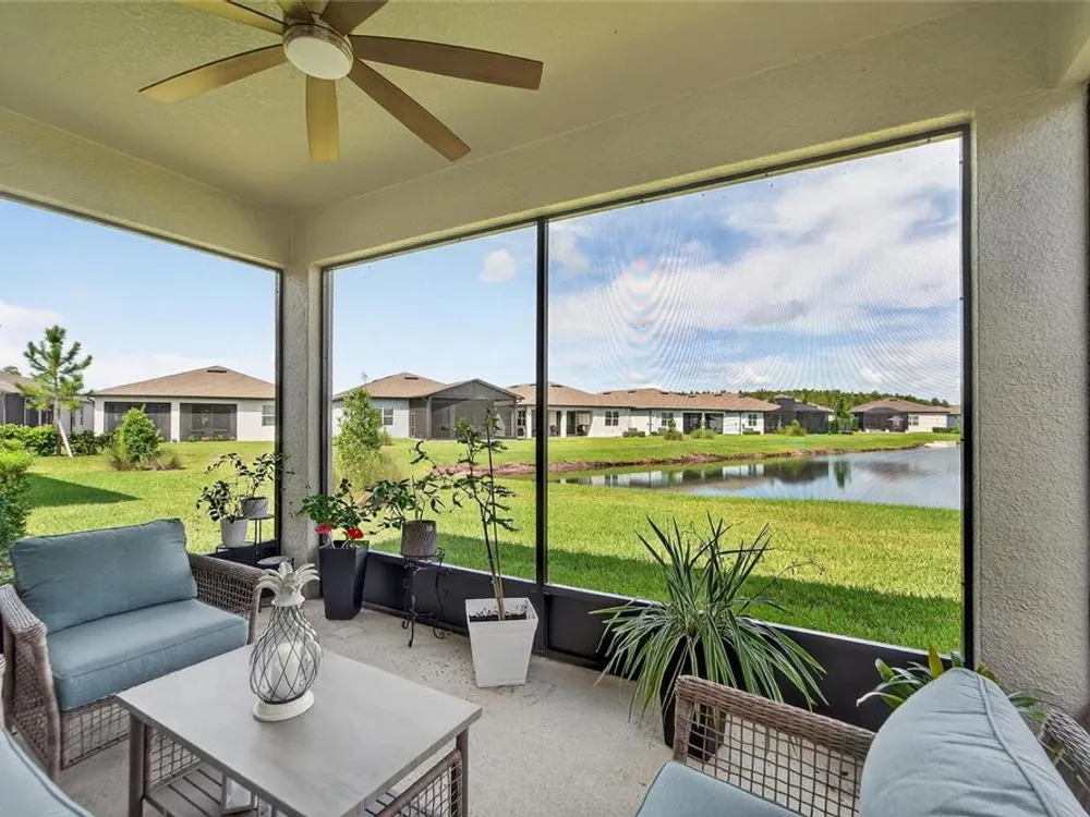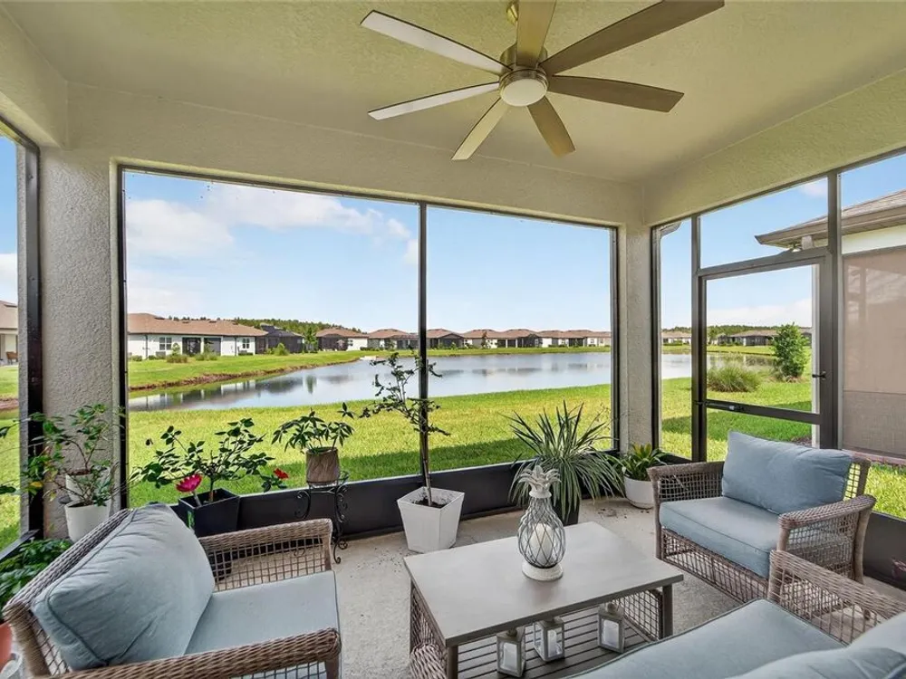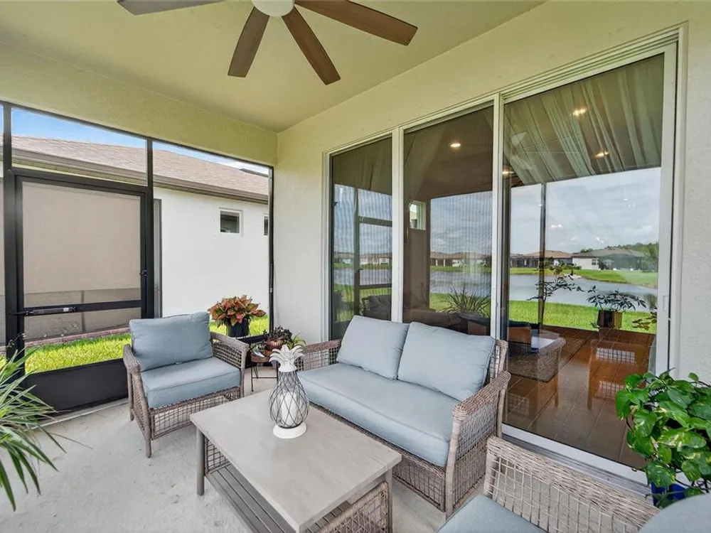 Scenic POND VIEW! Welcome to this charming 2 bed + Den - 2 bath - 2 car home thoughtfully designed for comfort and style. Located in the vibrant 55+ active adult community of Del Webb Bexley, truly a place you’ll be proud to call “Home.” Step inside through the Decorative Glass front door gleaming natural light that fills the OPEN LAYOUT highlighting the 9 foot 4 inch tall ceilings and 8 foot tall doors. Modern style of continuous ceramic tile throughout the main living areas with plush upgraded carpet in both bedrooms, creating a warm and inviting atmosphere. Contemporary Chef’s dream of a kitchen boasts: 42 inch WHITE CUSTOM CABINETS with decorative molding, QUARTZ counters, designer wall tile backsplash and a full suite of stainless steel appliances—including a French door refrigerator. Gleaming accents of satin nickel cabinet hardware along with the high arced faucet at the large single-sink add beauty and functionality. Host memorable dinners in the open dining area or step outside to the screened-in patio, where you can relax and entertain while enjoying peaceful views of the pond. Primary Suite with SPA INSPIRED Bathroom features walk-in shower with built-in bench, dual sinks, large walk in closet and a private water closet. The secondary bedroom is thoughtfully positioned at the front of the home, ensuring privacy for both you and your guests. Enjoy quiet time at home in the flex space to read, work on crafts, play games or use as a productive workspace. Additional highlights include an indoor laundry room complete with washer & dryer. Bonus: you'll have peace of mind knowing that your new home comes with hurricane shutters. The low monthly HOA fee gives you access to the 19,000 sq. ft. clubhouse with a fitness center, bistro, ballroom, multi-purpose room, clubs and planned activities. Outdoor amenities include a zero entry heated pool, resistance pool, pickle ball courts, bocce ball, tennis courts, a community garden and dog park. Del Webb Bexley is located just a short distance from shopping, restaurants, Premium Outlet Mall and Tampa’s International airport.