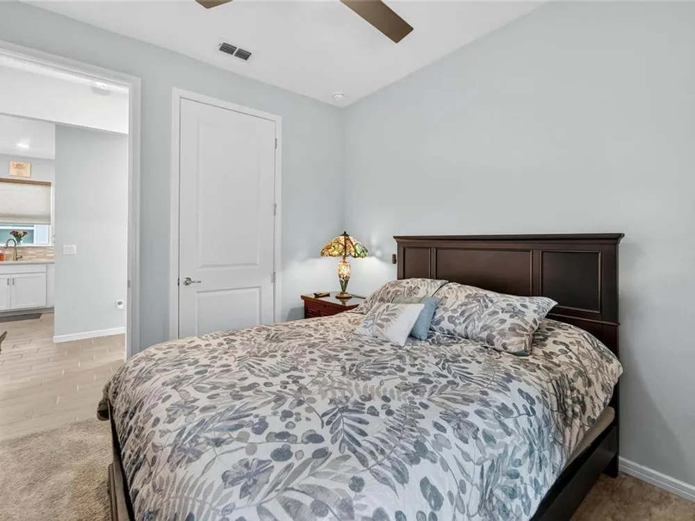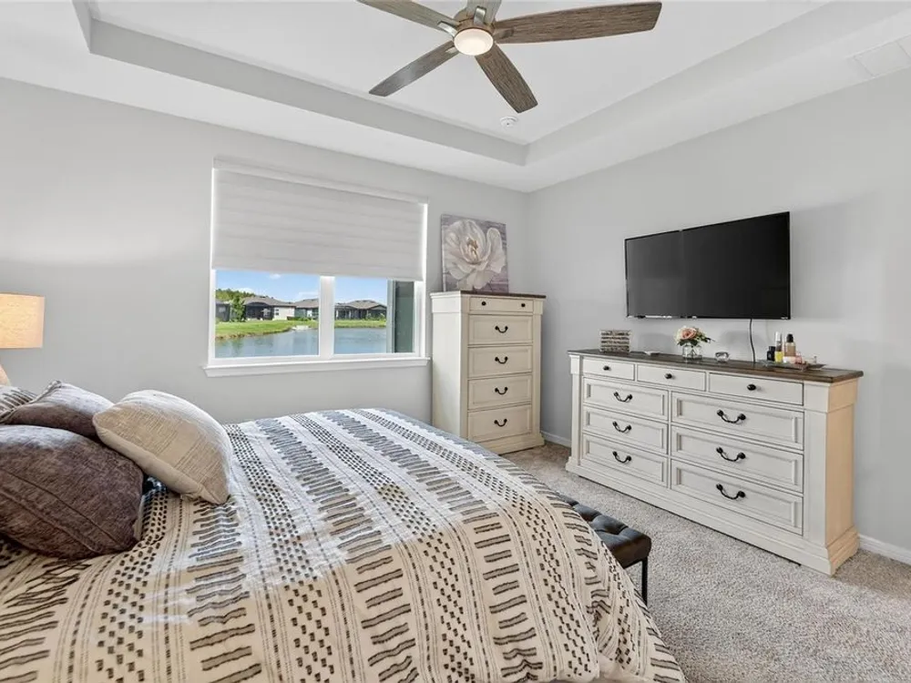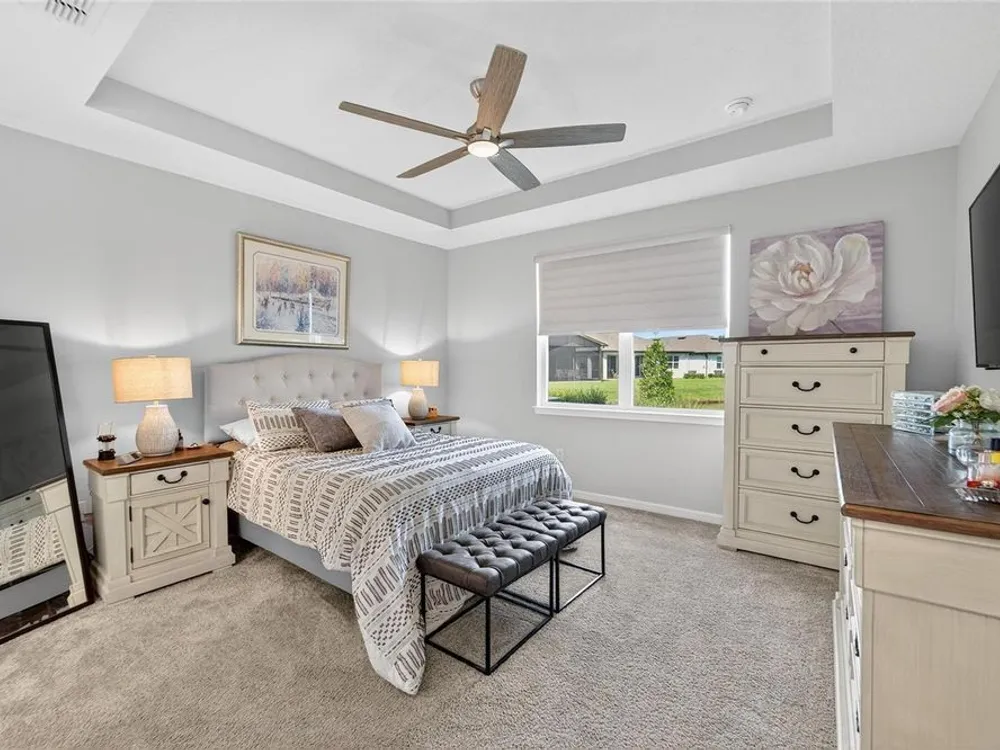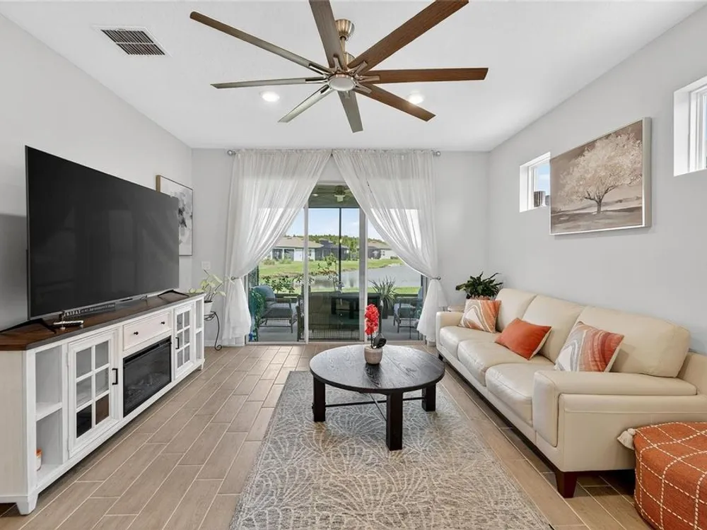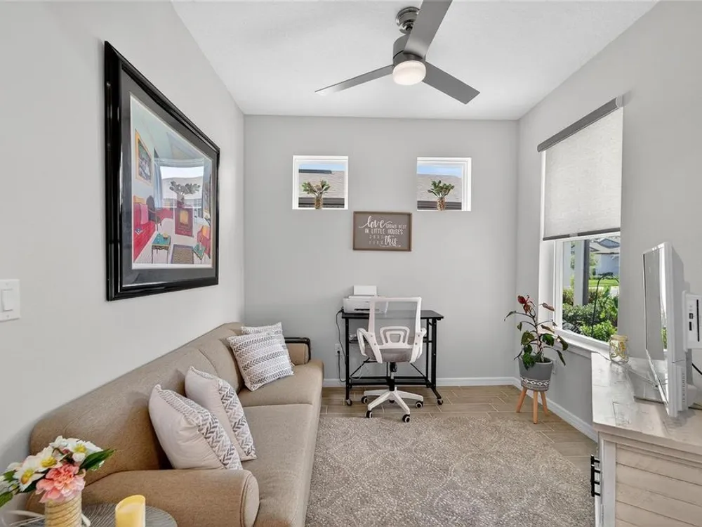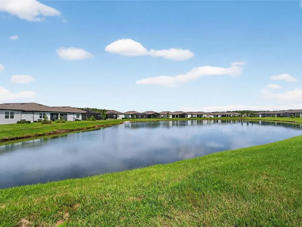 Scenic POND VIEW! Welcome to this charming 2 bed + Den - 2 bath - 2 car home thoughtfully designed for comfort and style. Located in the vibrant 55+ active adult community of Del Webb Bexley, truly a place you’ll be proud to call “Home.” Step inside through the Decorative Glass front door gleaming natural light that fills the OPEN LAYOUT highlighting the 9 foot 4 inch tall ceilings and 8 foot tall doors. Modern style of continuous ceramic tile throughout the main living areas with plush upgraded carpet in both bedrooms, creating a warm and inviting atmosphere. Contemporary Chef’s dream of a kitchen boasts: 42 inch WHITE CUSTOM CABINETS with decorative molding, QUARTZ counters, designer wall tile backsplash and a full suite of stainless steel appliances—including a French door refrigerator. Gleaming accents of satin nickel cabinet hardware along with the high arced faucet at the large single-sink add beauty and functionality. Host memorable dinners in the open dining area or step outside to the screened-in patio, where you can relax and entertain while enjoying peaceful views of the pond. Primary Suite with SPA INSPIRED Bathroom features walk-in shower with built-in bench, dual sinks, large walk in closet and a private water closet. The secondary bedroom is thoughtfully positioned at the front of the home, ensuring privacy for both you and your guests. Enjoy quiet time at home in the flex space to read, work on crafts, play games or use as a productive workspace. Additional highlights include an indoor laundry room complete with washer & dryer. Bonus: you'll have peace of mind knowing that your new home comes with hurricane shutters. The low monthly HOA fee gives you access to the 19,000 sq. ft. clubhouse with a fitness center, bistro, ballroom, multi-purpose room, clubs and planned activities. Outdoor amenities include a zero entry heated pool, resistance pool, pickle ball courts, bocce ball, tennis courts, a community garden and dog park. Del Webb Bexley is located just a short distance from shopping, restaurants, Premium Outlet Mall and Tampa’s International airport.