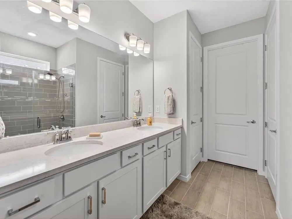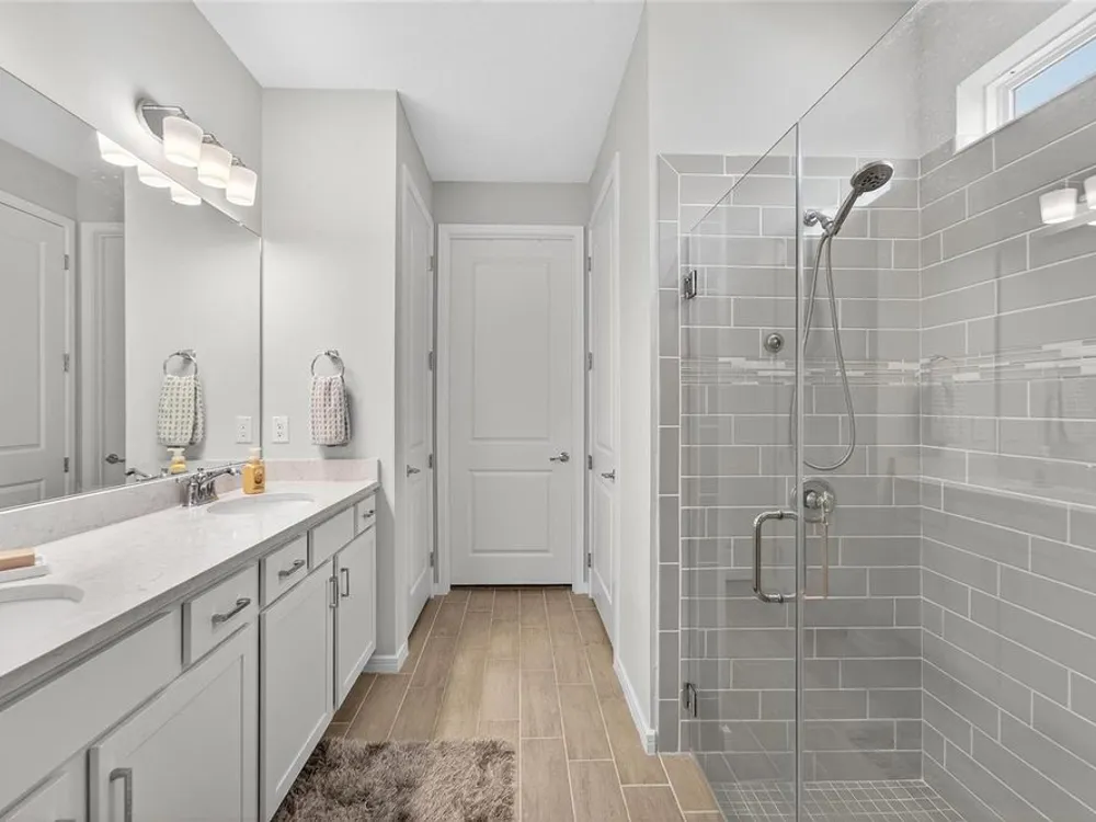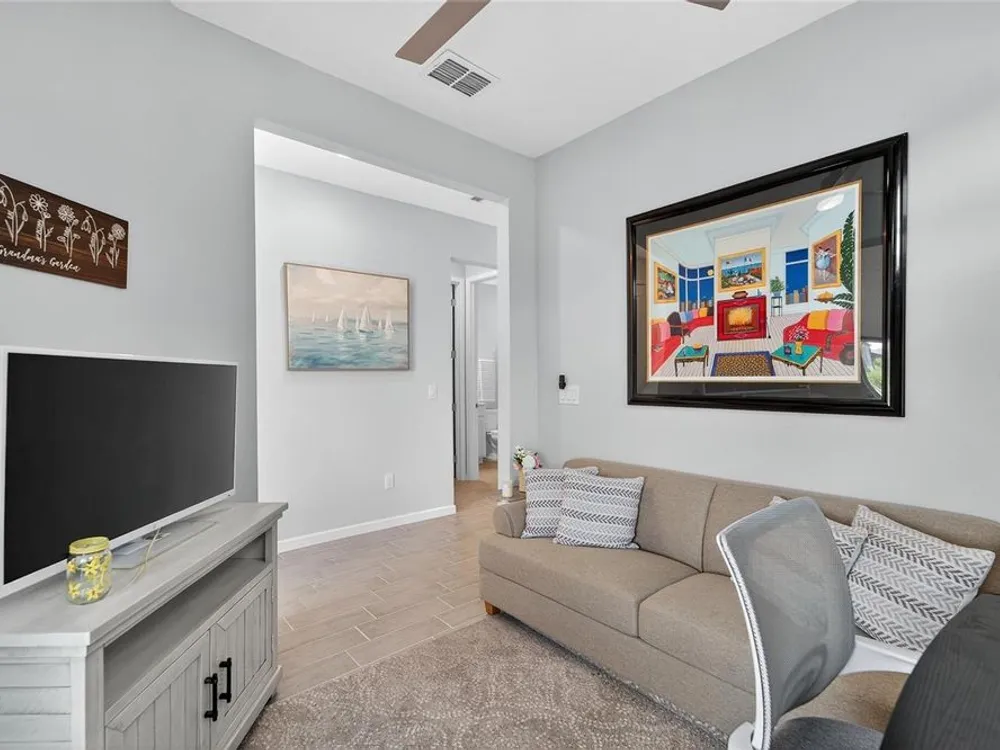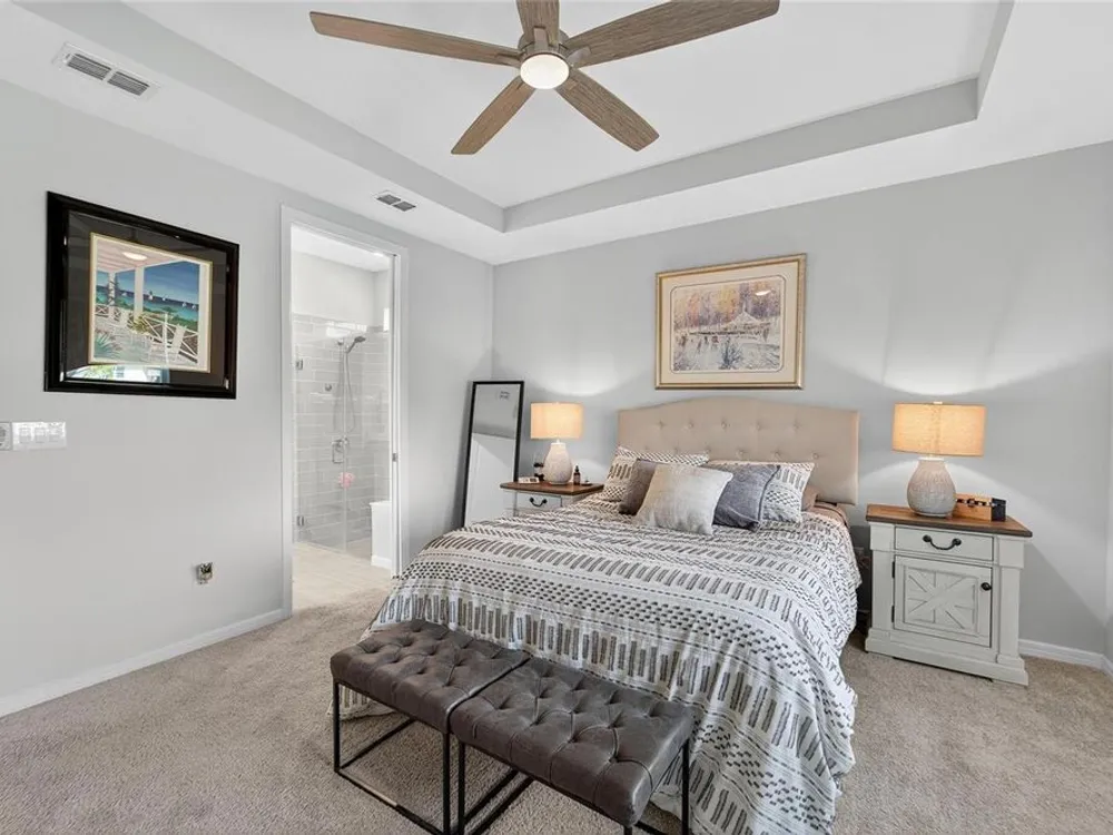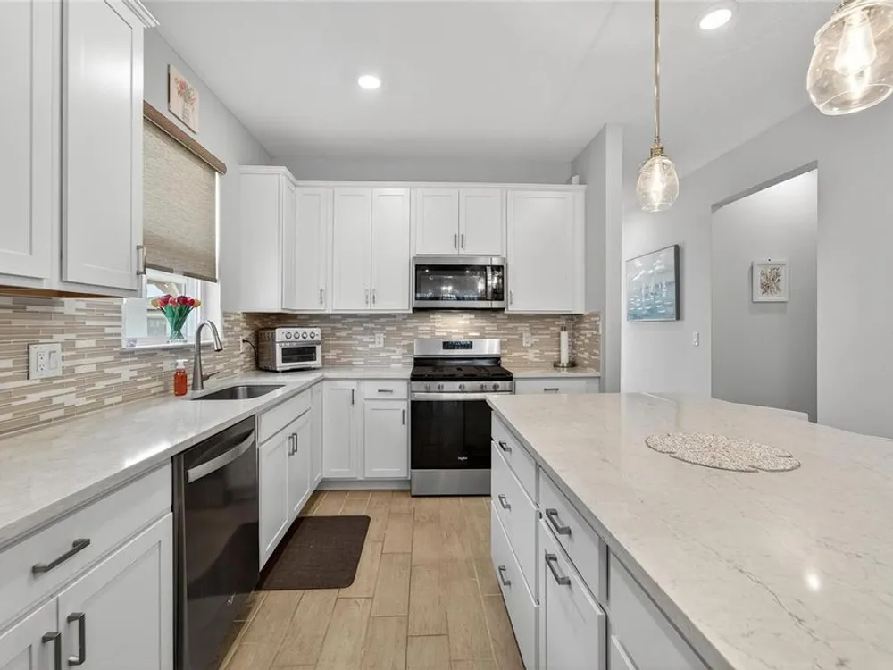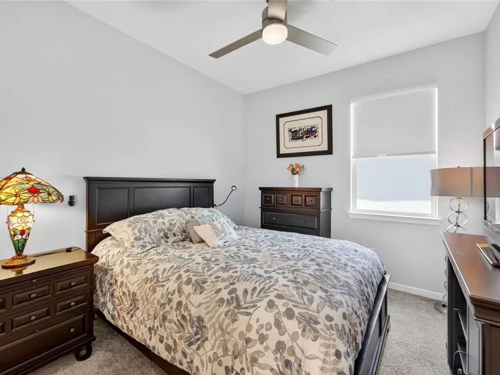 Scenic POND VIEW! Welcome to this charming 2 bed + Den - 2 bath - 2 car home thoughtfully designed for comfort and style. Located in the vibrant 55+ active adult community of Del Webb Bexley, truly a place you’ll be proud to call “Home.” Step inside through the Decorative Glass front door gleaming natural light that fills the OPEN LAYOUT highlighting the 9 foot 4 inch tall ceilings and 8 foot tall doors. Modern style of continuous ceramic tile throughout the main living areas with plush upgraded carpet in both bedrooms, creating a warm and inviting atmosphere. Contemporary Chef’s dream of a kitchen boasts: 42 inch WHITE CUSTOM CABINETS with decorative molding, QUARTZ counters, designer wall tile backsplash and a full suite of stainless steel appliances—including a French door refrigerator. Gleaming accents of satin nickel cabinet hardware along with the high arced faucet at the large single-sink add beauty and functionality. Host memorable dinners in the open dining area or step outside to the screened-in patio, where you can relax and entertain while enjoying peaceful views of the pond. Primary Suite with SPA INSPIRED Bathroom features walk-in shower with built-in bench, dual sinks, large walk in closet and a private water closet. The secondary bedroom is thoughtfully positioned at the front of the home, ensuring privacy for both you and your guests. Enjoy quiet time at home in the flex space to read, work on crafts, play games or use as a productive workspace. Additional highlights include an indoor laundry room complete with washer & dryer. Bonus: you'll have peace of mind knowing that your new home comes with hurricane shutters. The low monthly HOA fee gives you access to the 19,000 sq. ft. clubhouse with a fitness center, bistro, ballroom, multi-purpose room, clubs and planned activities. Outdoor amenities include a zero entry heated pool, resistance pool, pickle ball courts, bocce ball, tennis courts, a community garden and dog park. Del Webb Bexley is located just a short distance from shopping, restaurants, Premium Outlet Mall and Tampa’s International airport.
