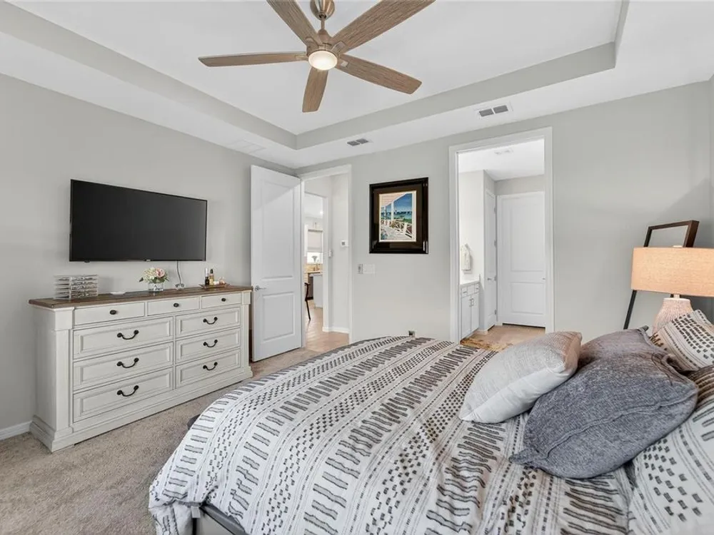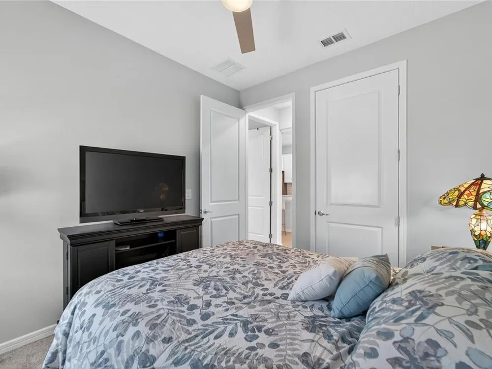 - Ceiling Fan(s), Eat-in Kitchen, High Ceilings, In-Wall Pest Control, Kitchen/Family Room Combo, Open Floorplan, Smart Home, Solid-Wood Cabinets, Split Bedrooms, Stone Counters, Thermostat, Tray Ceiling(s), Walk-In Closet(s), Window Treatments