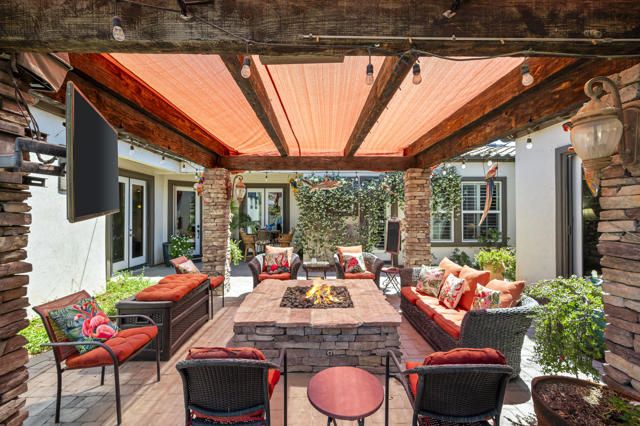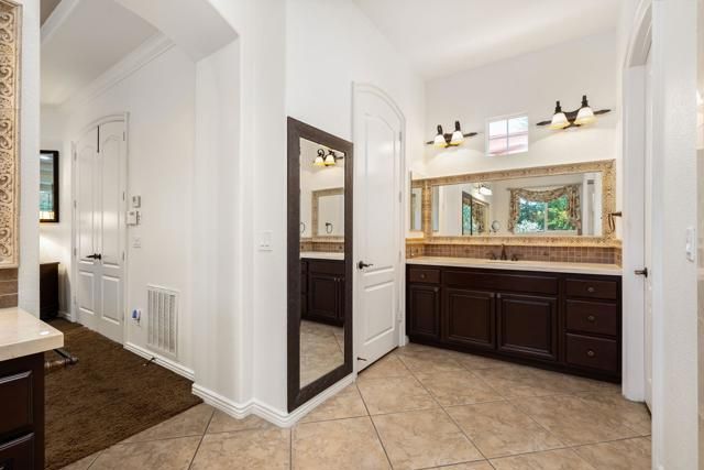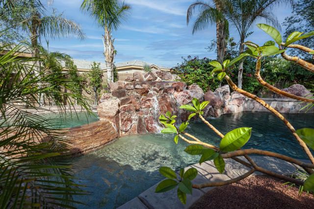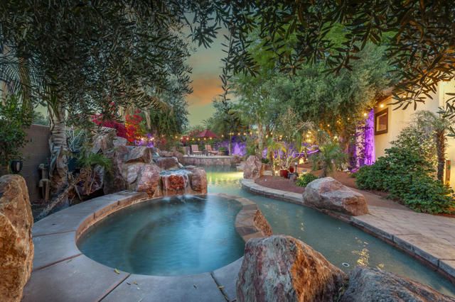 Once upon a time is the way this storied Trilogy at La Quinta property begins. An adult playground of grand scale hidden behind a tall wooden door is a home purposefully designed for the joy of living large. At 2,789 SQ FT, this rare four-bedroom, four-baths Mesquite model home with two-car and separate single car garages, has at its center a large private courtyard with separate doors to the main home, a detached Casita with kitchenette and full bath, and a separate attached Casita, also with a full bath. The exquisite primary bedroom retreat has direct access to the courtyard, and to a private covered back patio. The double-door entry, tray ceiling and room size is outstanding, but the highpoint is a sumptuous bath featuring two separate vanity stations covered in marble and each with walk-in closets, a king-size marble shower with two shower heads and bench seat, and a dreamy soaking tub. Inside, the home is open with ten-foot ceilings, crown molding and tile floors in the main living areas. The great room has custom built-ins, and TV with surround sound in the ceiling and a gas-log fireplace to curl up by while reading or binge watching your favorite shows. The kitchen is outfitted with premium stainless steel appliances, six-burner cooktop, double-oven, and dishwasher. A center island with pendant lighting, abundant cabinetry, built-in pantry and smooth granite slab countertops with stone backsplash makes cooking pure joy. Special occasions call for a formal dining room, and this one is spacious and inviting. The large office area with wine-storage is also usable as a flex space for crafts, wine-room, cafe or anything else your heart desires. The expansive courtyard has seating for large gatherings, and the beautifully crafted pergola adds a filtered cover for year-round comfort. Come fall and winter everyone will enjoy gathering around the raised gas lava-stone firepit while cheering on their favorite teams on the outdoor big screen TV. On warm days, life outside stays comfortable with a Kool Fog misting system that envelops much of the home's exterior in a fine cooling mist. Adjacent to the courtyard, surrounded by exquisite pygmy palms and tropical flora, is a spectacular resort-style Pebble-Tec salt water pool with towering rock waterfalls cascading over three-tiers into the spa and pool below. At the far end of the pool is a raised deck to relax and take in the views, or as a stage to dance the night away.