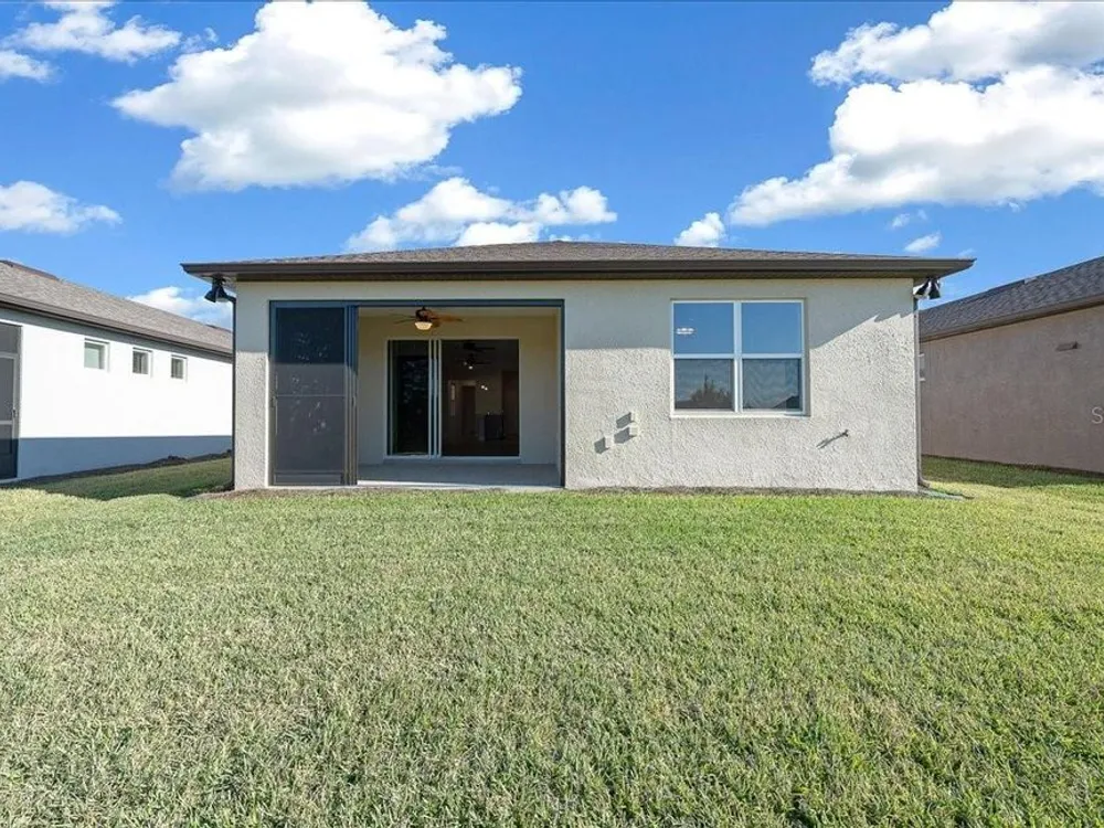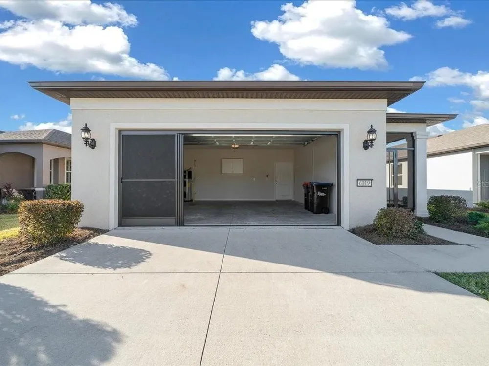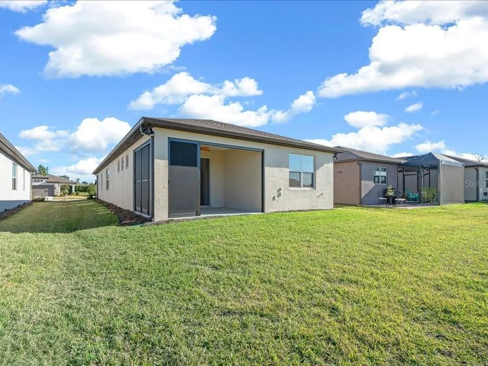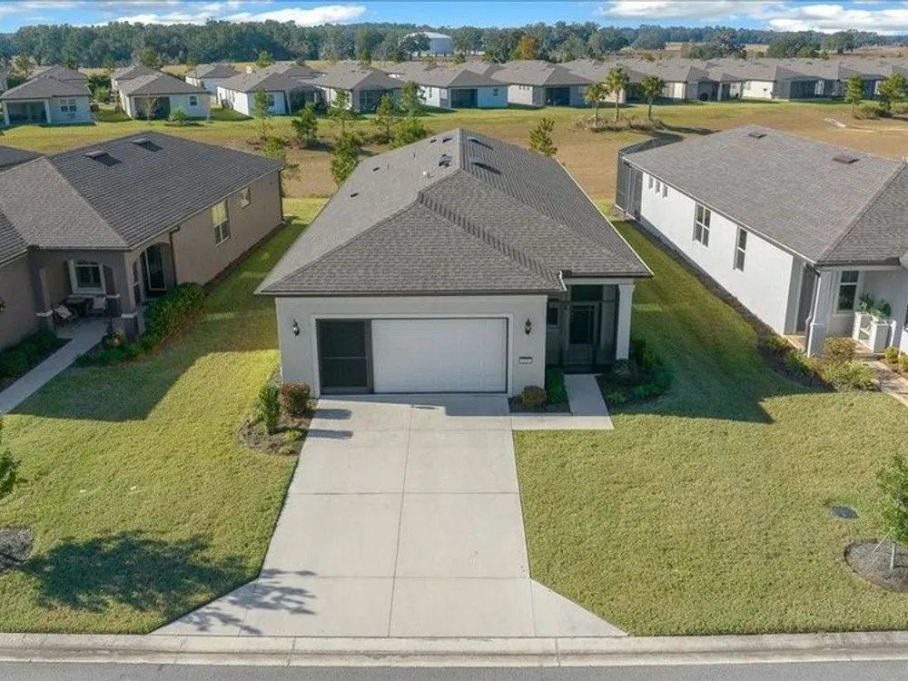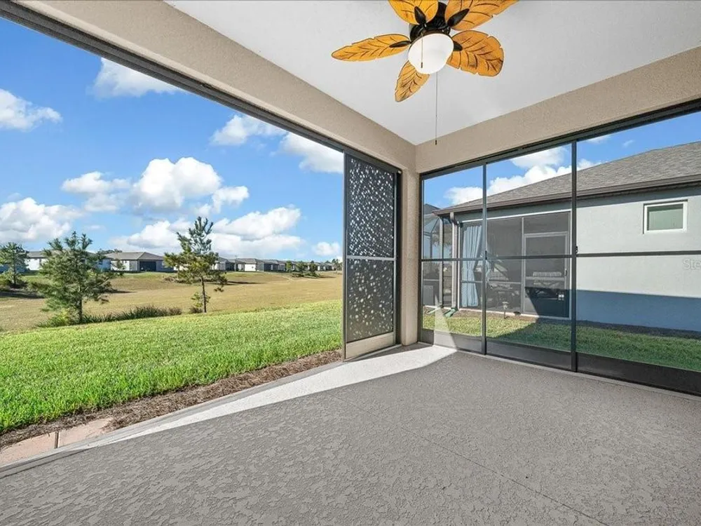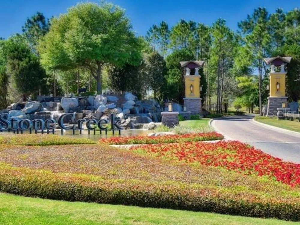 WELCOME to this 3 bedroom, 2 bathrooms, and 2 garage HALLMARK model with NO neighbors directly behind you. As you enter the home, you are greeted with a screened front entry. Entering through the front door, you will find a foyer accompanied by a coat closet. The open-concept layout fosters a warm and inviting ambiance. The kitchen is equipped with modern stainless-steel appliances, 36-inch cabinets, a quartz countertop, a garbage disposal, and a breakfast bar. A hallway leads you to the guest bedrooms, each featuring a window and closet. The guest bathroom is situated between the two bedrooms, offering generous space and privacy for visitors. The master suite is a spacious retreat, complete with an ensuite bathroom featuring a walk-in glass shower, double vanity, and walk-in closet with built in organizers. Step outside to the charming lanai, which is fitted with sliding screens, allowing you to appreciate the views of the landscaped surroundings. The indoor laundry room features a sink and storage cabinets. Additional UPGRADES of the home include 2" faux blinds, sliding screens for the garage door, a water softener, drop down stairs for attic access, ring doorbell, and ceiling fans in every room. This home is close to all the amenities. INCLUDED in your HOA Fee is the AMENTIES, Lawn, shrub and tree maintenance, Irrigation water, irrigation system maintenance and repairs. Del Webb Stone Creek is an active 55 plus community which offers a fitness center, spa, basketball, dog park, pickle ball, softball, tennis, heated resort-style pool, walking & bike paths, catch & release fishing pier. For additional fees a golf course, grille and cafe' is on site. Don't miss out on the opportunity to own this stunning home, schedule your showing today!