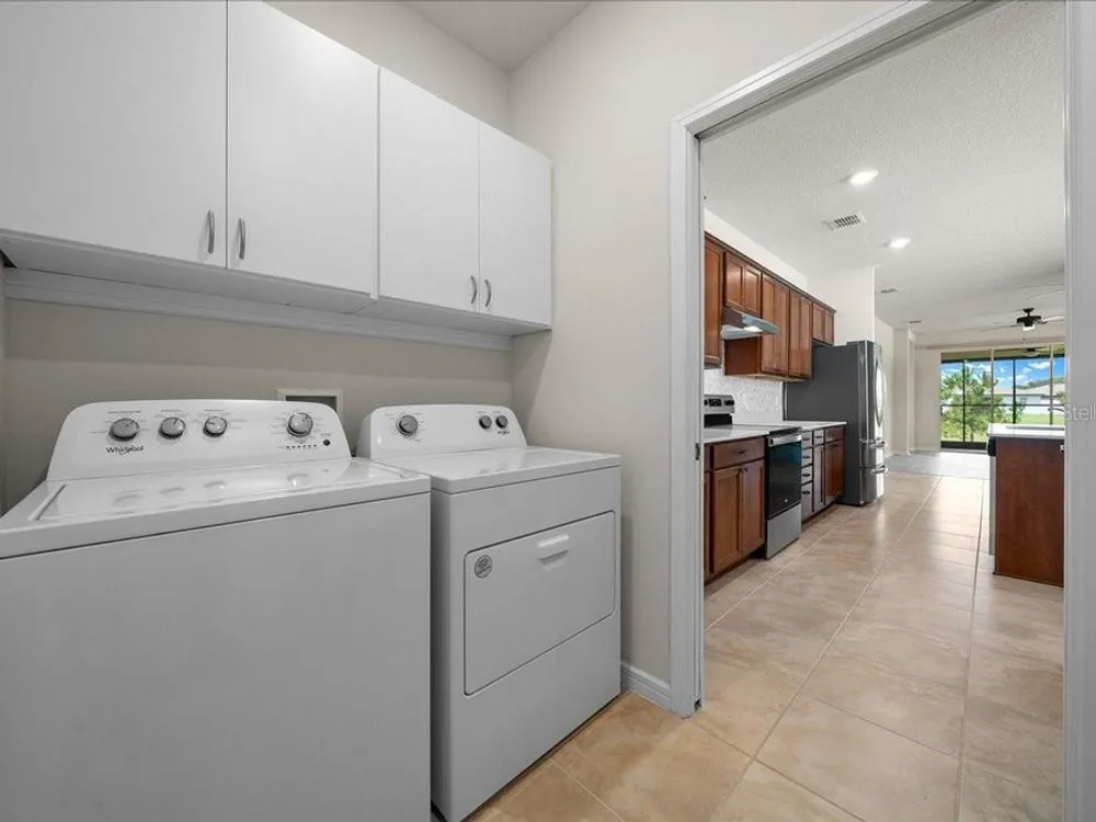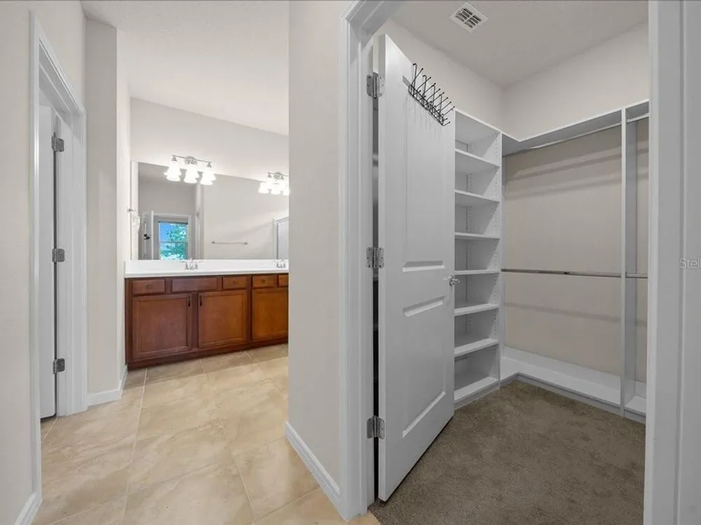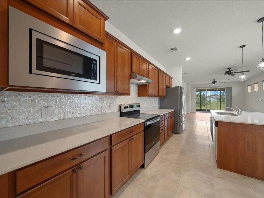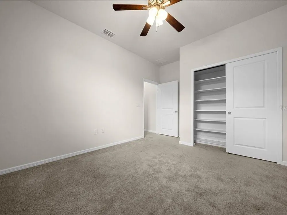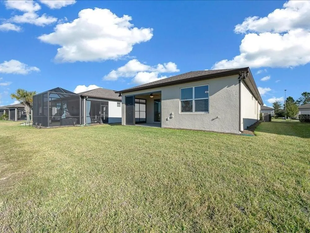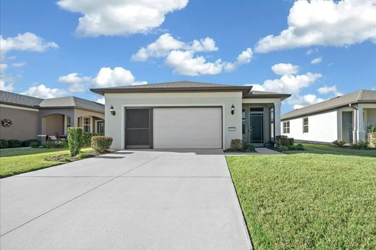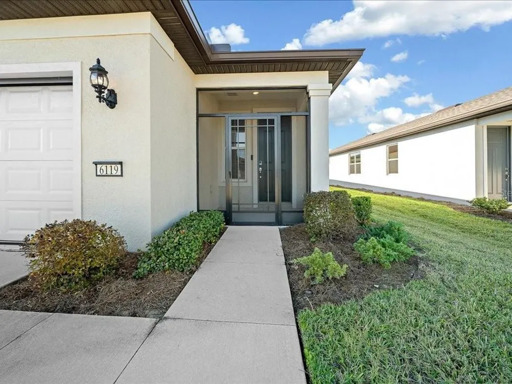 WELCOME to this 3 bedroom, 2 bathrooms, and 2 garage HALLMARK model with NO neighbors directly behind you. As you enter the home, you are greeted with a screened front entry. Entering through the front door, you will find a foyer accompanied by a coat closet. The open-concept layout fosters a warm and inviting ambiance. The kitchen is equipped with modern stainless-steel appliances, 36-inch cabinets, a quartz countertop, a garbage disposal, and a breakfast bar. A hallway leads you to the guest bedrooms, each featuring a window and closet. The guest bathroom is situated between the two bedrooms, offering generous space and privacy for visitors. The master suite is a spacious retreat, complete with an ensuite bathroom featuring a walk-in glass shower, double vanity, and walk-in closet with built in organizers. Step outside to the charming lanai, which is fitted with sliding screens, allowing you to appreciate the views of the landscaped surroundings. The indoor laundry room features a sink and storage cabinets. Additional UPGRADES of the home include 2" faux blinds, sliding screens for the garage door, a water softener, drop down stairs for attic access, ring doorbell, and ceiling fans in every room. This home is close to all the amenities. INCLUDED in your HOA Fee is the AMENTIES, Lawn, shrub and tree maintenance, Irrigation water, irrigation system maintenance and repairs. Del Webb Stone Creek is an active 55 plus community which offers a fitness center, spa, basketball, dog park, pickle ball, softball, tennis, heated resort-style pool, walking & bike paths, catch & release fishing pier. For additional fees a golf course, grille and cafe' is on site. Don't miss out on the opportunity to own this stunning home, schedule your showing today!