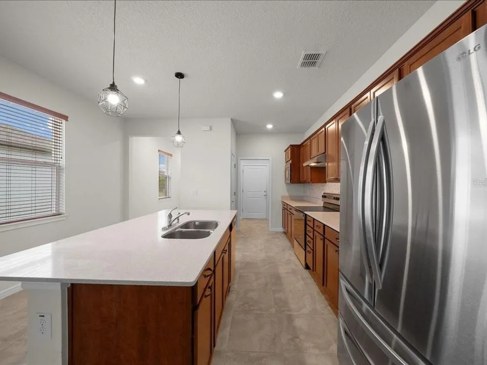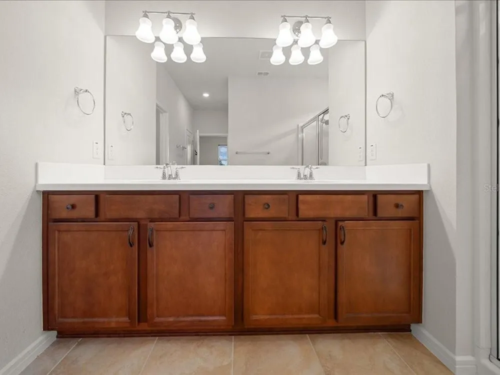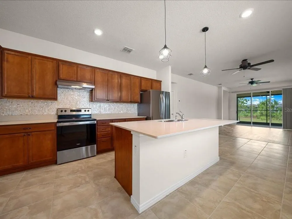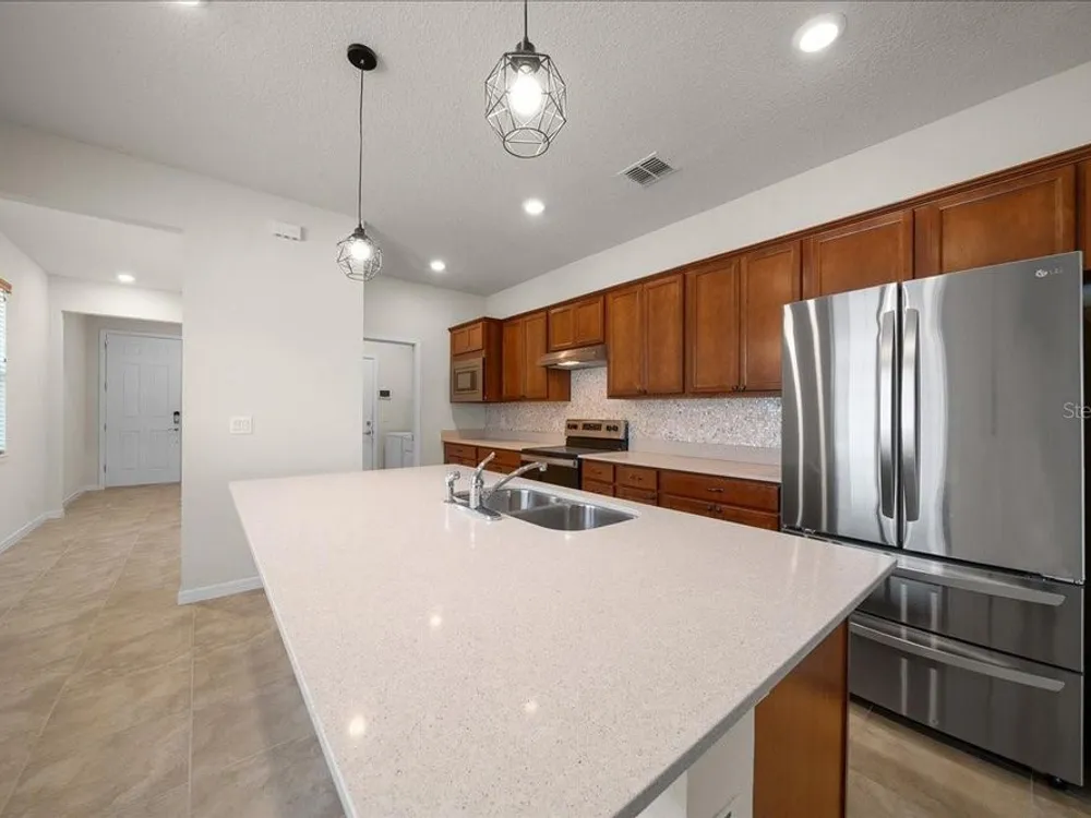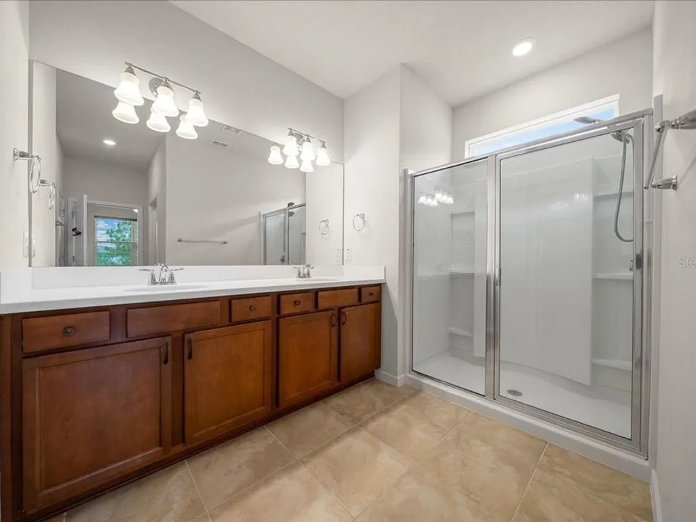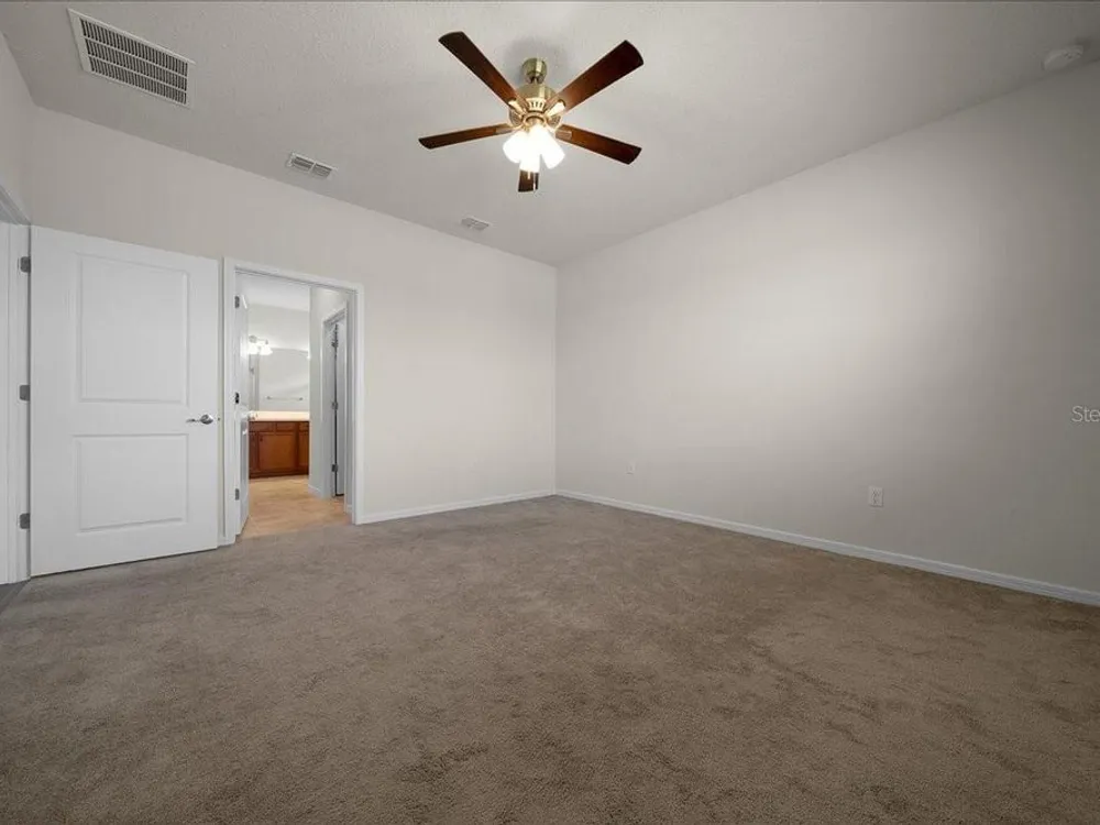 WELCOME to this 3 bedroom, 2 bathrooms, and 2 garage HALLMARK model with NO neighbors directly behind you. As you enter the home, you are greeted with a screened front entry. Entering through the front door, you will find a foyer accompanied by a coat closet. The open-concept layout fosters a warm and inviting ambiance. The kitchen is equipped with modern stainless-steel appliances, 36-inch cabinets, a quartz countertop, a garbage disposal, and a breakfast bar. A hallway leads you to the guest bedrooms, each featuring a window and closet. The guest bathroom is situated between the two bedrooms, offering generous space and privacy for visitors. The master suite is a spacious retreat, complete with an ensuite bathroom featuring a walk-in glass shower, double vanity, and walk-in closet with built in organizers. Step outside to the charming lanai, which is fitted with sliding screens, allowing you to appreciate the views of the landscaped surroundings. The indoor laundry room features a sink and storage cabinets. Additional UPGRADES of the home include 2" faux blinds, sliding screens for the garage door, a water softener, drop down stairs for attic access, ring doorbell, and ceiling fans in every room. This home is close to all the amenities. INCLUDED in your HOA Fee is the AMENTIES, Lawn, shrub and tree maintenance, Irrigation water, irrigation system maintenance and repairs. Del Webb Stone Creek is an active 55 plus community which offers a fitness center, spa, basketball, dog park, pickle ball, softball, tennis, heated resort-style pool, walking & bike paths, catch & release fishing pier. For additional fees a golf course, grille and cafe' is on site. Don't miss out on the opportunity to own this stunning home, schedule your showing today!