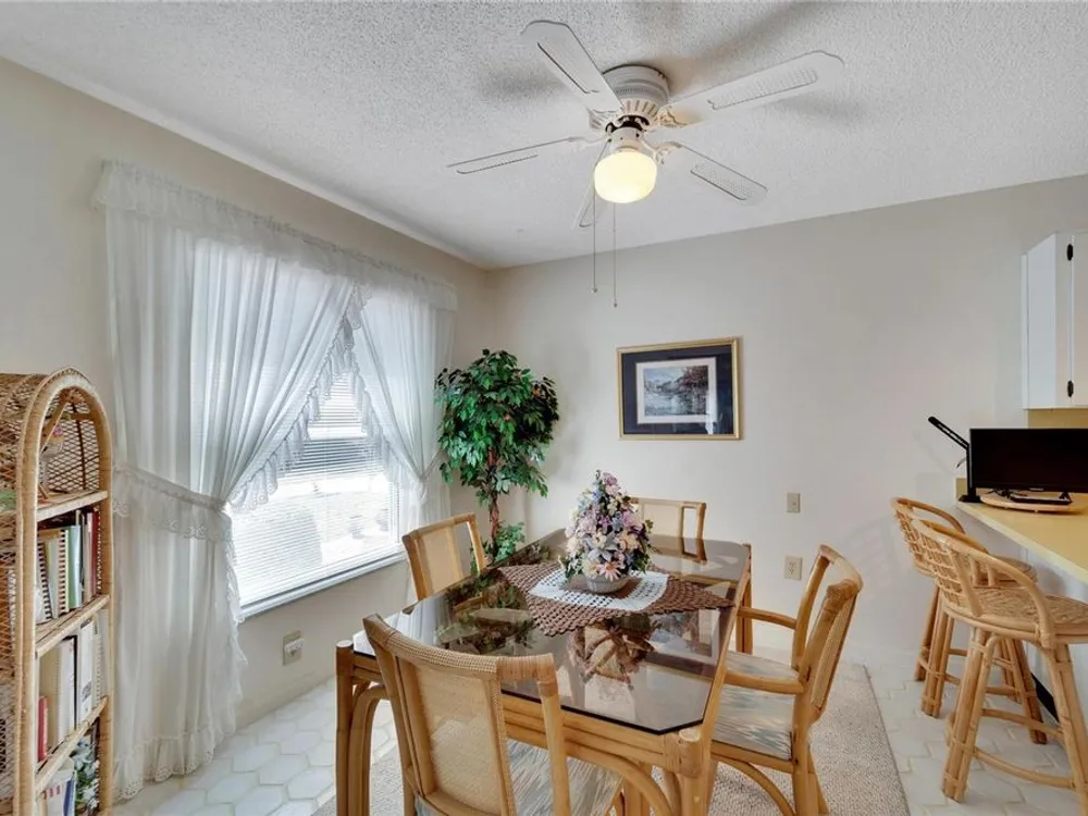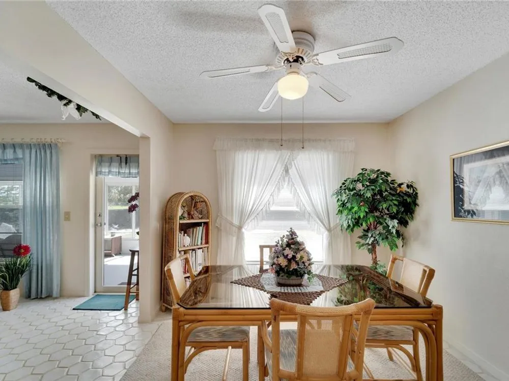 - Ceiling Fan(s), Eat-in Kitchen, Kitchen/Family Room Combo, L-Shaped Dining Room, Living/Dining Room, Open Floorplan, Main Level Primary, Window Treatments